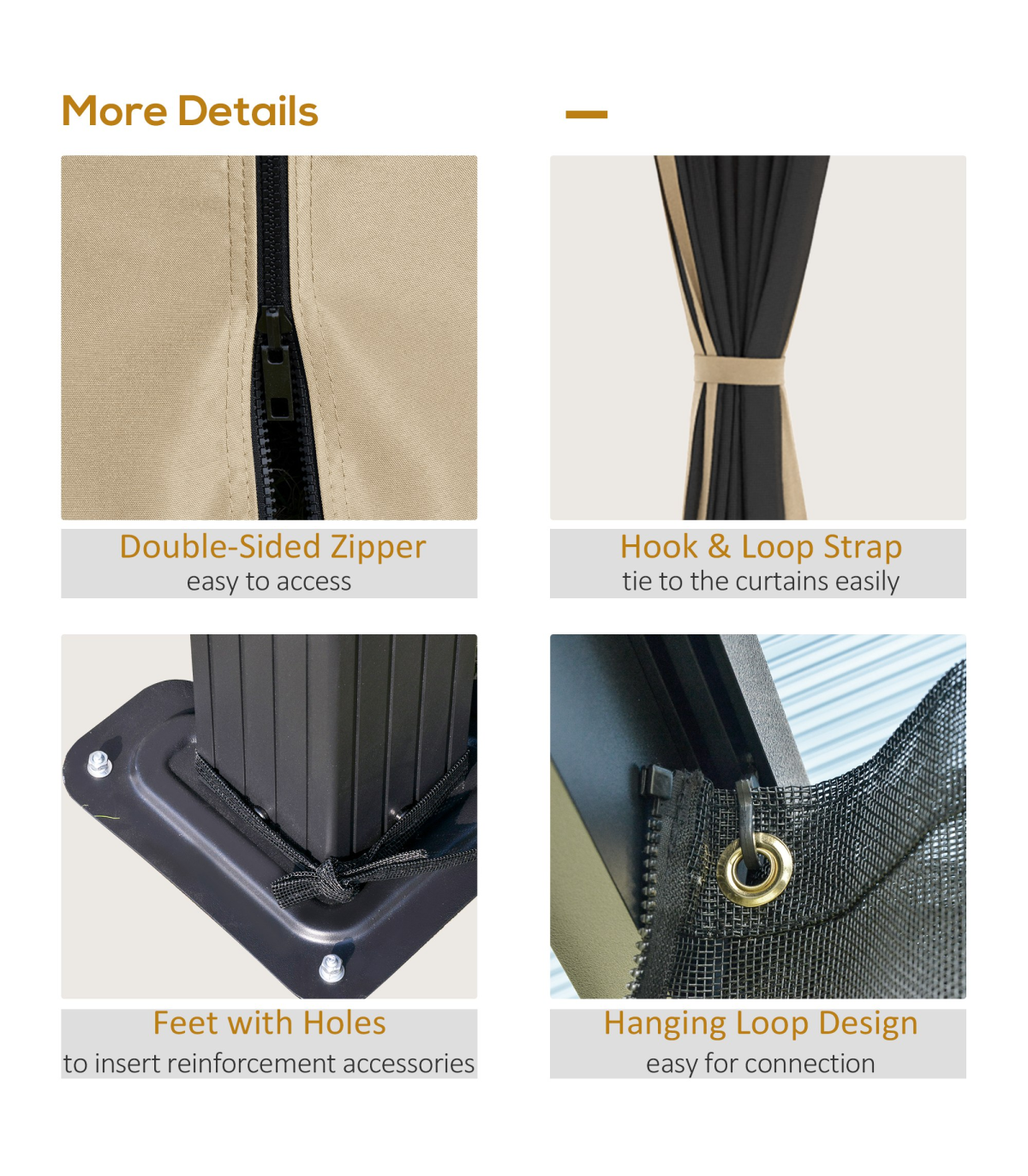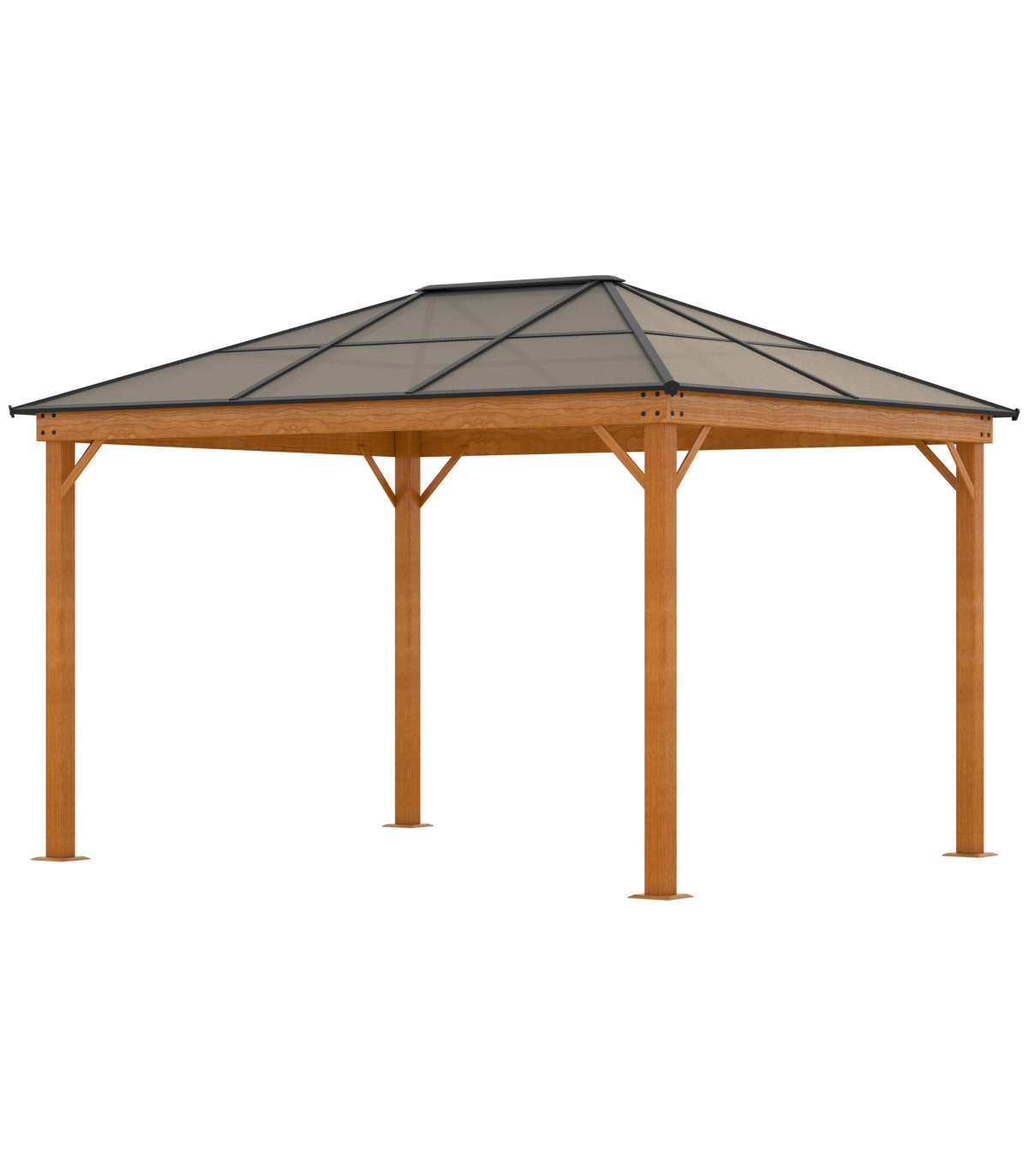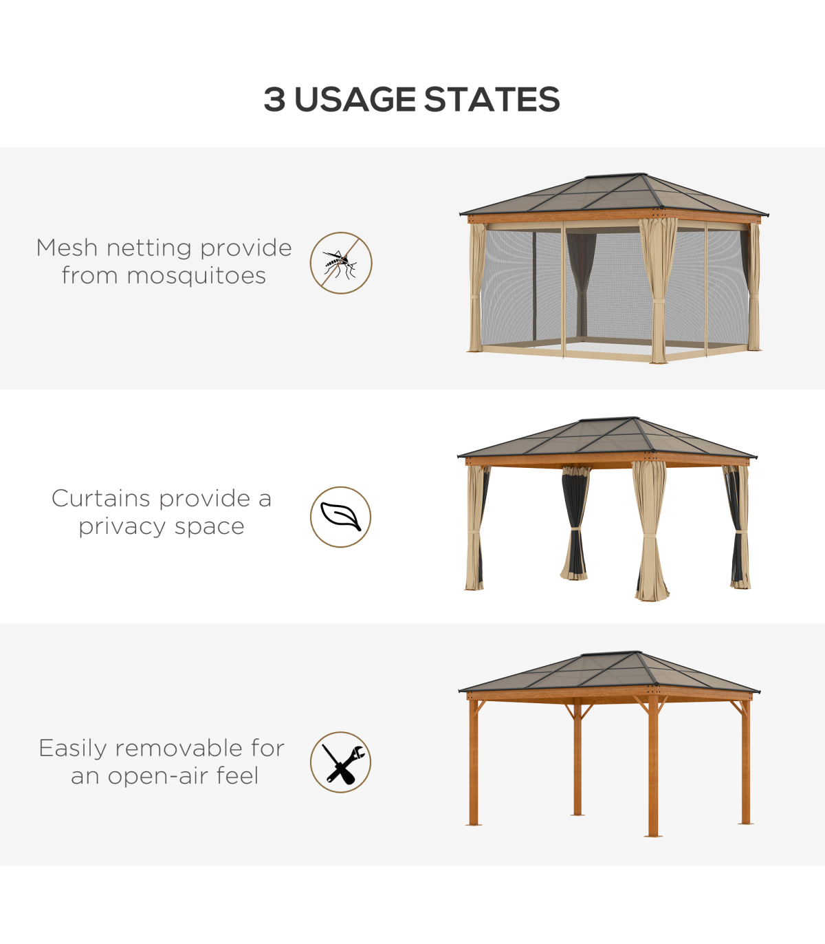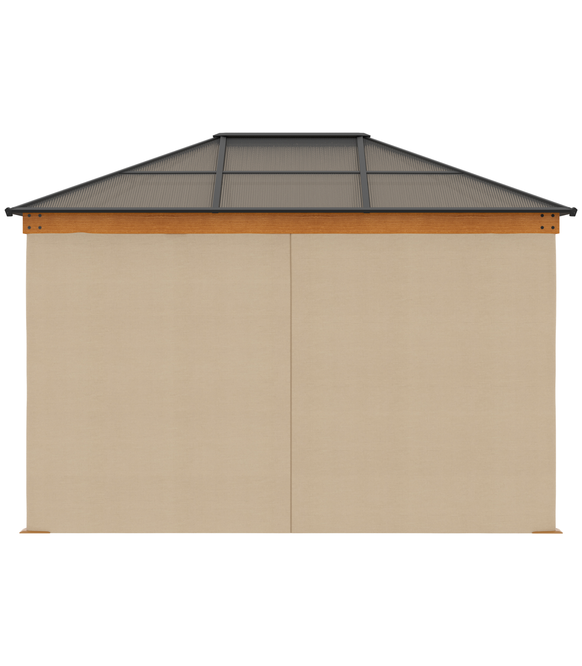 Hard top gazebo design: Polycarbonate roof for a strong top, which protects underneath from rain, snow and direct sun.Eight curtains, with netting: This gazebo with netting can easily create privacy, whenever you want. Removable netting to keep bugs and insects outside. Both layers can be tied to the frame easily.3 x 3.6m hardtop gazebo size: A large size, open inside - this garden gazebo is the perfect place for having outside parties, gatherings, BBQs - and so much more.Aluminium and steel blend frame: A strong core for this polycarbonate gazebo, it stands steadily in place. 16 ground nails and 16 expansion screws to secure to the ground.Dimensions: 267H x 296L x 360Wcm, Eaves: 207Hcm. Assembly required. Do not leave standing in heavy weather conditions.