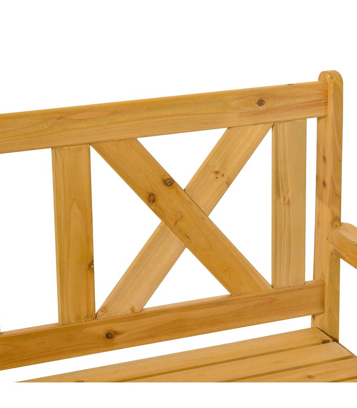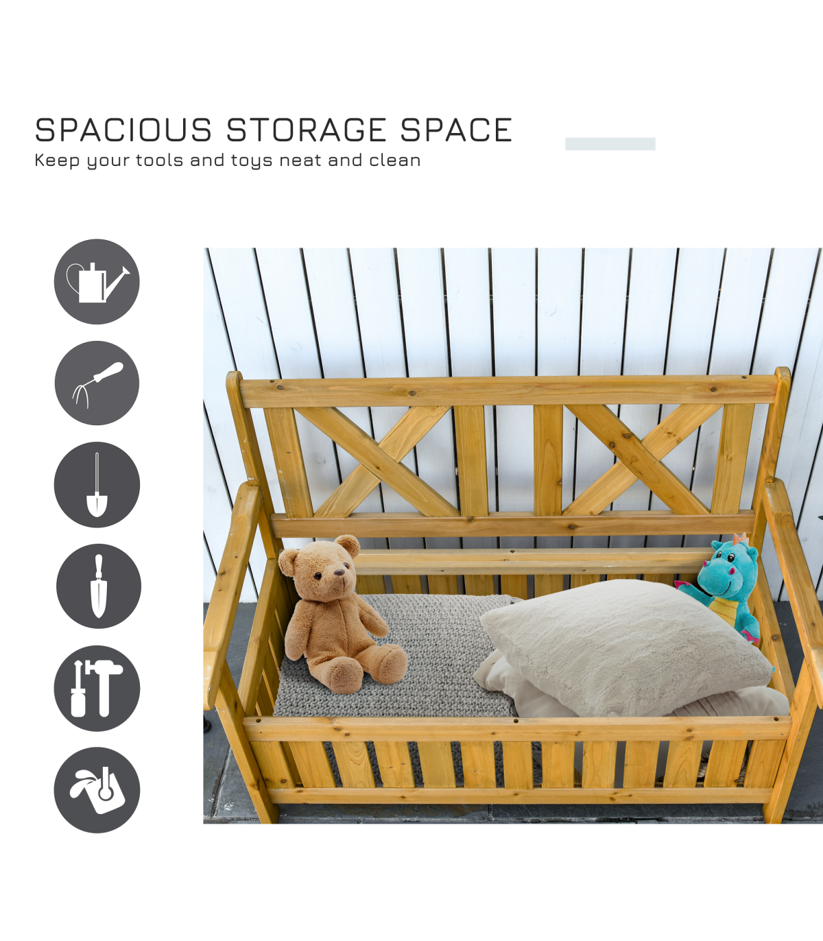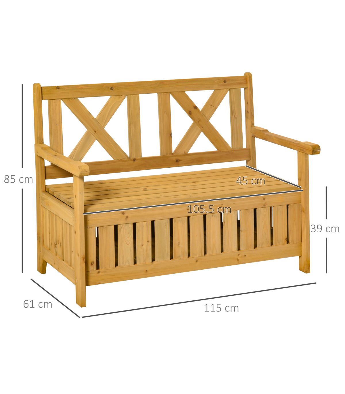 LARGE STORAGE: Located under the seat, it's easy to access and keep toys, garden accessories, small furniture bits and more safely together. Cut-out panels keeps inside fresh and aerated.TWO-SEATER: Spacious size gives room for two people to sit and relax together - a great way to relax outdoors with some company.SOLID WOOD: Fir wood structure, with a weather-resistant finish for extended strength and protection.SUPPORTIVE: High back and armrests work with your body shape. DIMENSIONS: 85H x 115L x 61Wcm. Storage: 24H x 106L x 43.5Wcm.MAXIMUM LOAD 160KG. ASSEMBLY REQUIRED.