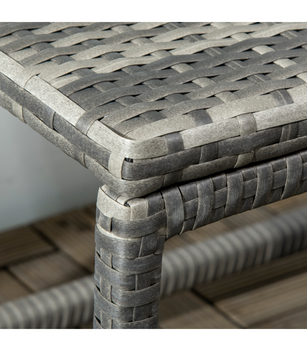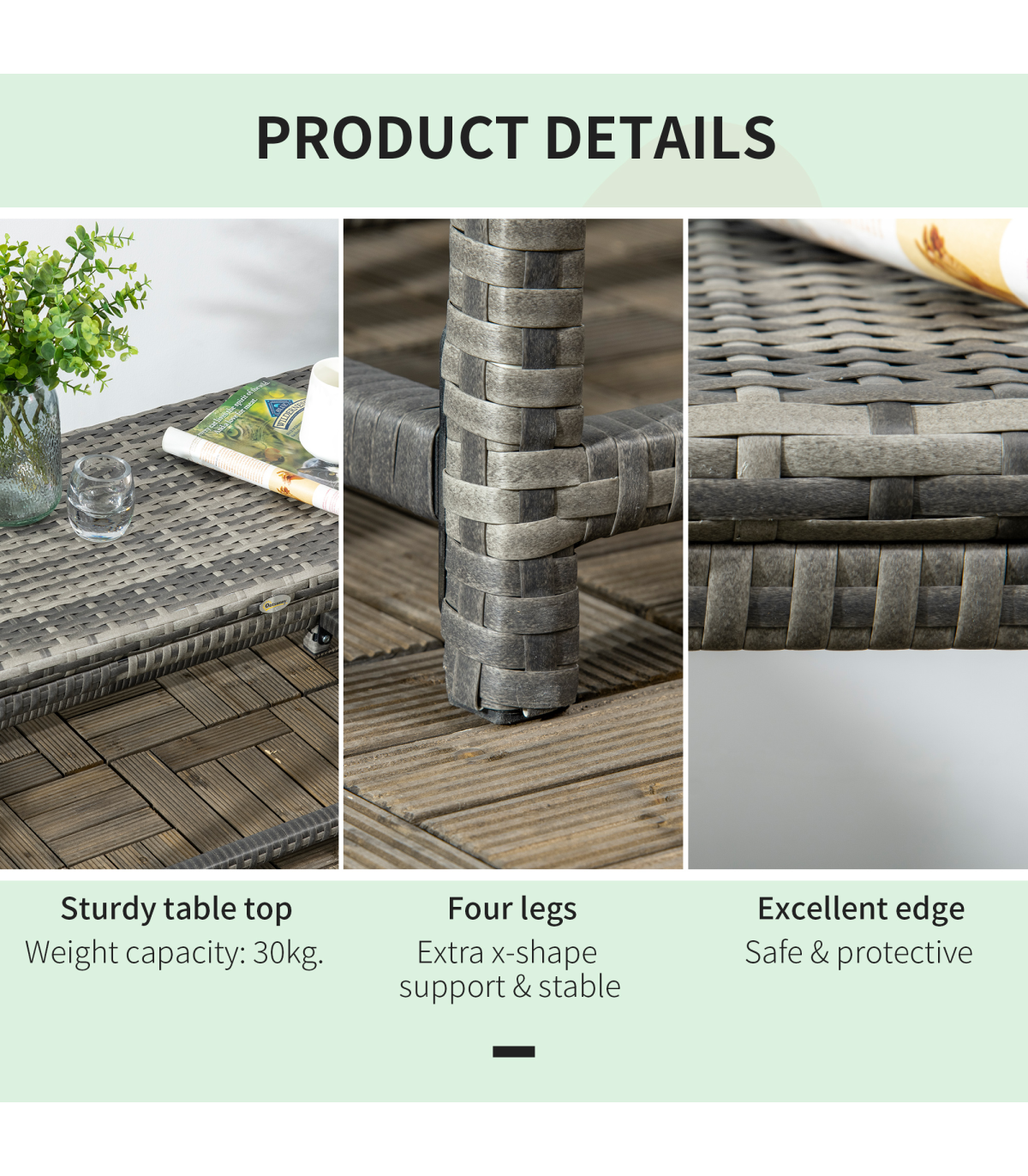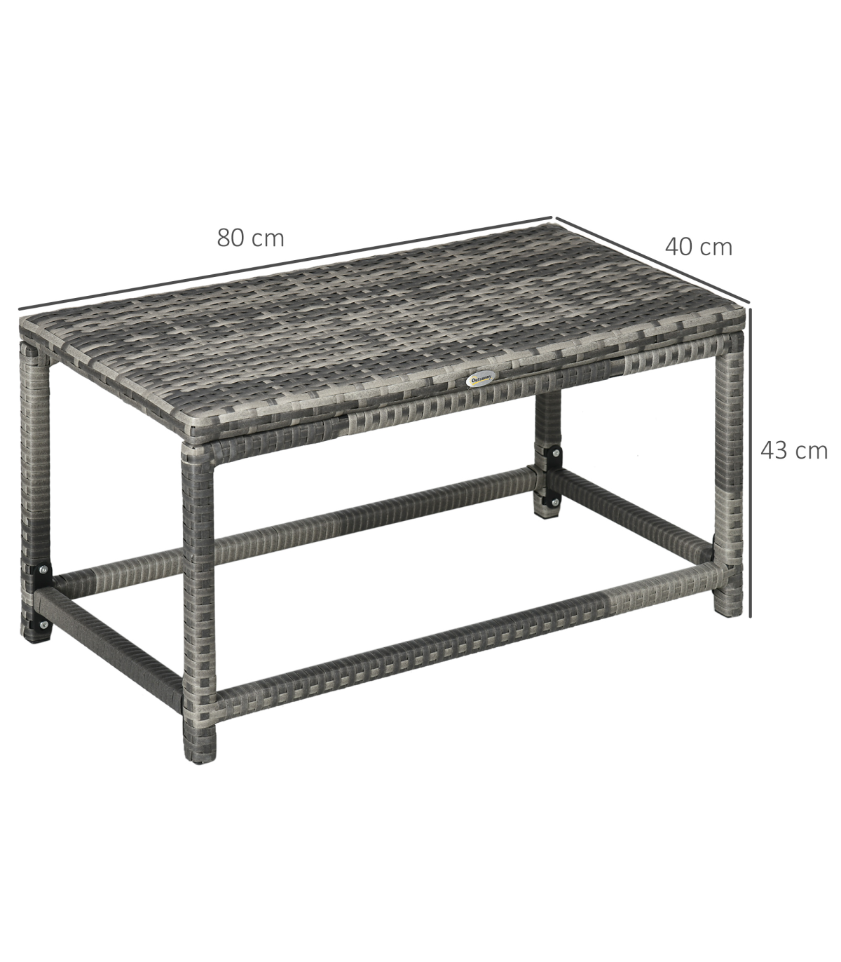 Simple rattan side table: Somewhere for your garden and outdoor areas. This rattan outdoor table gives a handy holding spot close by.Steel frame, rattan top: Powder coated metal for a strong structure. Plastic wicker top is durable - adds to the style of this garden side table.Spacious table top: Outdoor coffee table has a good amount of room for holding what you want to have close by - now moving once you're settled in.Four legs, with support: Balanced table, with support frame for extra support. Keeps the table stable.Dimensions: 43H x 80L x 40Wcm. Maximum load 30kg. Assembly required.