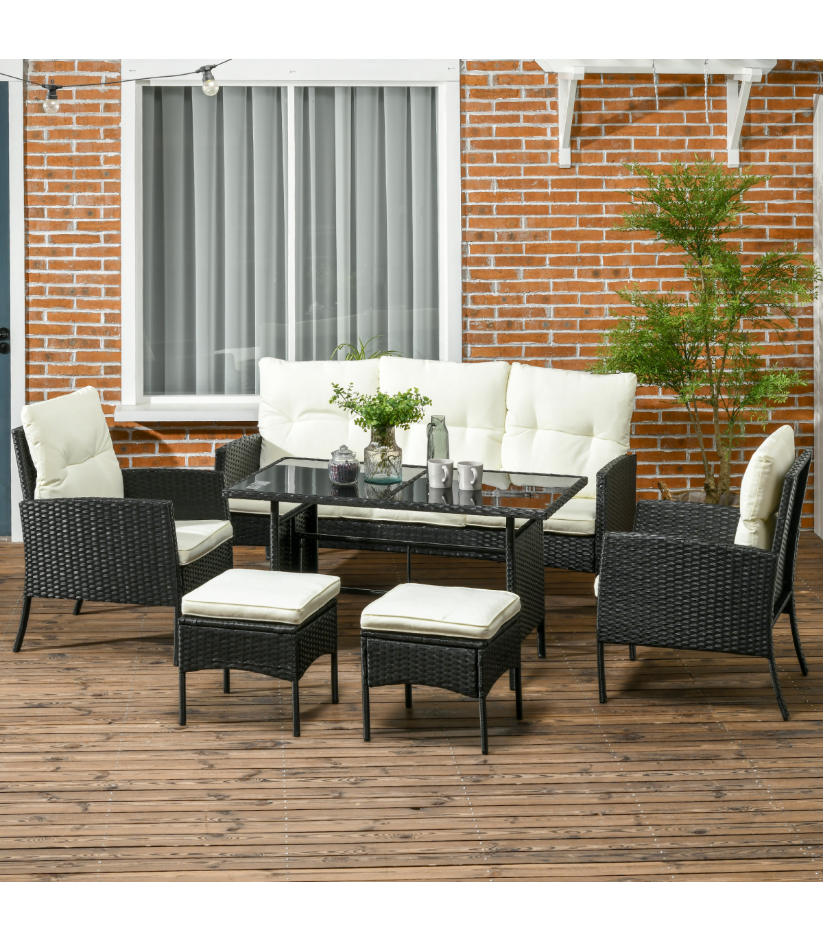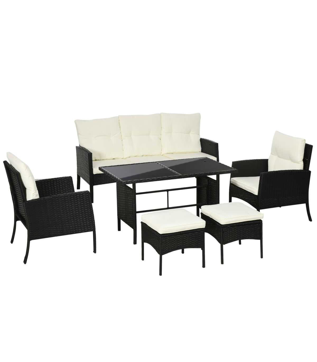 Six-piece set: Rattan furniture set includes two armchairs, two footstools, a three-seater sofa and a matching coffee table. Separate pieces to set up how you want.Padded seat and back cushions: Comes on all the seats of this garden sofa set, keeps you comfortable. Seat cushion covers are removable and washable.Steel, wrapped in rattan: Powder coated metal means each piece in this garden sofa set is strong, with the outdoor furniture wrapped in plastic wicker for double the durability with a stylish garden look.Glass-top dining table: A matching design for this rattan garden furniture set, with a sleek touch. A centrepiece for everyone to socialise together.Dimensions: Chair: 80H x 58W x 68Dcm. Sofa: 80H x 158W x 68Dcm. Table: 65H x 116L x 63Wcm. Stool: 35H x 40W x 40Dcm. Assembly required.
