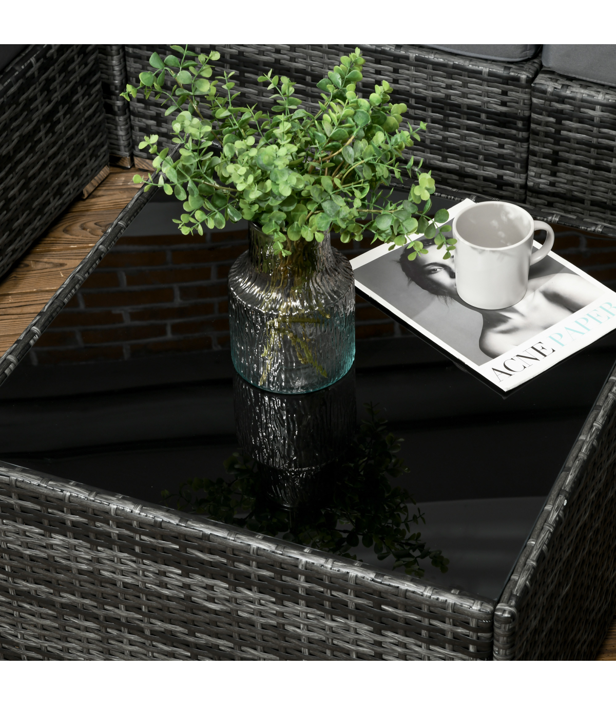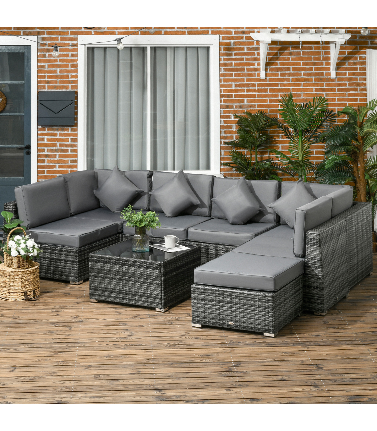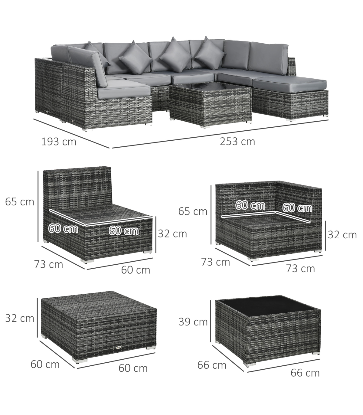 Stylish eight-piece rattan furniture set: Comes with two corner seats, four middle seats, a footstool and a coffee table. Set up in a shape how you want.Steel, wrapped in rattan: Each piece of this garden sofa set has a strong and supportive frame, covered with plastic wicker for extra durability and a stylish look. Mild weather and UV resistant.Thick cushions: Relax in complete comfort as you relax on this corner garden furniture set. Four bright coloured throw cushions included.Square glass top coffee table: A handy place to keep things near. Matches the rest of this rattan garden furniture set.Dimensions: Corner seat: 65H x 73W x 73Dcm. Middle seat: 65H x 60W x 73Dcm. Footstool: 32H x 60L x 60Wcm. Table: 39H x 66L x 66Wcm. Assembly required.