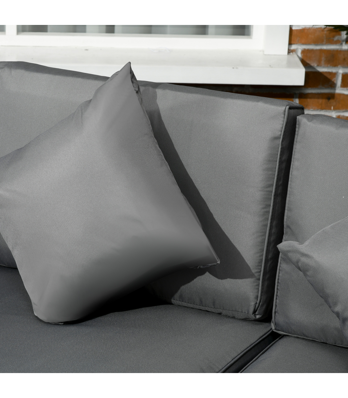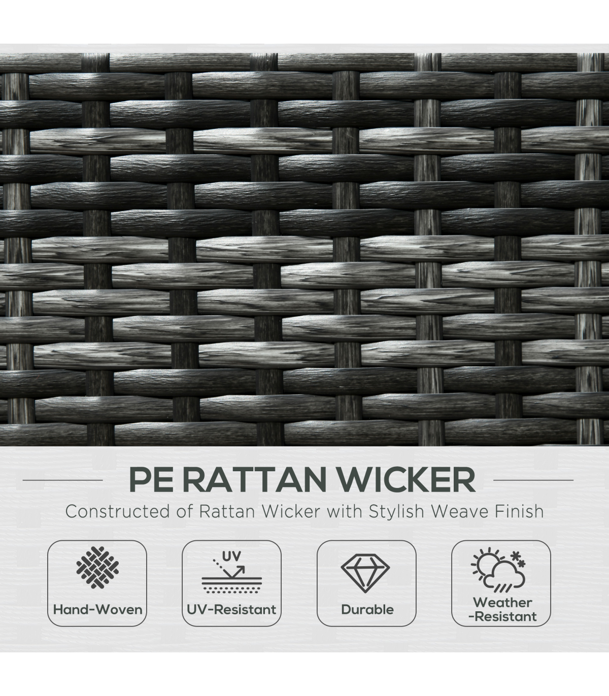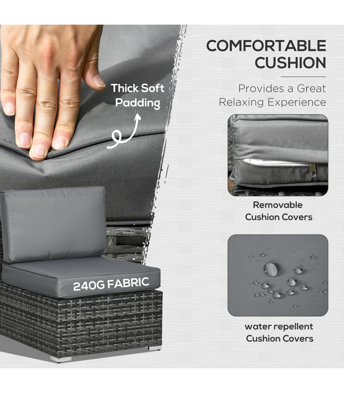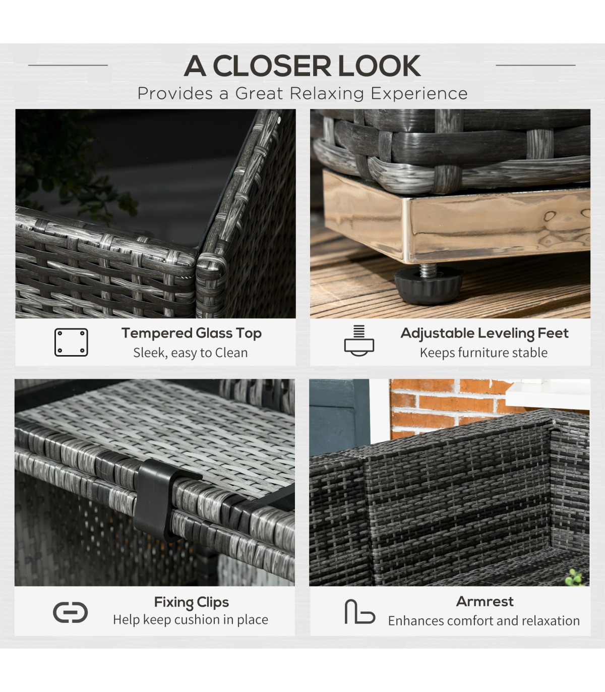 Stylish eight-piece rattan furniture set: Comes with two corner seats, four middle seats, a footstool and a coffee table. Set up in a shape how you want.Steel, wrapped in rattan: Each piece of this garden sofa set has a strong and supportive frame, covered with plastic wicker for extra durability and a stylish look. Mild weather and UV resistant.Thick cushions: Relax in complete comfort as you relax on this corner garden furniture set. Four bright coloured throw cushions included.Square glass top coffee table: A handy place to keep things near. Matches the rest of this rattan garden furniture set.Dimensions: Corner seat: 65H x 73W x 73Dcm. Middle seat: 65H x 60W x 73Dcm. Footstool: 32H x 60L x 60Wcm. Table: 39H x 66L x 66Wcm. Assembly required.