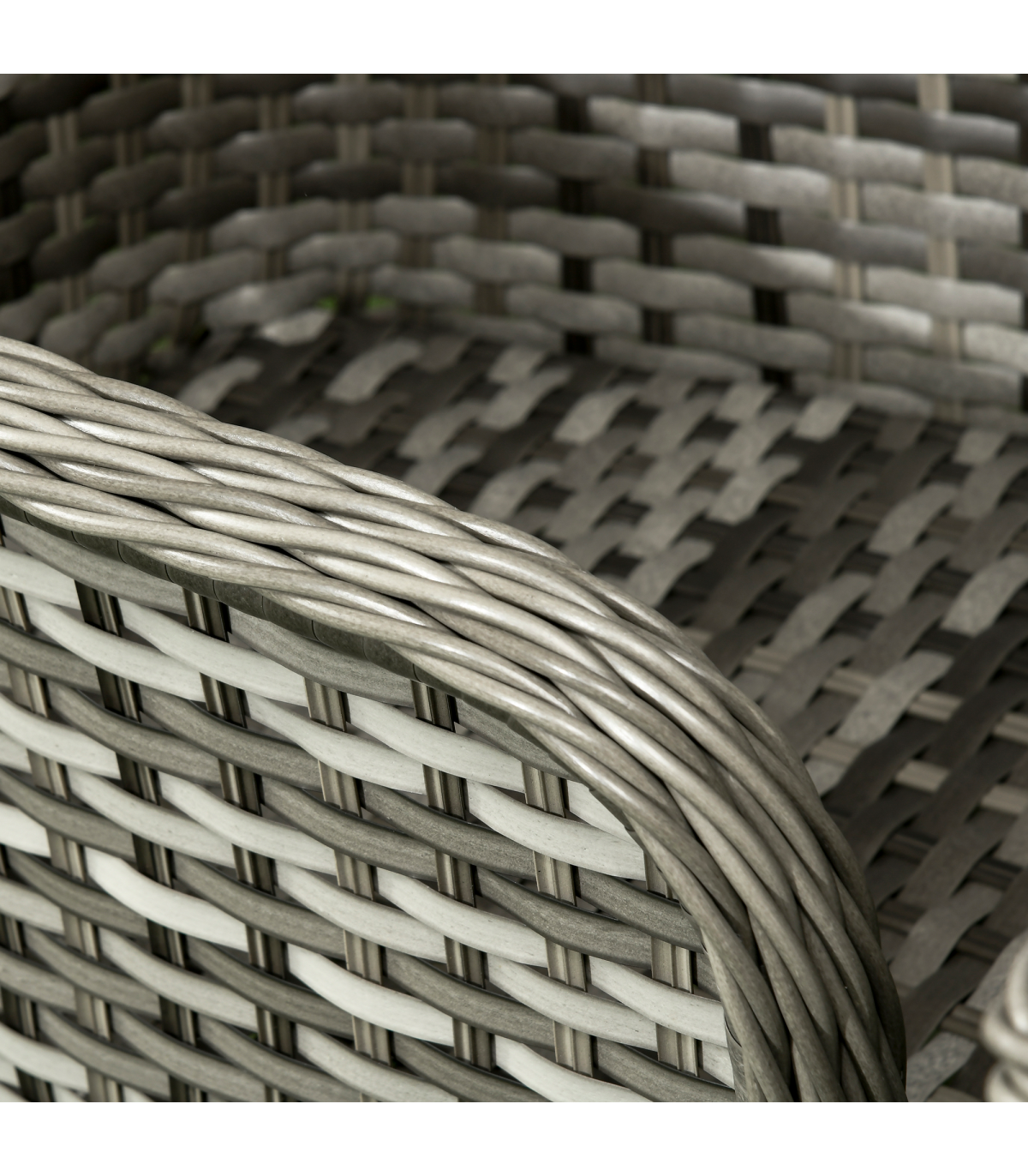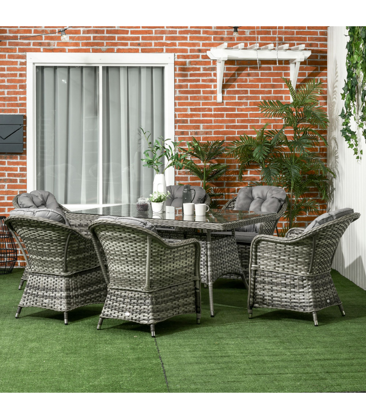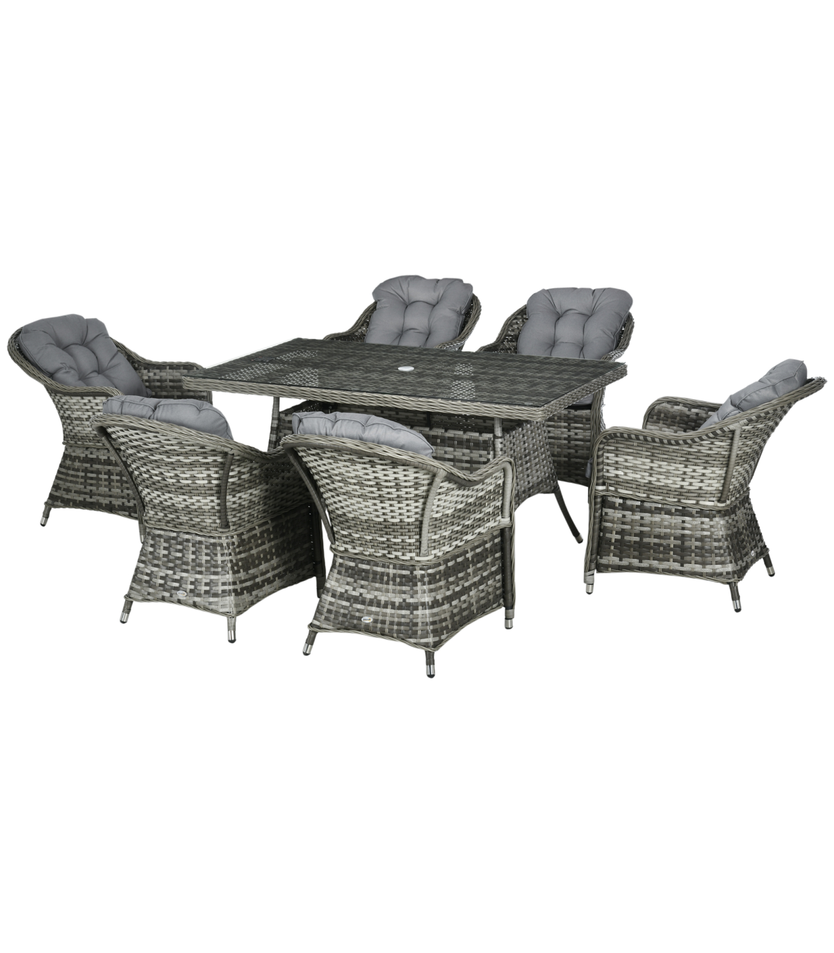 Seven-piece outdoor set: Six armchairs and a large matching table comprise the rattan cube garden furniture. Bring your family and friends together.Comfortable: This garden dining set's chairs have a high back and a wide seat with two thick cushions.Aluminium, wrapped in rattan: Each piece of this outdoor dining set is wrapped in durable and protective plastic wicker and powder coated for a stronger core.Tempered glass table top, with parasol hole:A sturdy dining surface with a dedicated space for holding a protective umbrella.Dimensions: Chair: 82H x 62W x 77Dcm. Table: 75H x 150L x 90Wcm. Assembly required.