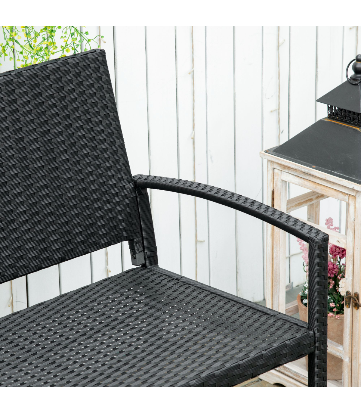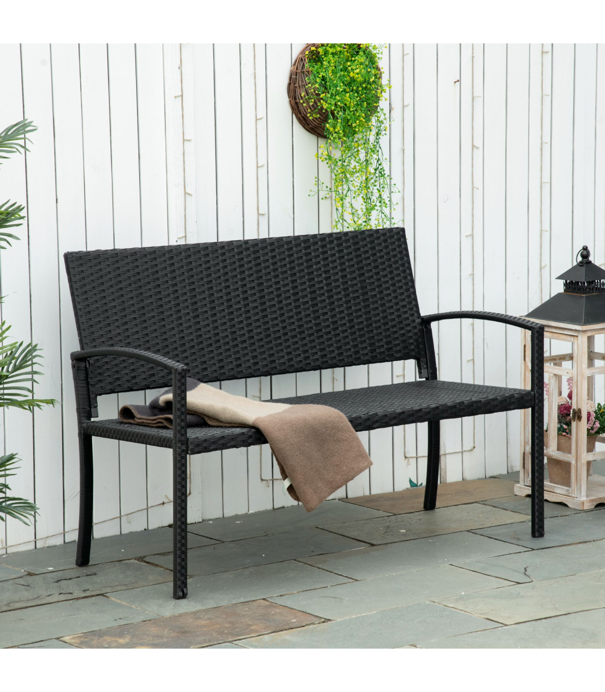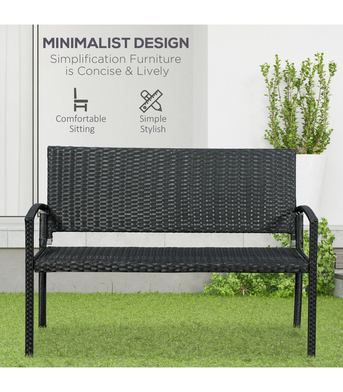 Bring a new stylish feel to your outdoors with this bench from Outsunny. It's formed of a two layer design: a metal frame for a strong structure, wrapped with PE wicker for extra protection and durability. The black colour is stylish and blends in with other garden furniture easily. The two-seater design gives room to relax with a friend, finished with a high back and armrests for support. Minimal upkeep, with maximum comfort and delight.