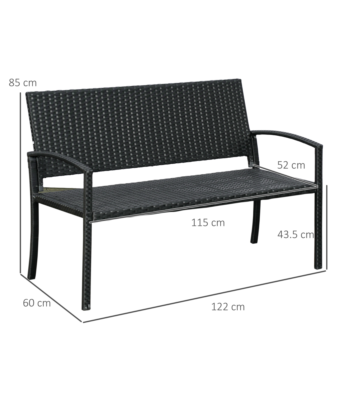 SIMPLE AND STYLISH: Black colour is welcoming and unimposing, will blend in easily with its surroundings and other outdoor furniture.METAL WRAPPED IN RATTAN: Rust-resistant frame is solid and powder coated for extra strength, with the PE wicker adding extra durability and protection against weathering.TWO-SEATER: Gives room to sit outside with a friend. Features high back and two arms for support when in use.DIMENSIONS: 122W x 60L x 87Hcm. Seat: 115W x 52Dcm.MAXIMUM LOAD 320KG. ASSEMBLY REQUIRED.