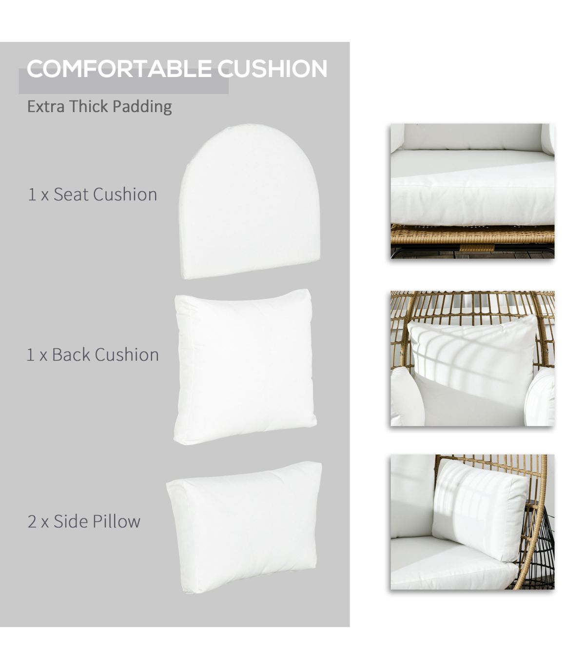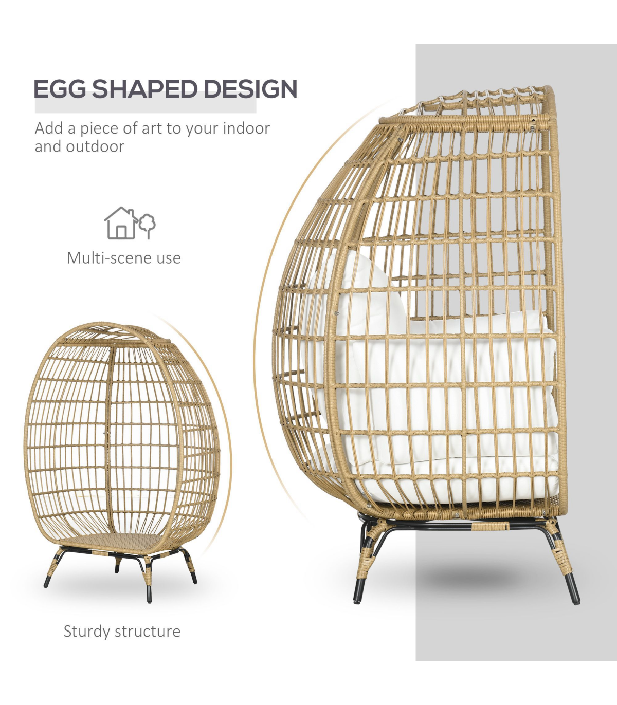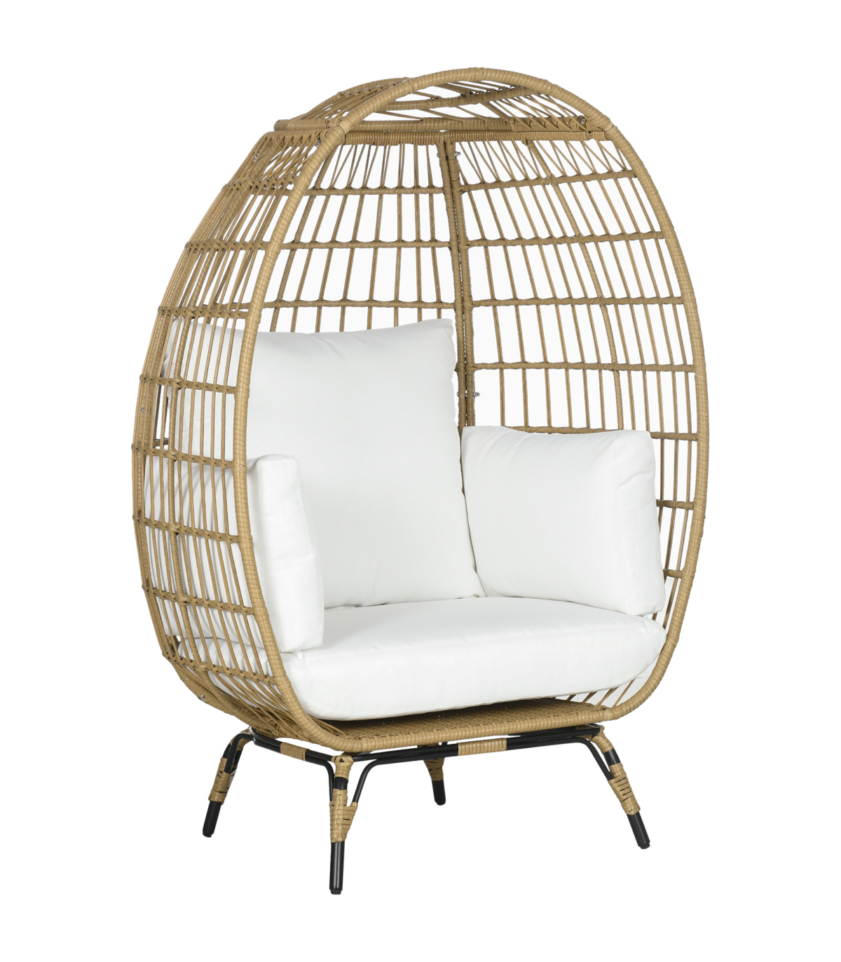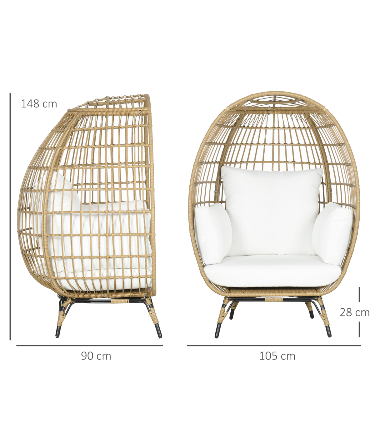 Egg shaped chair: This basket-style egg chair wraps you in a pillow, giving you a cozy cubby to lounge in. Its modern, eye-catching aesthetic makes it an excellent choice to use indoors or outdoors.Adjustable foot knobs: There are adjustable foot knobs on the legs of the wicker chair. They can be used not only to adjust the height but also to adjust the balance on slightly uneven ground.Comfortable cushion chair: Lounge the day away and enjoy the soft summer breeze in the backyard, patio, or garden. A wicker garden furniture with 12cm thickly padded cotton seat, back cushions and two side pillows that straps into place. Don't just sit, sit comfortably.Durable structure: This rattan garden sofa is made of a quality steel frame with a powder-coated finish, wrapped with mixed round and flat PE rattan wicker with a unique weave effect for superior durability and stylish.Overall dimension: 105W x 97D x 150H cm, Weight Capacity: 120kg. Assembly required.