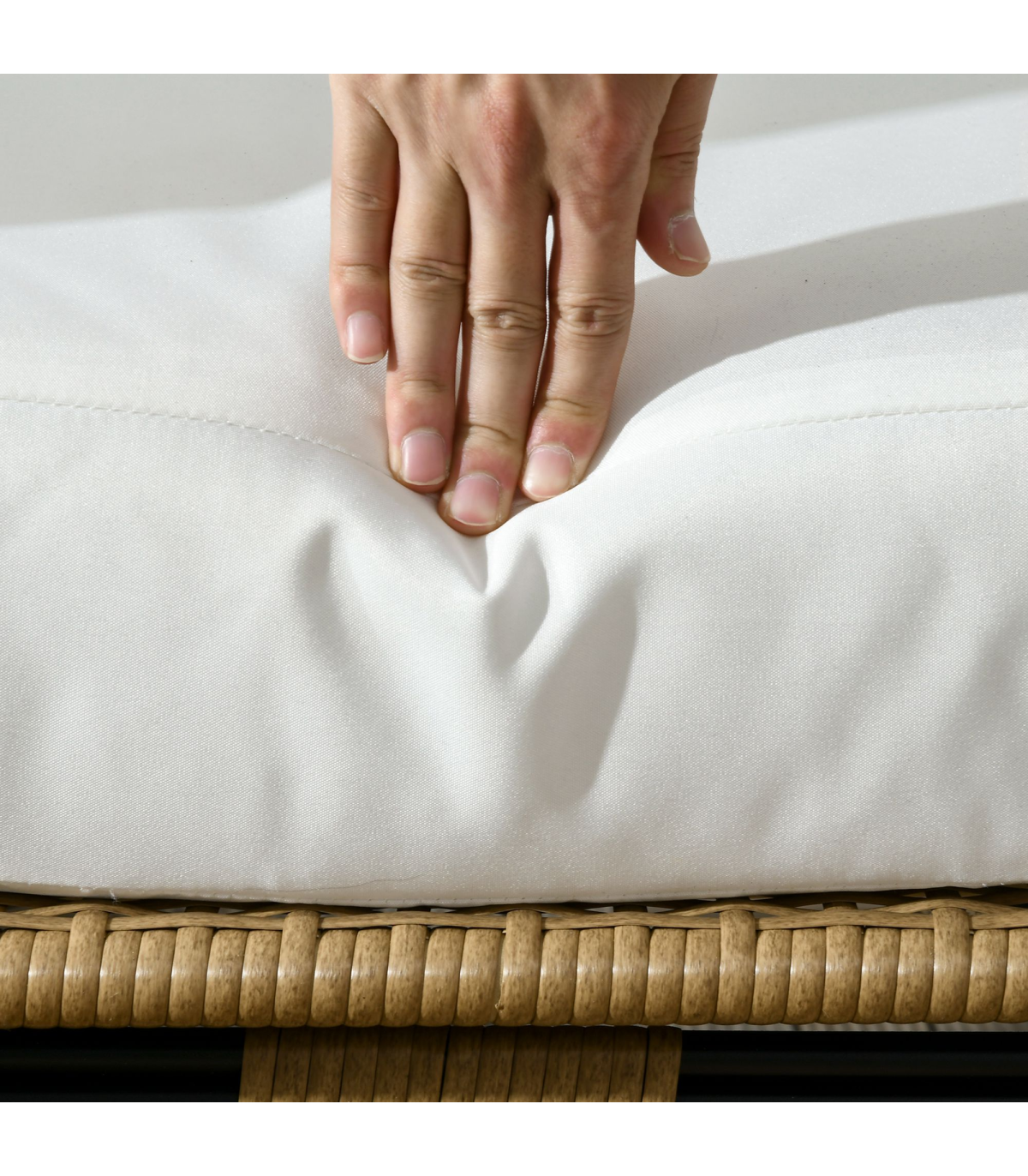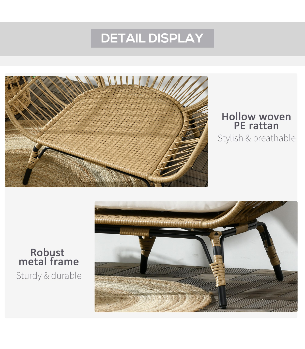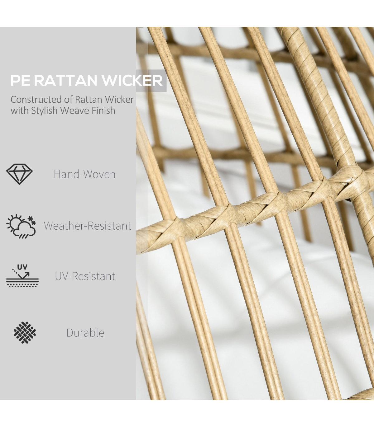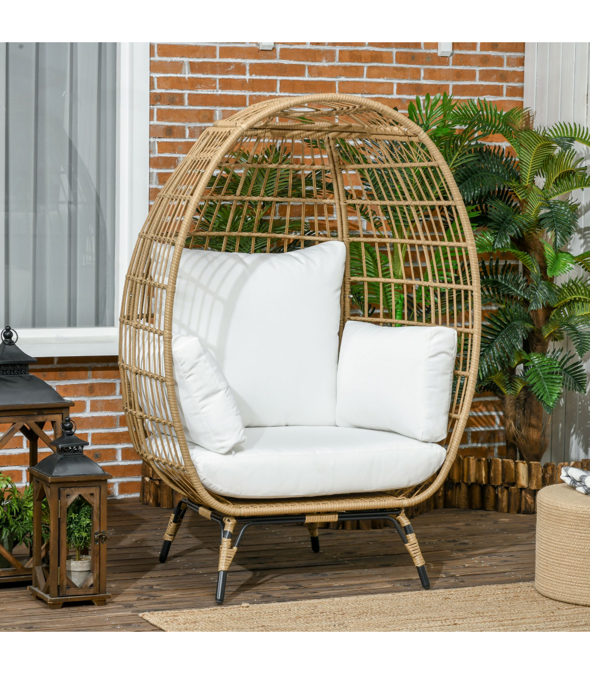 Egg shaped chair: This basket-style egg chair wraps you in a pillow, giving you a cozy cubby to lounge in. Its modern, eye-catching aesthetic makes it an excellent choice to use indoors or outdoors.Adjustable foot knobs: There are adjustable foot knobs on the legs of the wicker chair. They can be used not only to adjust the height but also to adjust the balance on slightly uneven ground.Comfortable cushion chair: Lounge the day away and enjoy the soft summer breeze in the backyard, patio, or garden. A wicker garden furniture with 12cm thickly padded cotton seat, back cushions and two side pillows that straps into place. Don't just sit, sit comfortably.Durable structure: This rattan garden sofa is made of a quality steel frame with a powder-coated finish, wrapped with mixed round and flat PE rattan wicker with a unique weave effect for superior durability and stylish.Overall dimension: 105W x 97D x 150H cm, Weight Capacity: 120kg. Assembly required.