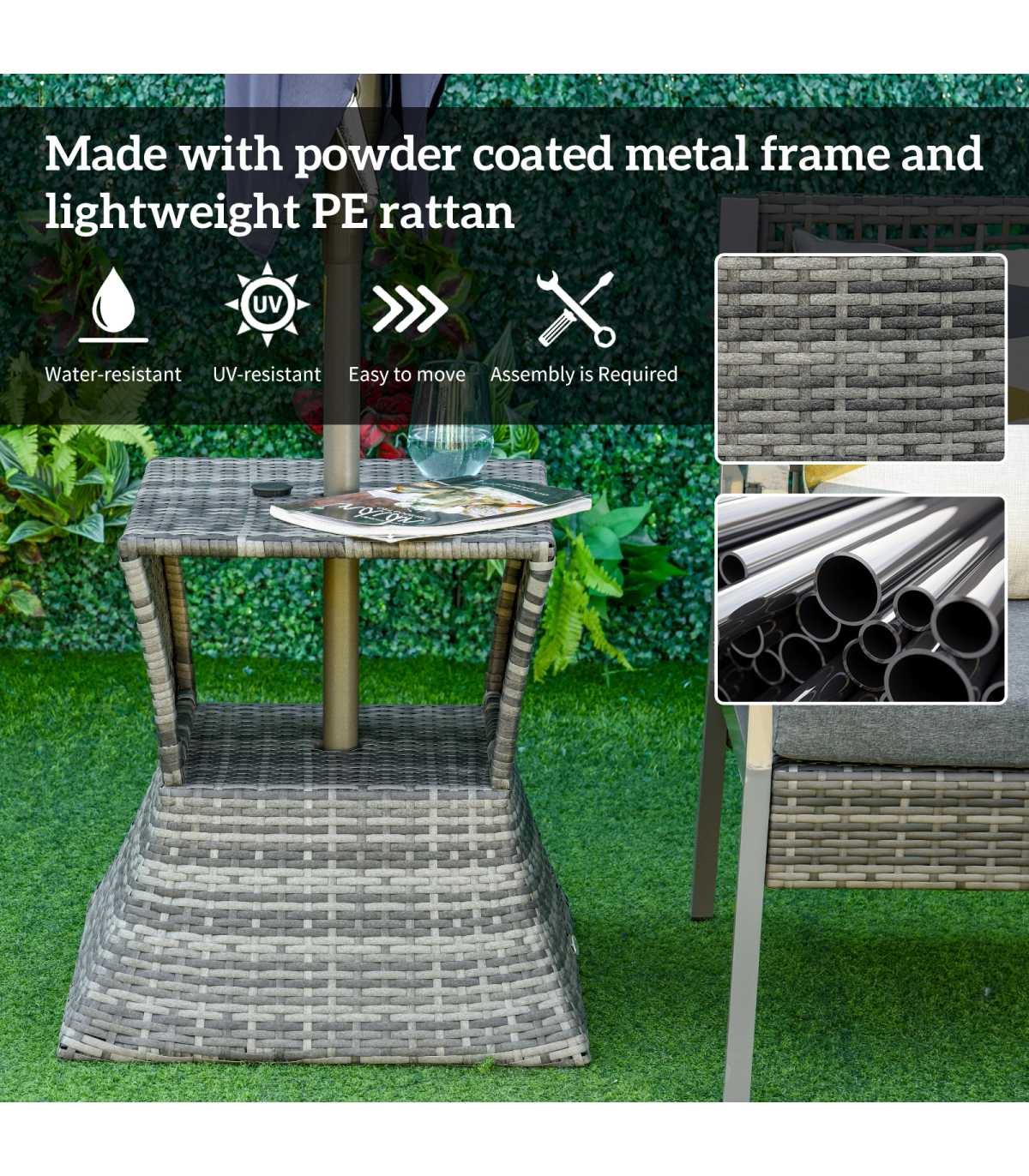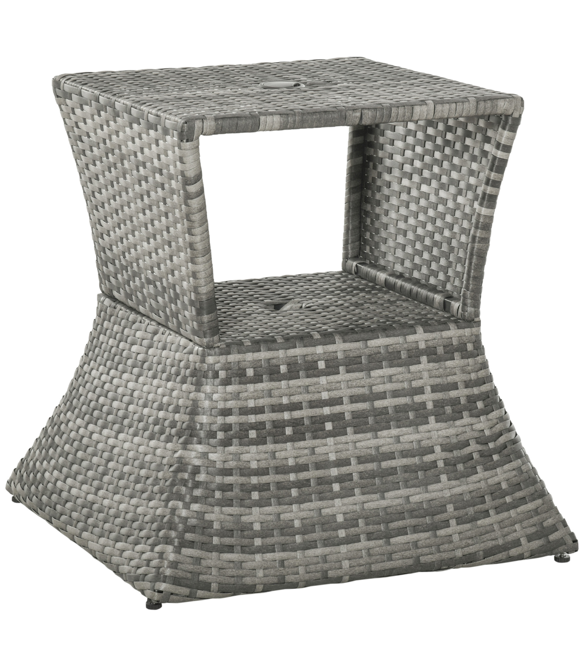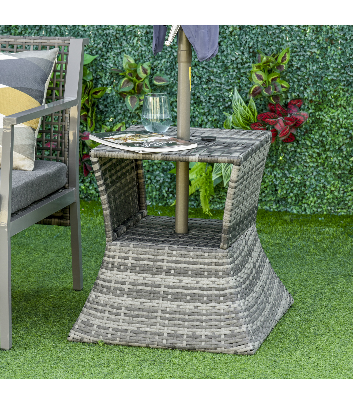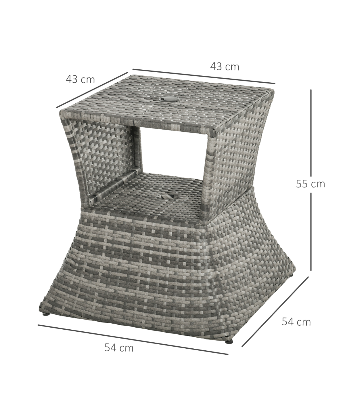 PE RATTAN WICKER: Weather-resistant for year-round use. Mixed grey colourway is stylish and will complement other rattan pieces.CENTRAL PARASOL HOLE: Holds a single sun umbrella so you can relax in the shade and ensure you are protected.METAL FRAME: A solid structure which ensures a tough main structure. STORAGE SHELF: Easy to keep everything you need right next to you.DIMENSIONS: 55H x 54L x 54Wcm. Table top: 43L x 43Wcm. Umbrella hole: 4cm (Suitable for 38mm umbrella diameter )MAXIMUM LOAD 30KG. ASSEMBLY REQUIRED.