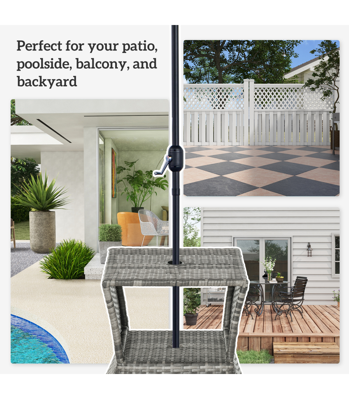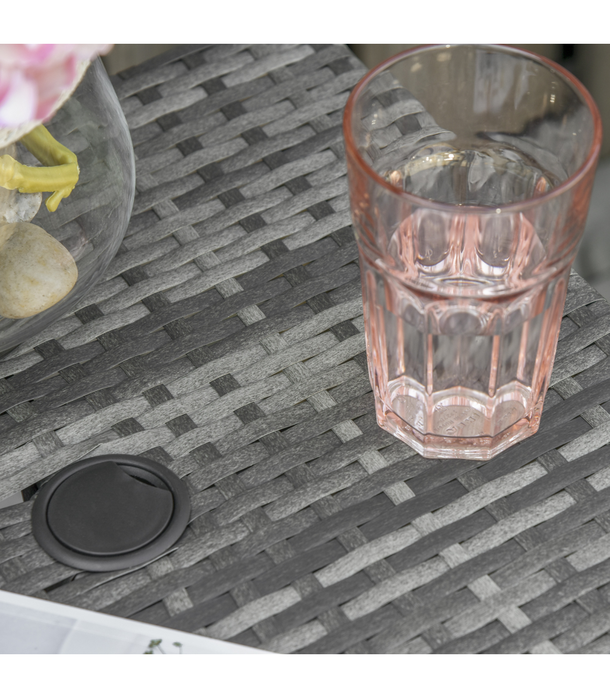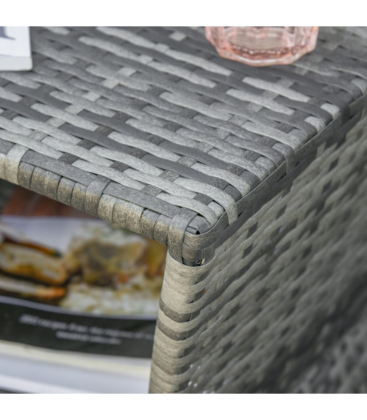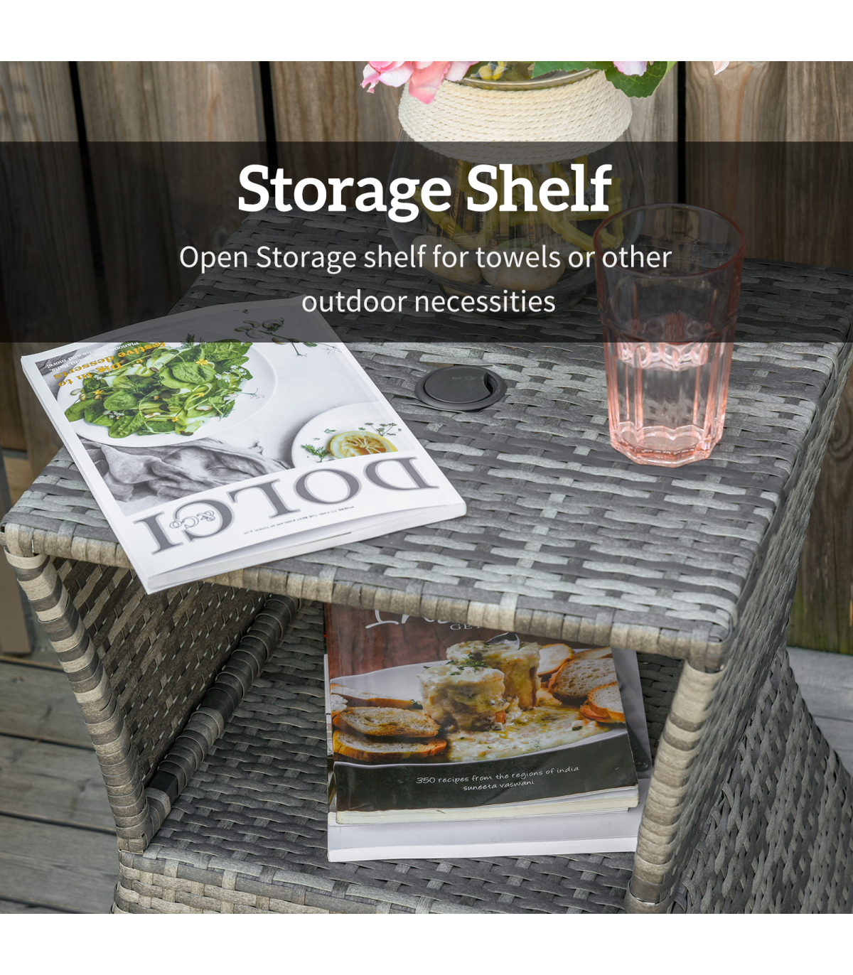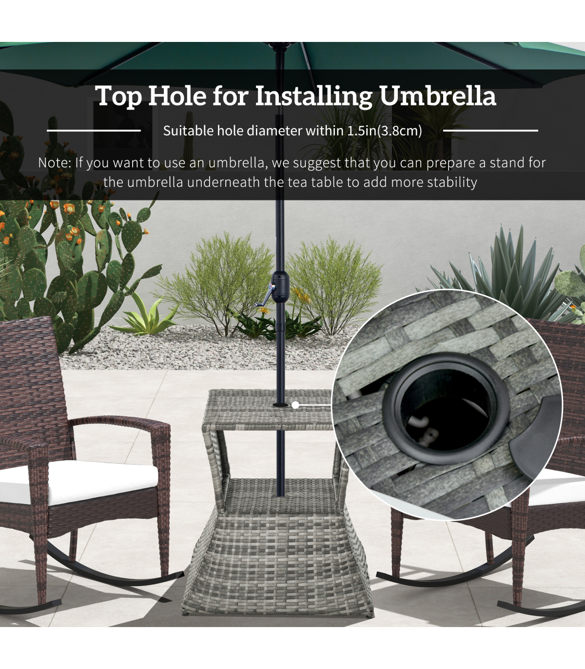 PE RATTAN WICKER: Weather-resistant for year-round use. Mixed grey colourway is stylish and will complement other rattan pieces.CENTRAL PARASOL HOLE: Holds a single sun umbrella so you can relax in the shade and ensure you are protected.METAL FRAME: A solid structure which ensures a tough main structure. STORAGE SHELF: Easy to keep everything you need right next to you.DIMENSIONS: 55H x 54L x 54Wcm. Table top: 43L x 43Wcm. Umbrella hole: 4cm (Suitable for 38mm umbrella diameter )MAXIMUM LOAD 30KG. ASSEMBLY REQUIRED.