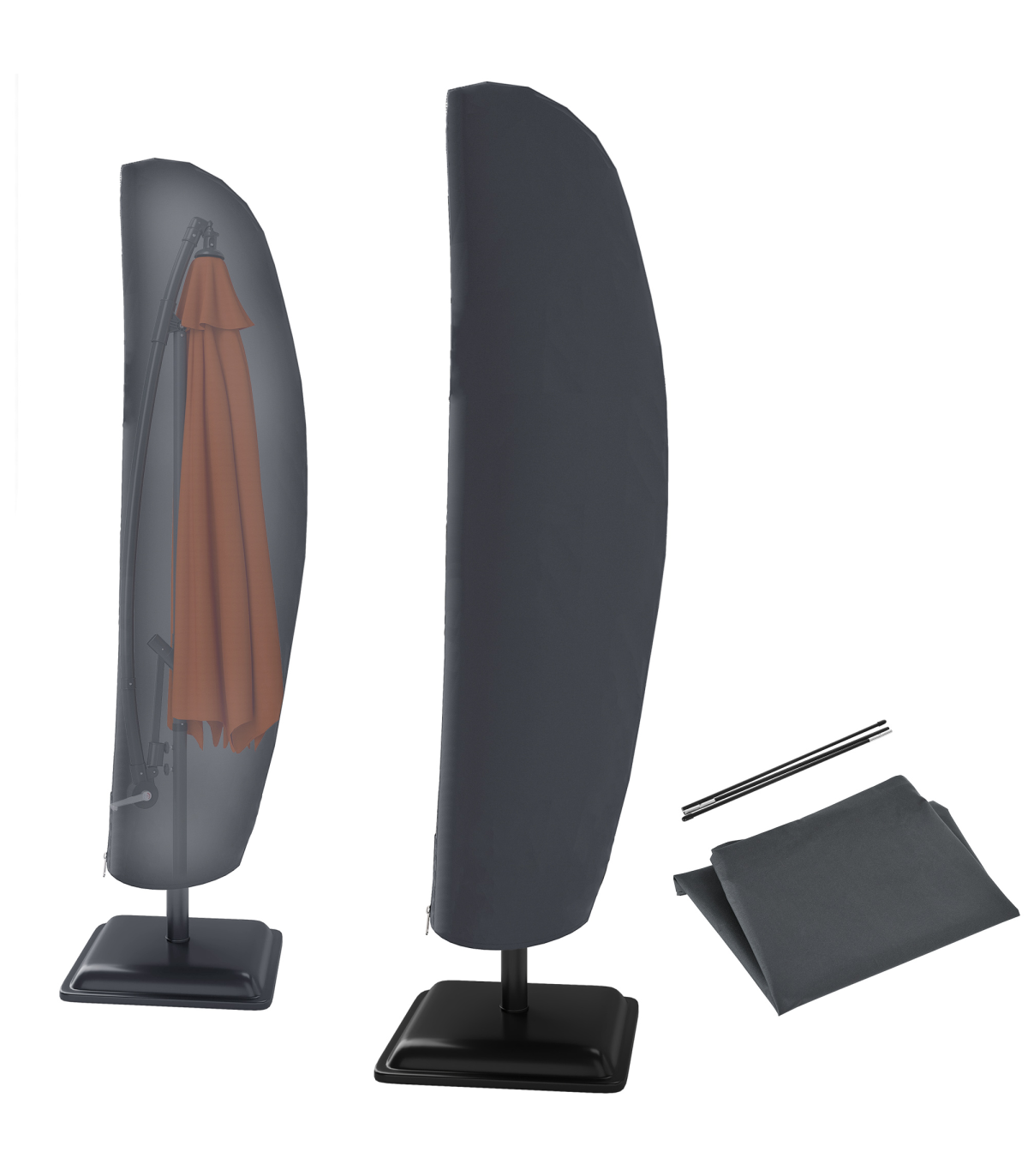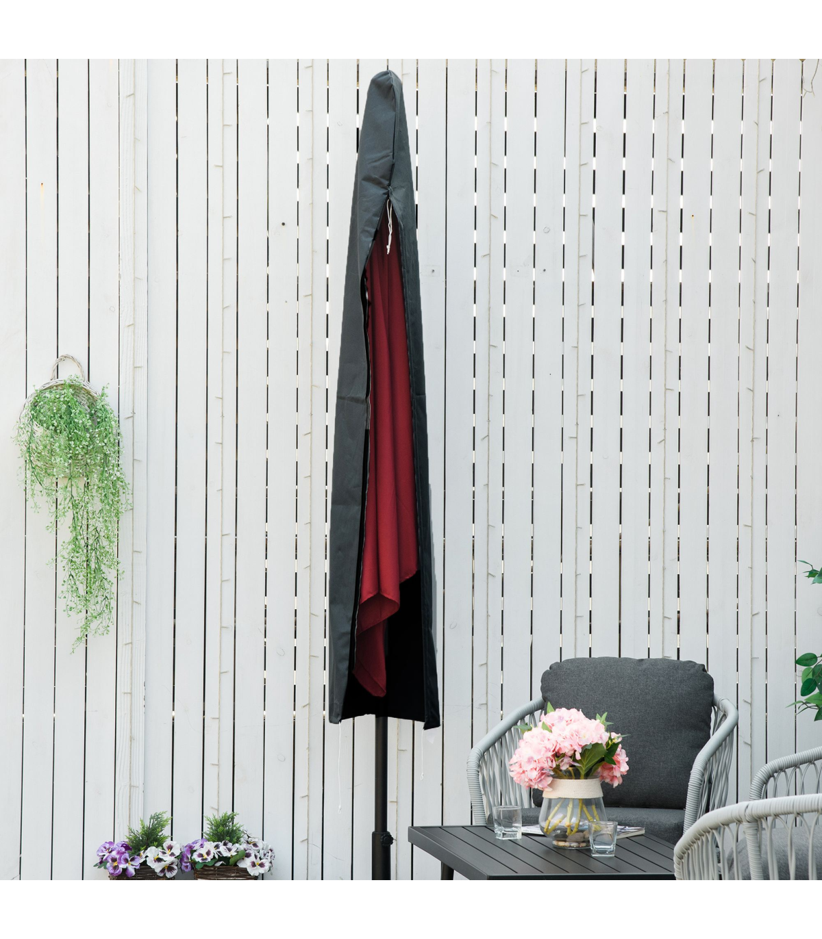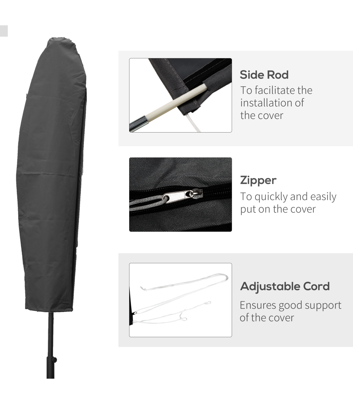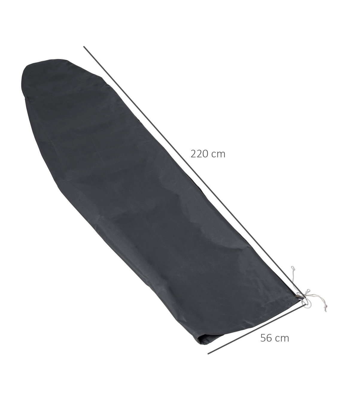 Generously sized: �56cm x 220cm. Fits most patio and market umbrellas, and keeps your parasol dry and clean all year round.Waterproof: The patio umbrella cover is made of high density 300D x 300D Oxford fabric with thick water-resistant PVC lining to keep it looking fresh and new for longerPull cord fastening: Ensures a secure fit around the umbrella, helping to hold in place during windy weather.Easy to use: With zipper for quick and easy fitting and removal. Simple wipe down with a damp cloth.Overall dimension: �56L x 220cm. Suitable for Outsunny Umbrella: 84D-096, 01-0584