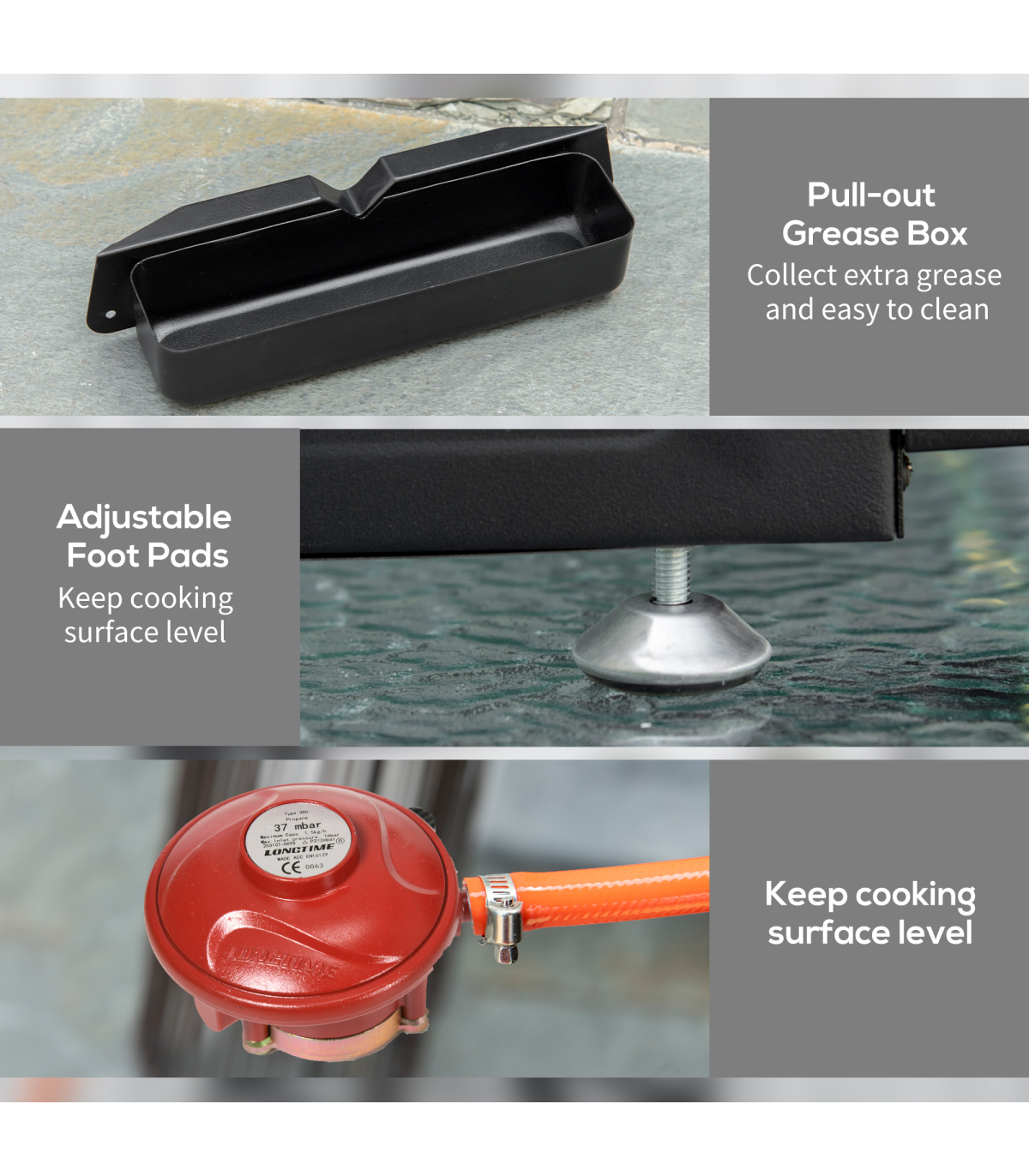 Three 10000 BTU burners - three cooking areas: A plancha grill which can cook three different types of food at three different temperatures. Gas plancha caters for small and large meals - no wasted heat space if cooking in just one areNon-stick hotplate: Gas bbq plancha has an enamel-coated plate, making it easy to cook food and clean after.Compact: This portable gas bbq is perfect for taking with you on-the-go - whether to BBQs, festivals and more.Drain hole and grease collection box: Cooking grease collects together. Pull the box out to empty, saving you time.Dimensions: 61L x 48.5W x 21Hcm. Grill plate: 61L x 35.5Wcm. Regulator and hose included.