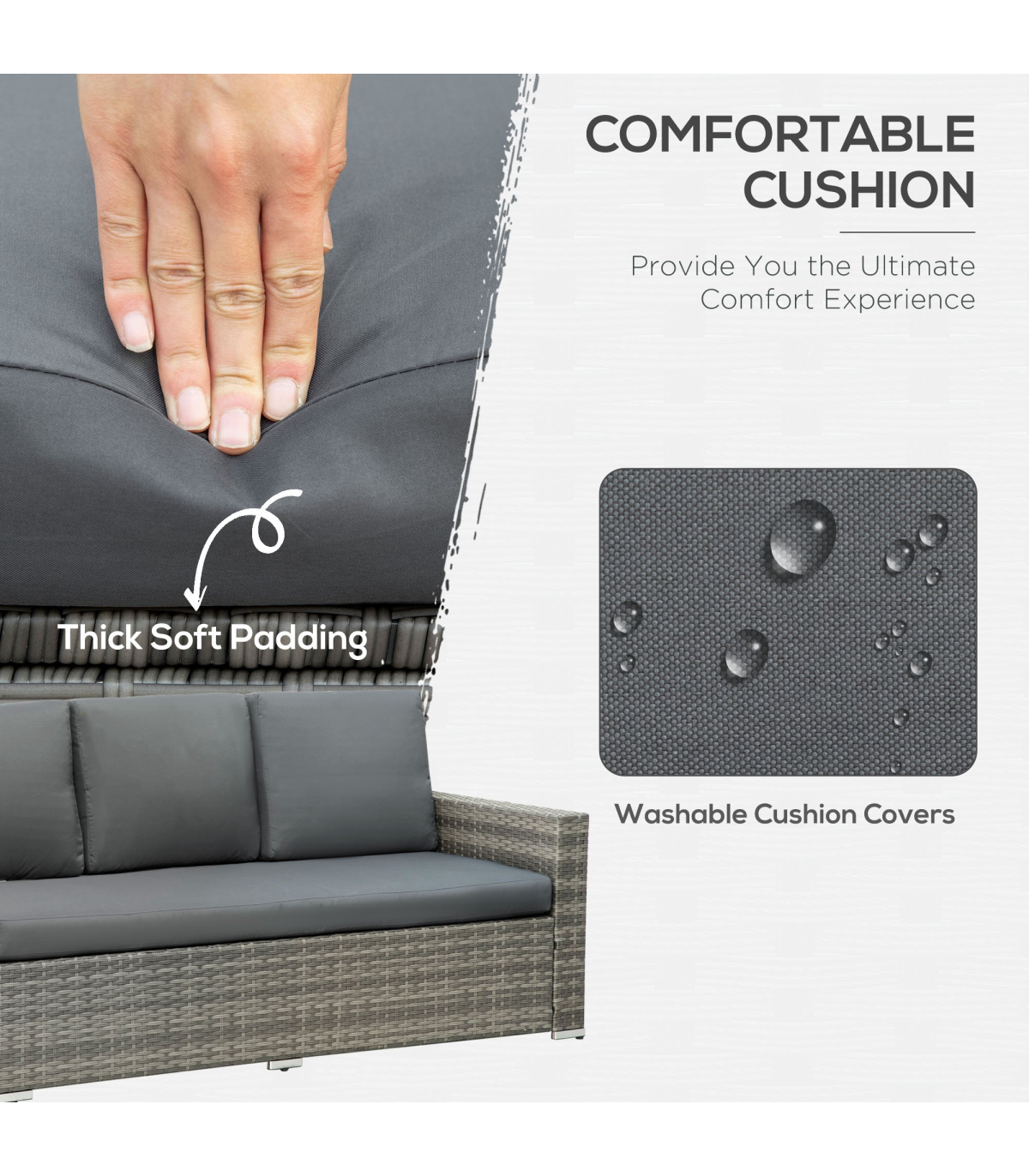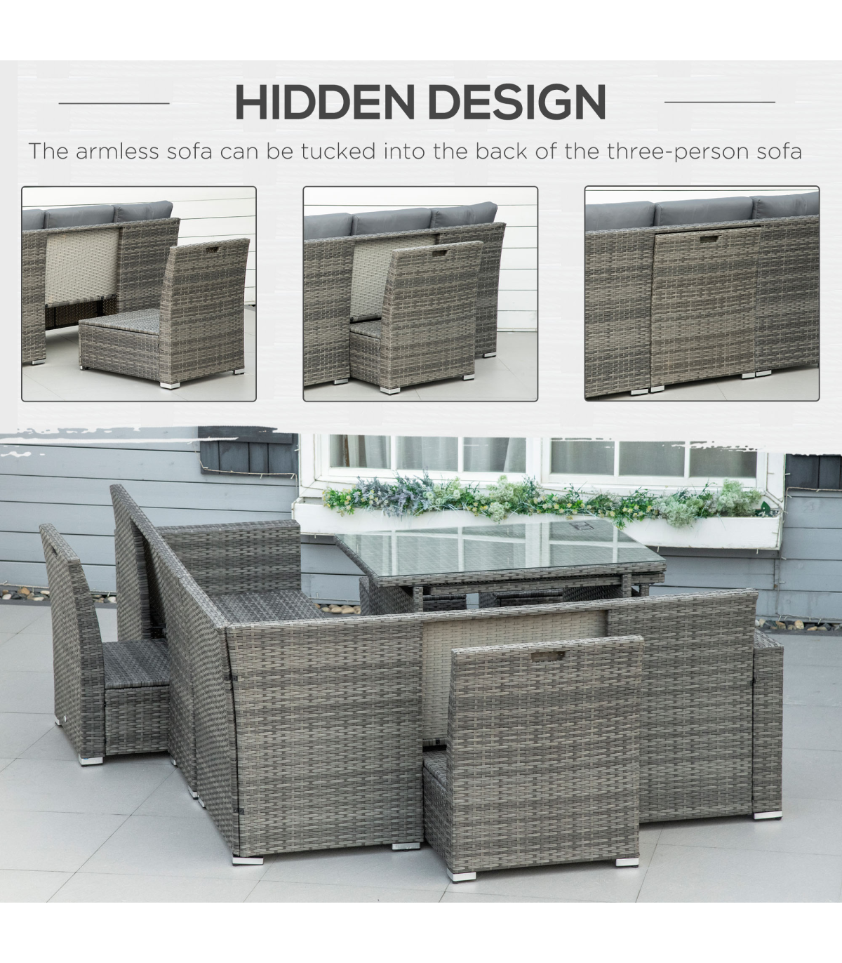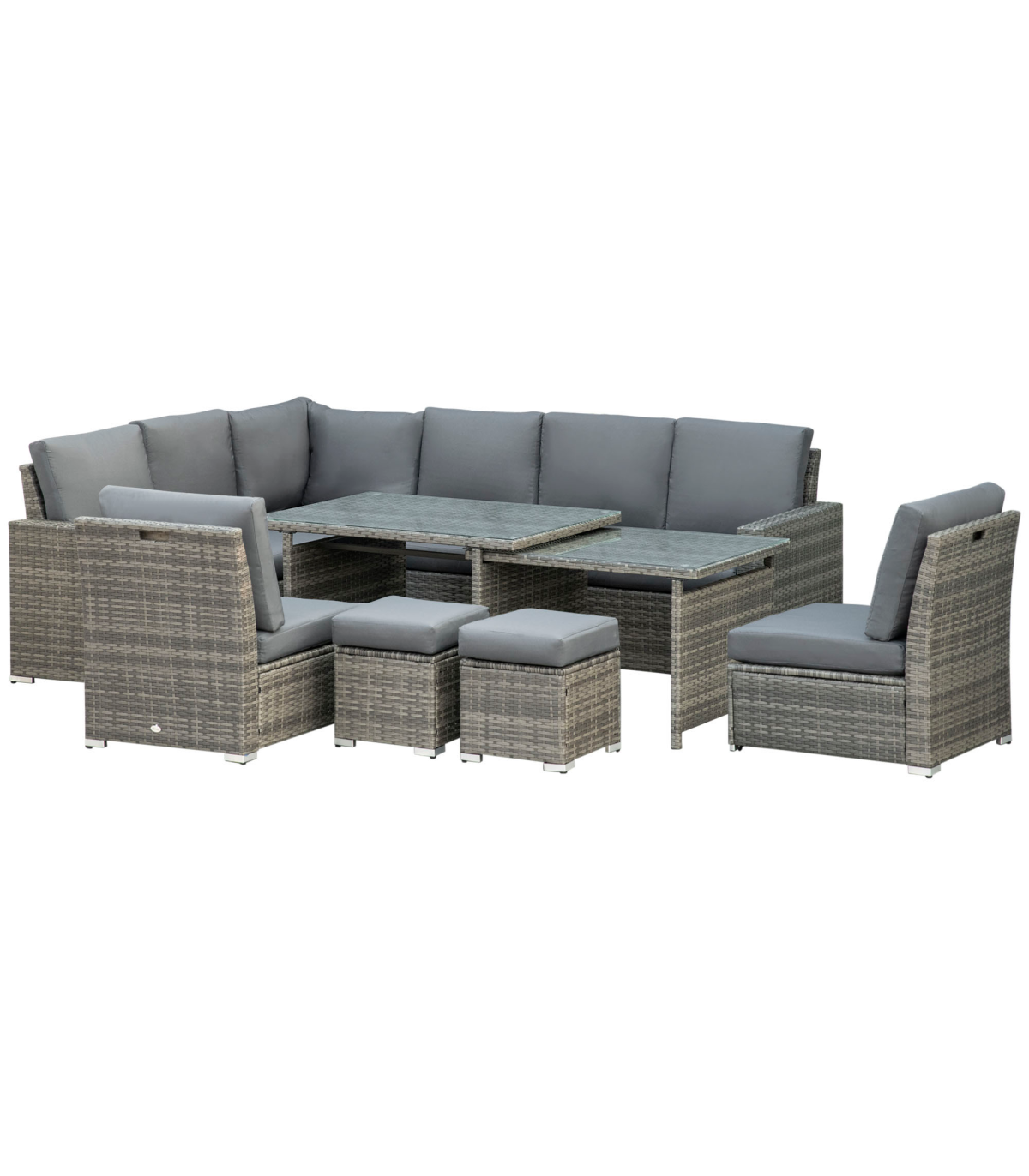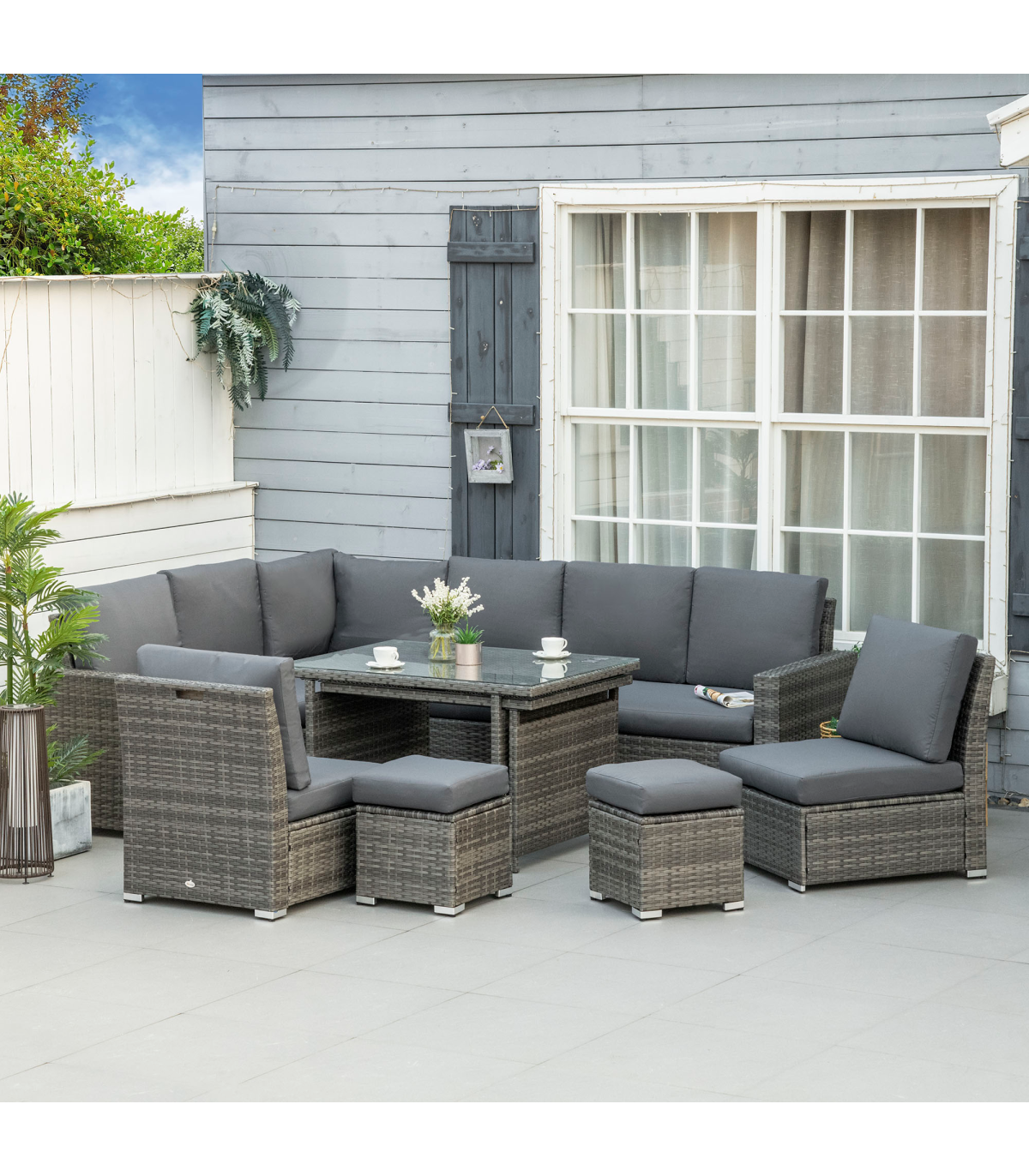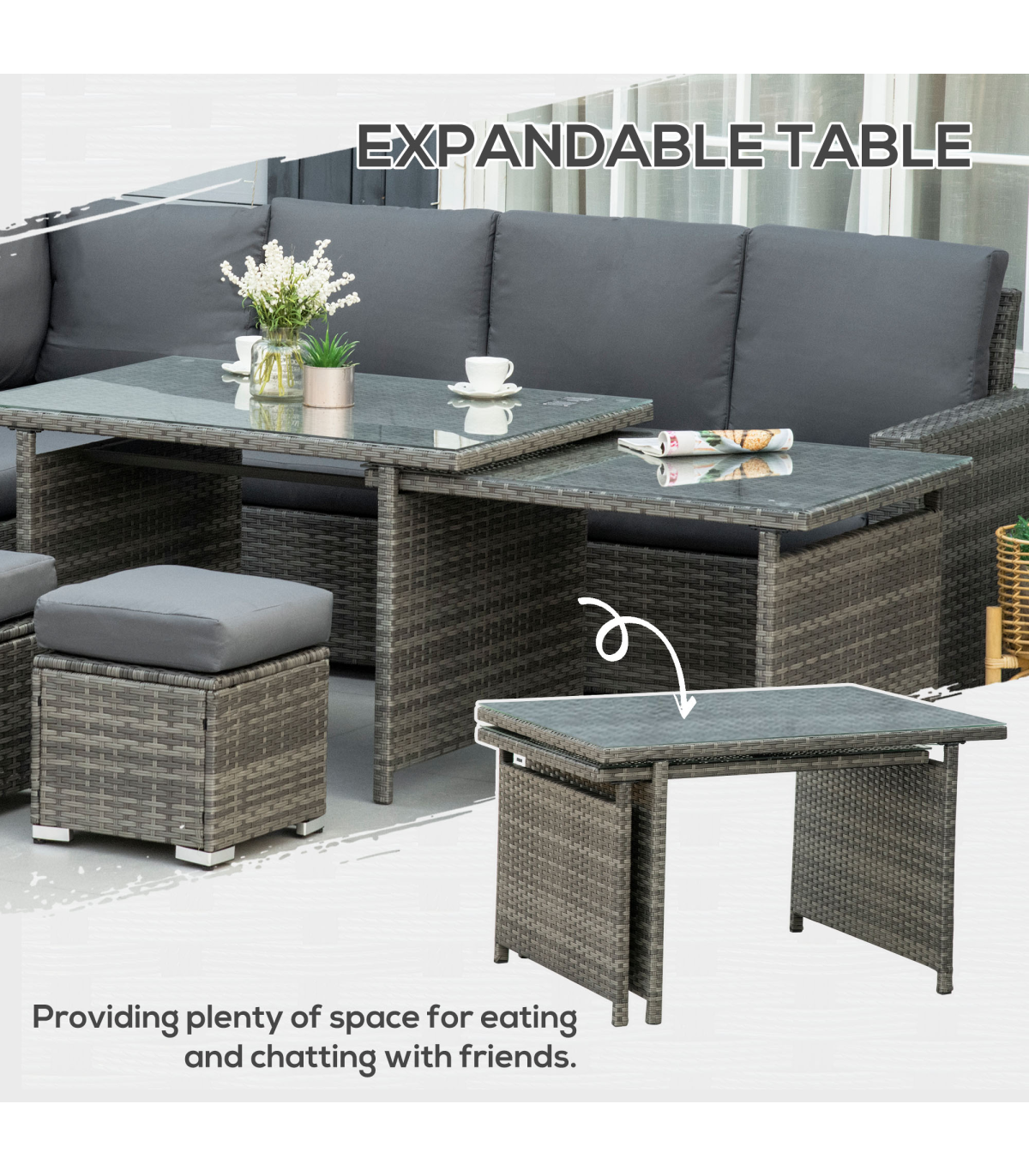 Seven-Piece Rattan Sofa Set: These seven pieces garden sofa set includes a three-seat corner sofa, a three-seat sofa, two armless sofas, two footstools, and a dining table. There are various configuration options for versatile combinations based on your preferences and demands for a relaxing setting, friends hanging out, board gaming, business talk, family reunion, movie time, perfect fit for patio, deck, pool, porch, garden, atrium, terrace, or balcony.Expandable Table: The garden rattan furniture sets features a large centrepiece dining table. This dining table measures 177 x 80 x 67cm, but expands out a 110 x 70 x 60cm small table at a moment's notice, providing plenty of space for eating and chatting with friends.Comfortable Seating Experience: This outdoor rattan garden sofa features seating with soft padded cushions to create the ultimate comfortable outdoor seating experience. All cushion covers come with zippers for easy removed and washed. A left double sofa feature storage function provide extra storage space.Made for Outdoors: This outdoor sectional patio sofa set is made of a steel frame with a powder-coated finish, wrapped in all-hand woven twin half-round PE rattan making it sturdy, easy to clean, and resistant to UV and light water damage.Dimension: Three-Seat Corner Sofa: 190W x 80D x 81Hcm. Three-Seat Sofa: 171W x 80D x 81Hcm. Armless Sofa: 62W x 72D x 77Hcm. Table: 177/110L x 80/70W x 67/60Hcm. Weight Capacity: Three-Seat Sofa: 360kg, Armless Sofa: 120kg, Footstool: 120kg, Table: 50kg. Assembly required.