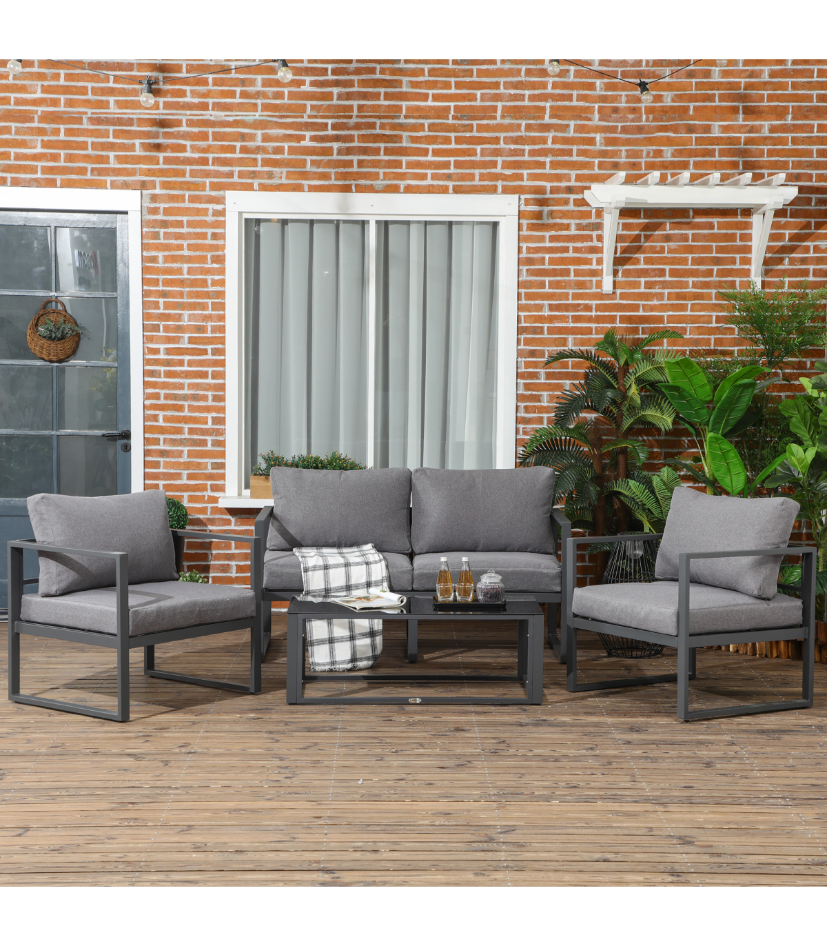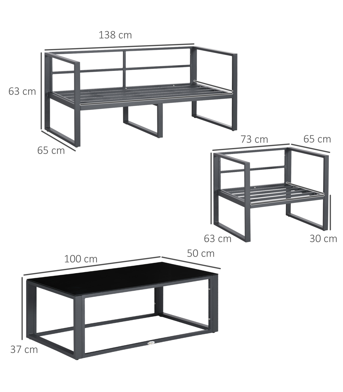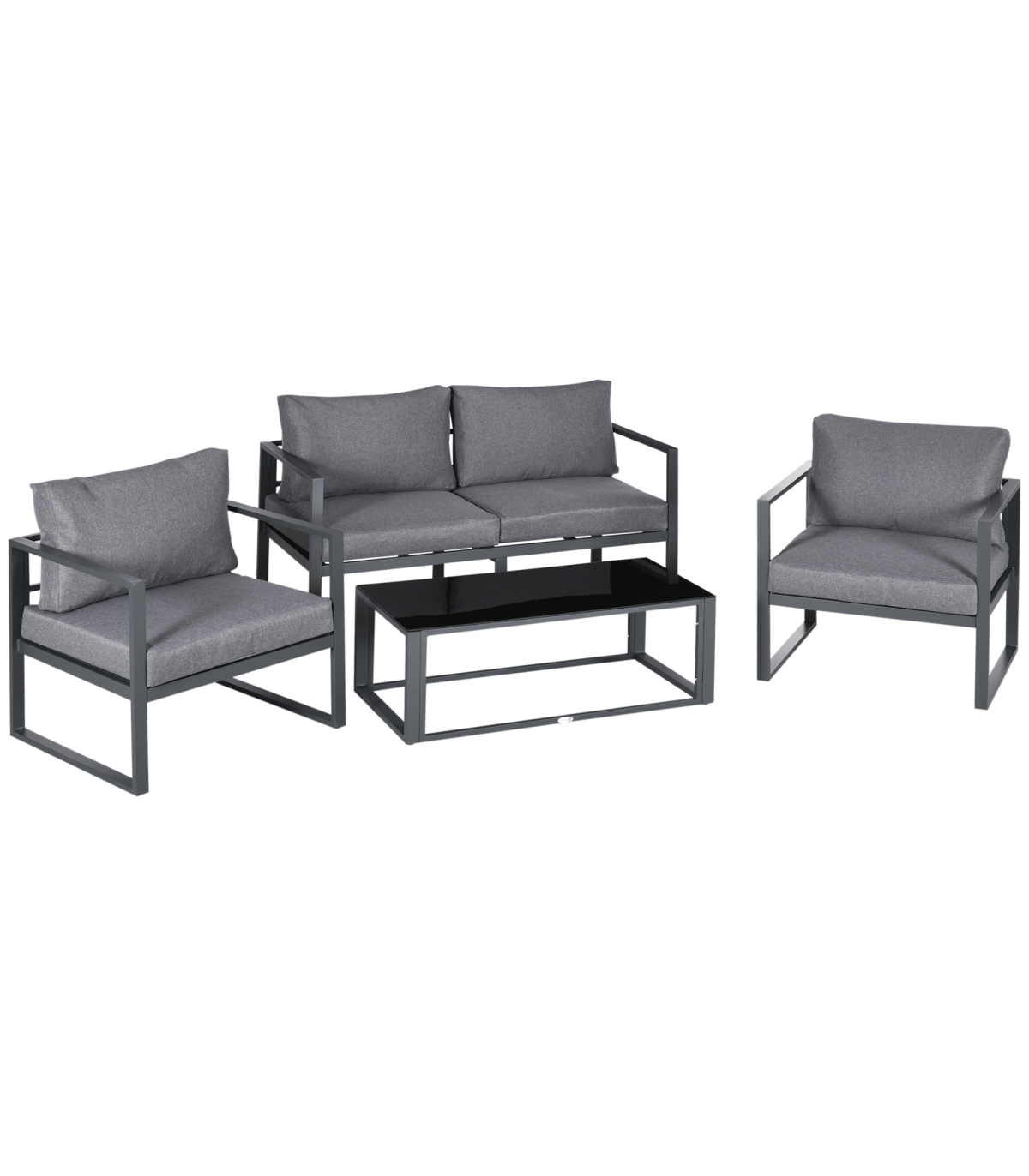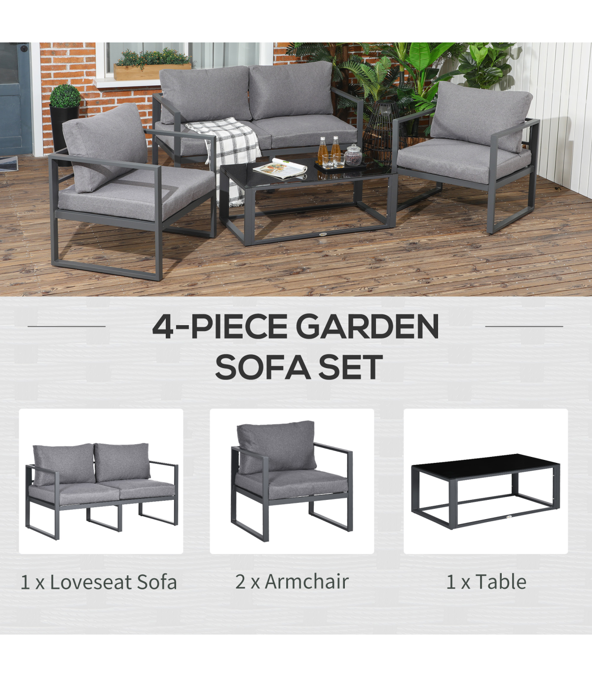 Four-piece set: Formed of a two-seater sofa, two chairs and a matching table ? ideal for seating friends and family outside together. Great for gardens, patios, balconies etc.Aluminium frames: Tough and lightweight for durability, crafted into a wide seat design with a high back and armrests for comfort and support.Padded cushions: Each seat and back features a thick foam padded cushion for prolonged comfort. Removable and washable covers.Glass tabletop: A sleek look for the table, a solid and safe holding place.Dimensions: Sofa: 63H x 138W x 65Dcm. Chair: 63H x 73W x 65Dcm. Table: 37H x 100W x 50Dcm. Assembly required.
