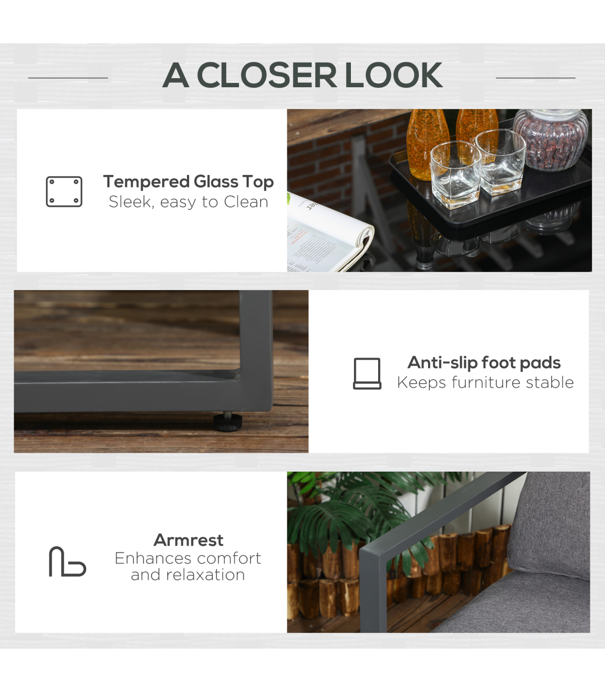 Take comfort back to basics with this four-piece outdoor dining set from Outsunny. Using aluminium for the frame of the four chairs and the table, each piece has been made with durability and strength in mind, as well as being lightweight for you to move everything around easily. Placed on the seats and the backs of the sofa and two chairs, thick padded cushions ensure you?ll be sitting comfortably, with the high backs and armrests working together for additional comfort and support.