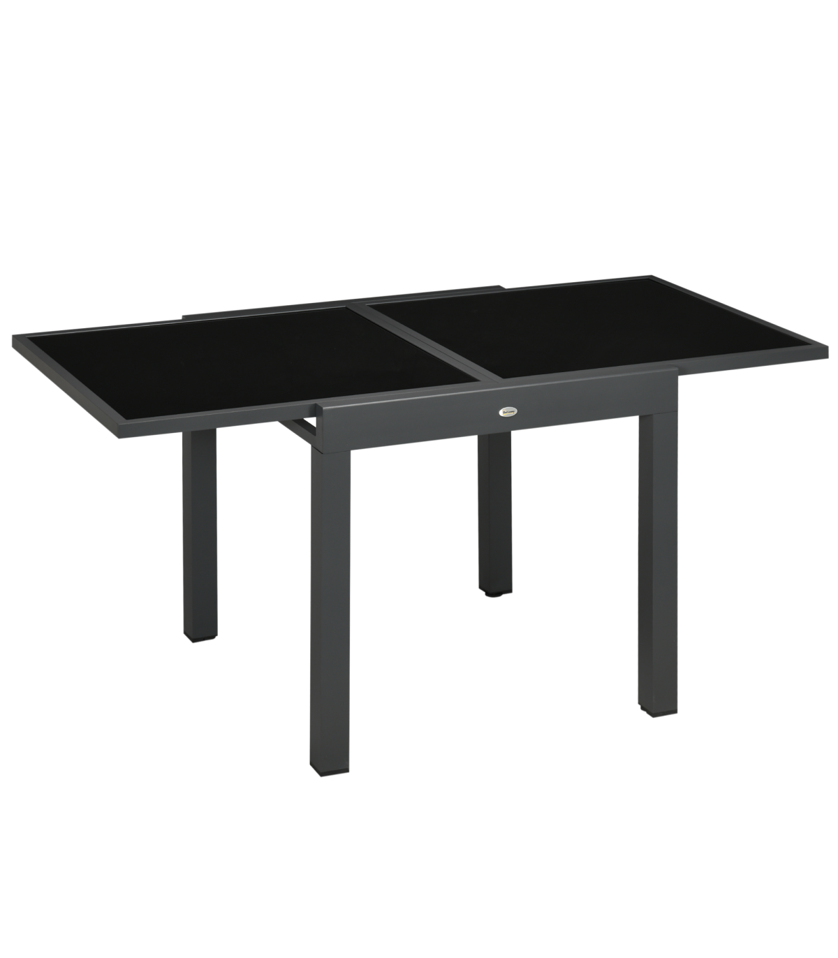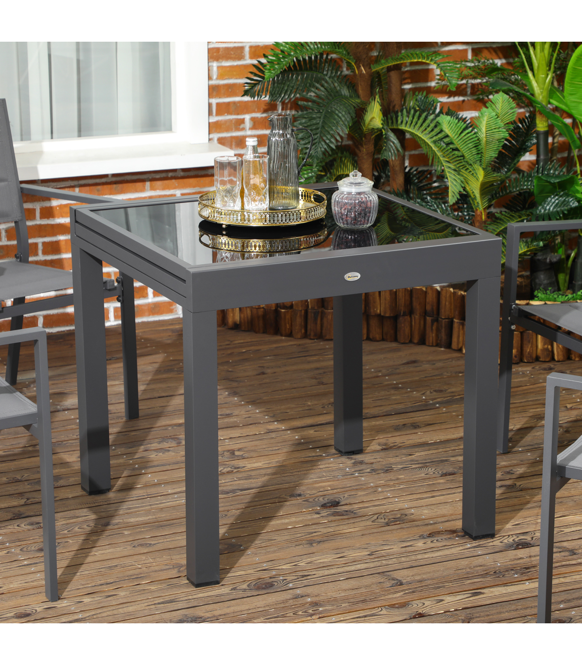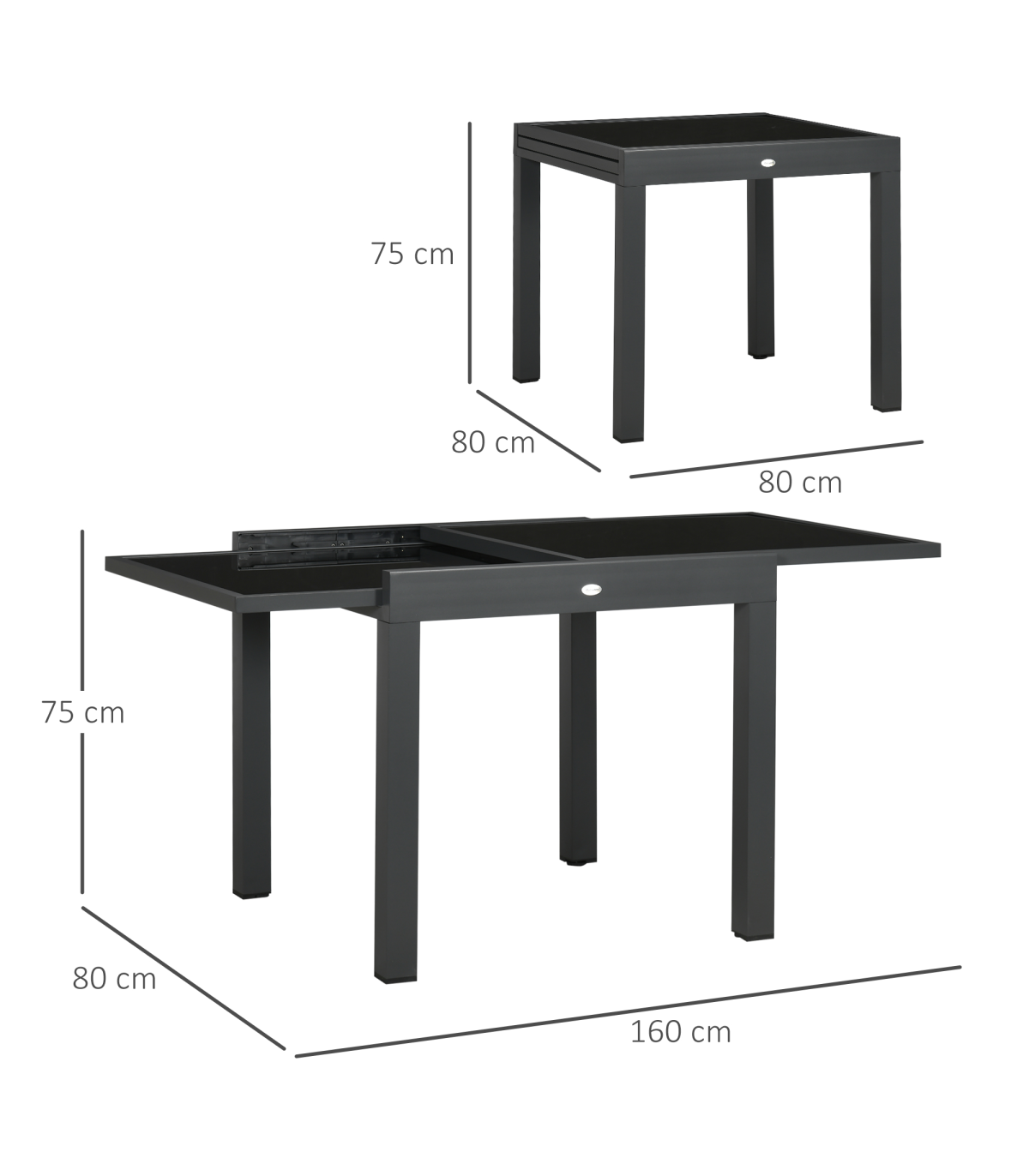 Outdoor patio dining table: Place the rectangular outdoor table in the backyard, front yard, balcony, garden, or deck, to put on parties, serve drinks, dinner or play a game with guests.Expandable design: This dining table measures 80 x 80 cm, and expands out to 160 cm at a moment's notice, great for serving family or friends gatherings.Aluminium frame: A stable and durable core, made from aluminium with powder-coating finish, provides strong support and is tough for prolonged wear. With adjustable foot pads for keeping it stable on the floor and adding safety.Easy to clean: 5mm-thick tempered glass table top with frame design ensures reinforcement, beauty and easy cleaning. You can put drinks and meals on it when relaxing.Product information: Overall Dimension: 160L x 80W x 75Hcm (extended). Weight Capacity: 50kg. Assembly required.