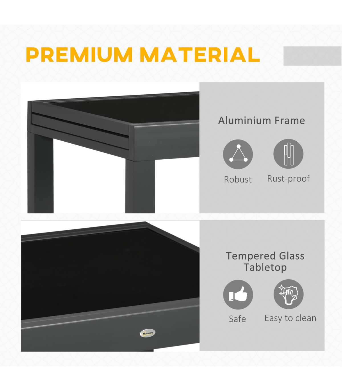 Want a place to put on backyard barbecues and cosy campfires? Like to read in the breeze? Need a table? Outsunny has a patio dining table to help you put on the picnic of your dreams. The sturdy aluminium frame with quality tempered glass table top is stable and easy to maintain. Also add enduring beauty, style, and grace to your environment with this essential part of any outdoor living space like the backyard, front yard, balcony, garden, or deck. Put some party into your patio with Outsunny.
