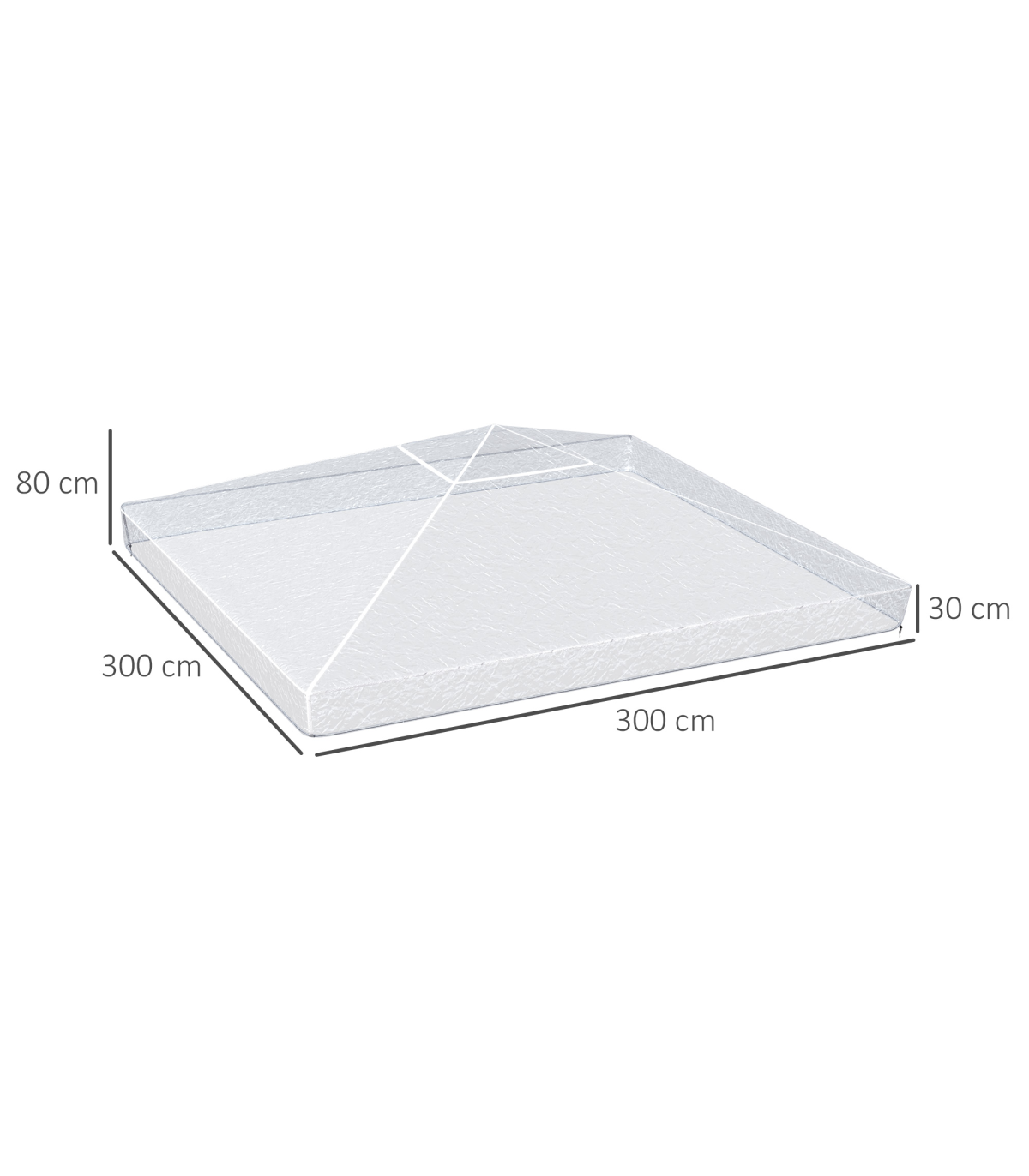 Gazebo cover: Protects your gazebo canopy from the elements, keeping it looking fresh and clean for longer.Waterproof PVC: Pergola cover will effectively prevent water leakage.Pull cord fastening: Ensures a secure fit around the roof, helping to hold the canopy cover in place during windy weather.Applicability: Suitable for 3 x 3 (m) gazebos or foldable canopies. (Outsunny products: 84C-322 and 84C-122 series).Dimensions: 300L x 300W x 80Hcm. Rain cover included only in this package.