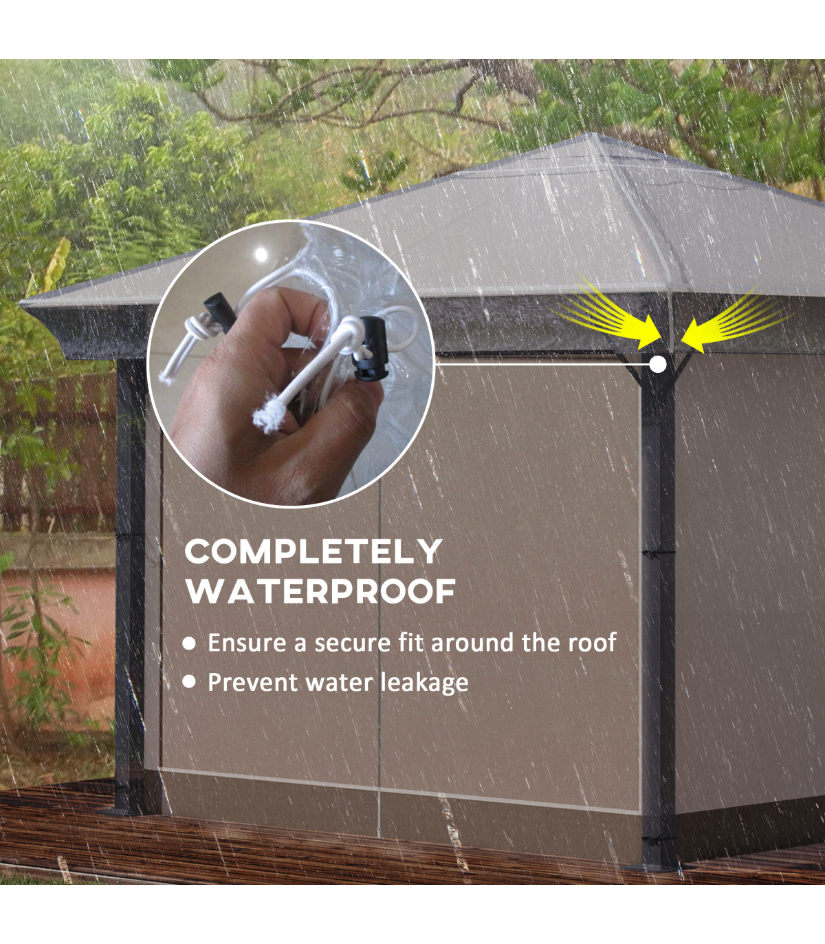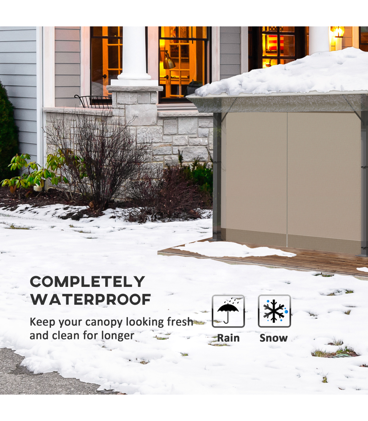 when it rains or snows and you still need to use your gazebo, then a gazebo cover is the answer. Made from waterproof PVC, this cover can be easily attached, with a drawstring to fit securely. Windproof and prevents rainwater from seeping in. Suitable for Outsunny products: 84C-322 and 84C-122 series,