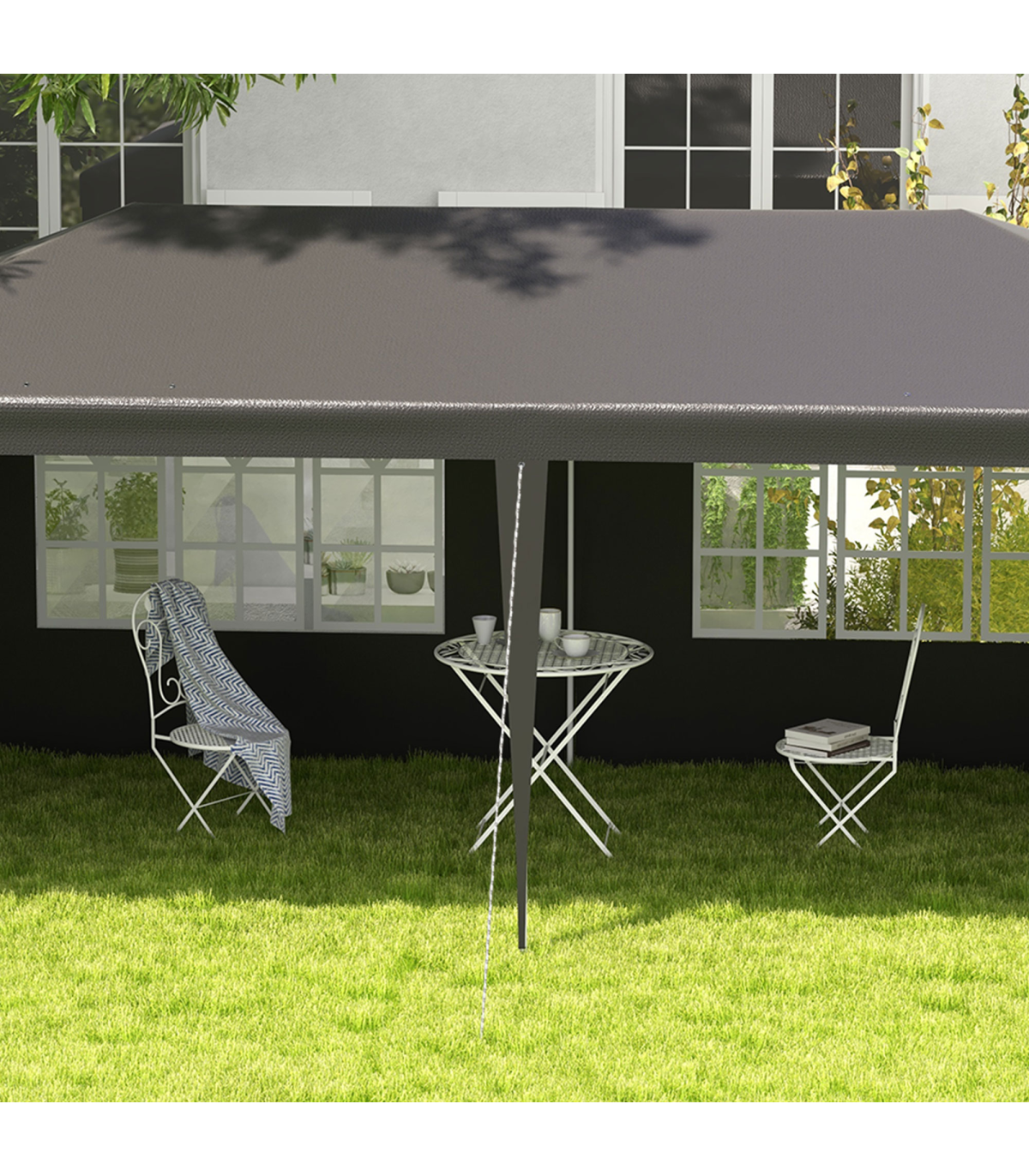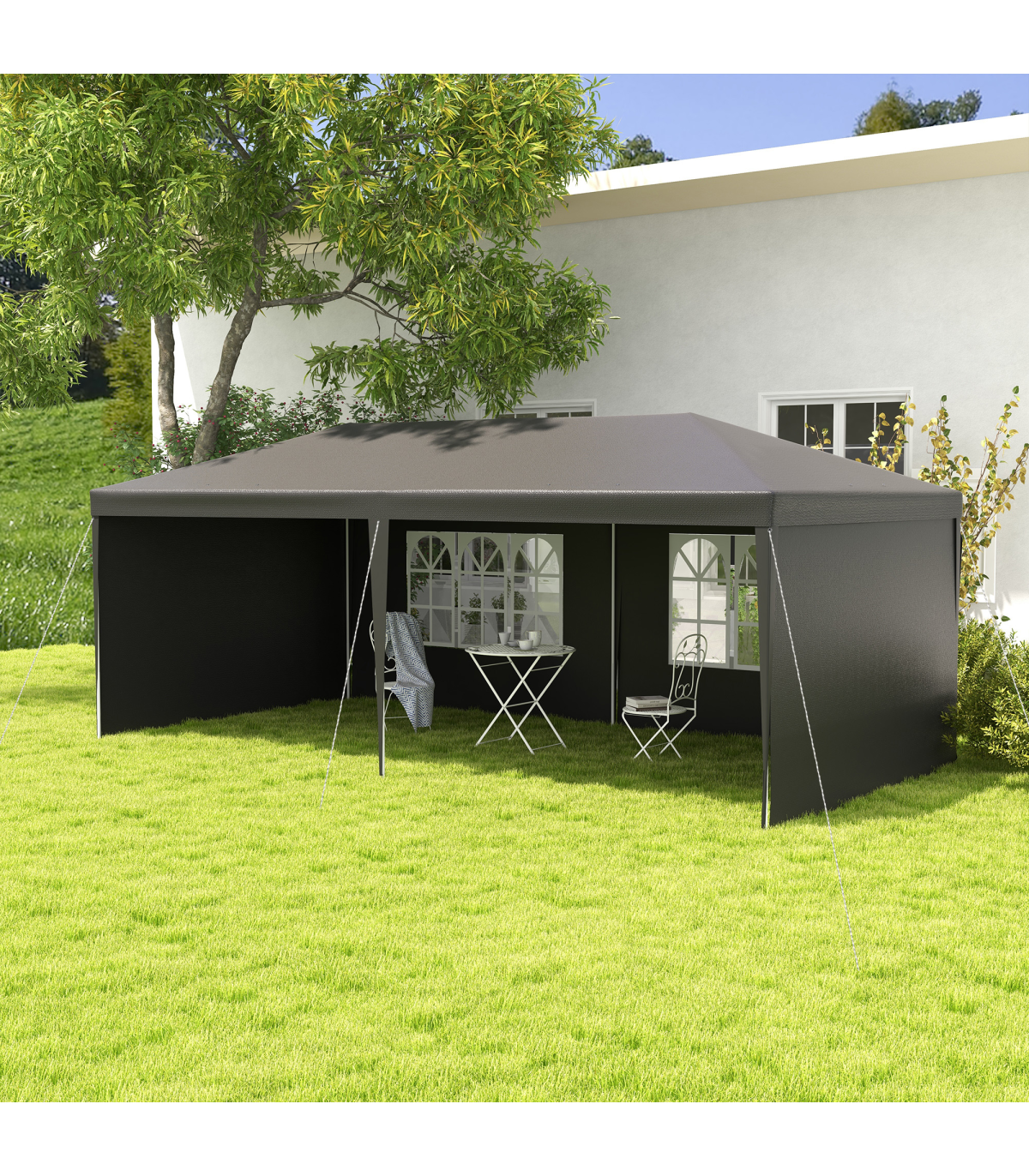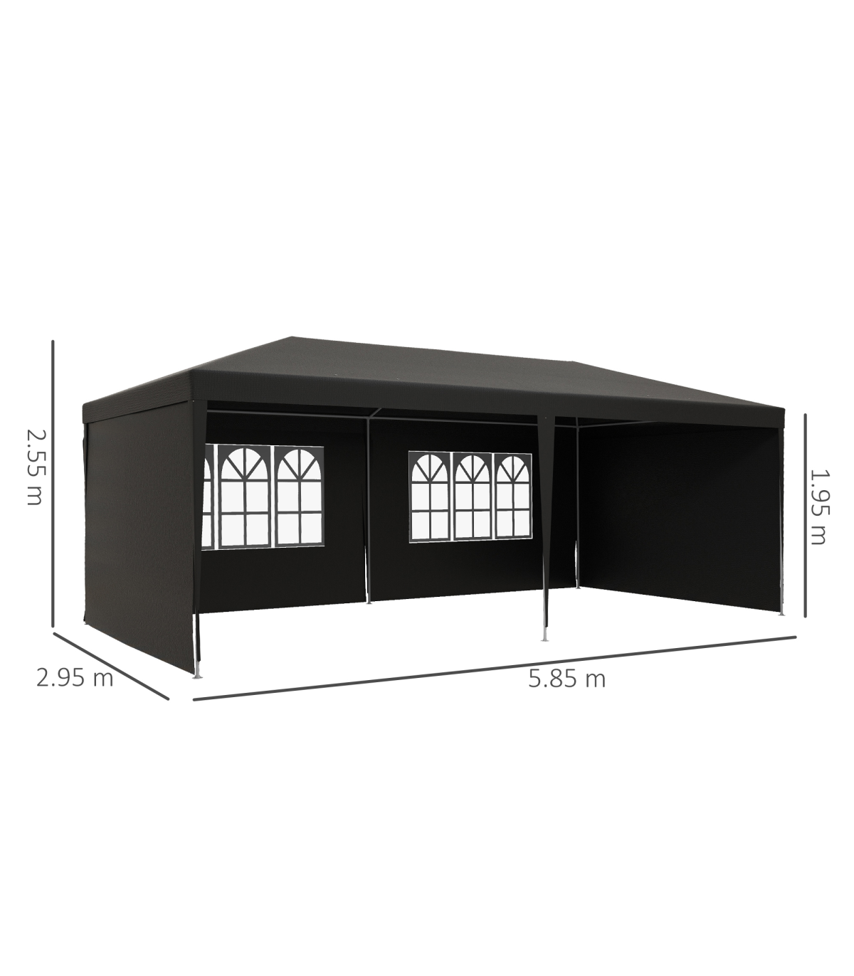 5.83 x 2.95m camping gazebo: Large and spacious, a place to hold garden and outdoor parties, BBQs, family gatherings, birthdays, garage sales - whatever you need it for.Protective canopy: Polyethylene plastic is durable, keeping you protected from direct sunlight and light rain and wind.Simple, easy setup Save time and energy with the quick and easy assembly. Easy to pack away. Adjustable feet keep the gazebo with sides stand even on wobbly ground.Accessories included: 6 x guy ropes and 12 x ground pegs - helps keep party gazebo standing steady.Dimensions: 2.55H x 5.83L x 2.95Wm. Window: 1.77L x 0.99Wm. Do not leave shelter unattended or up in bad weather. Always use with the included guy ropes and pegs.