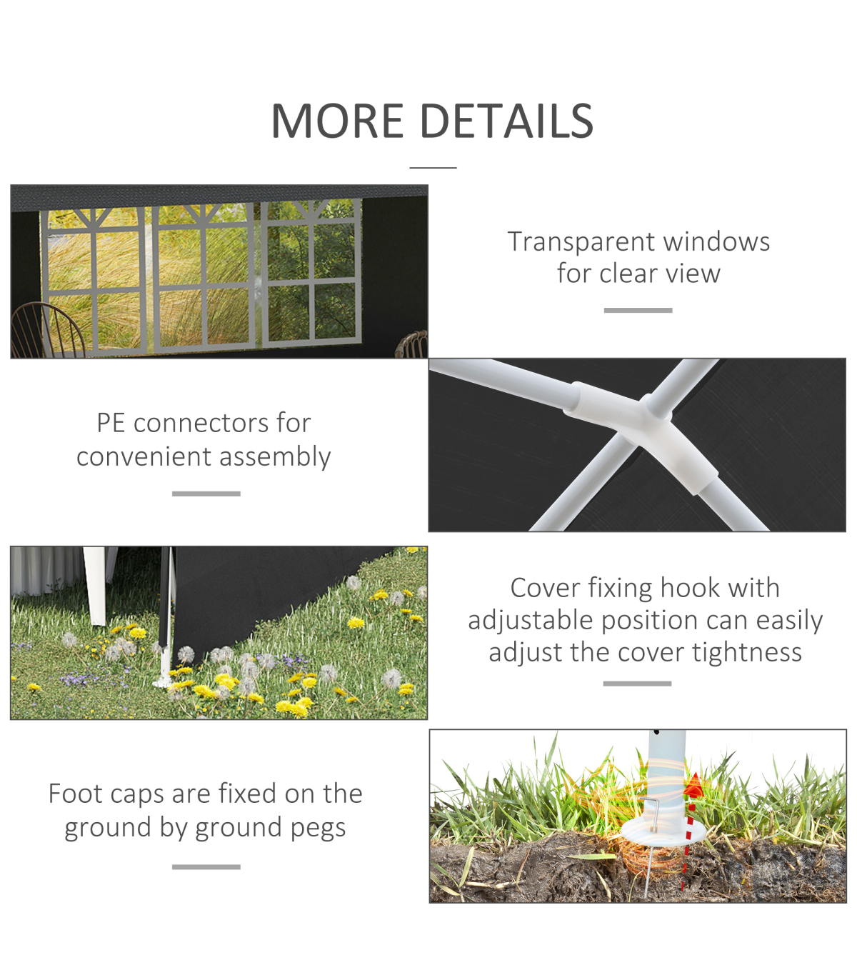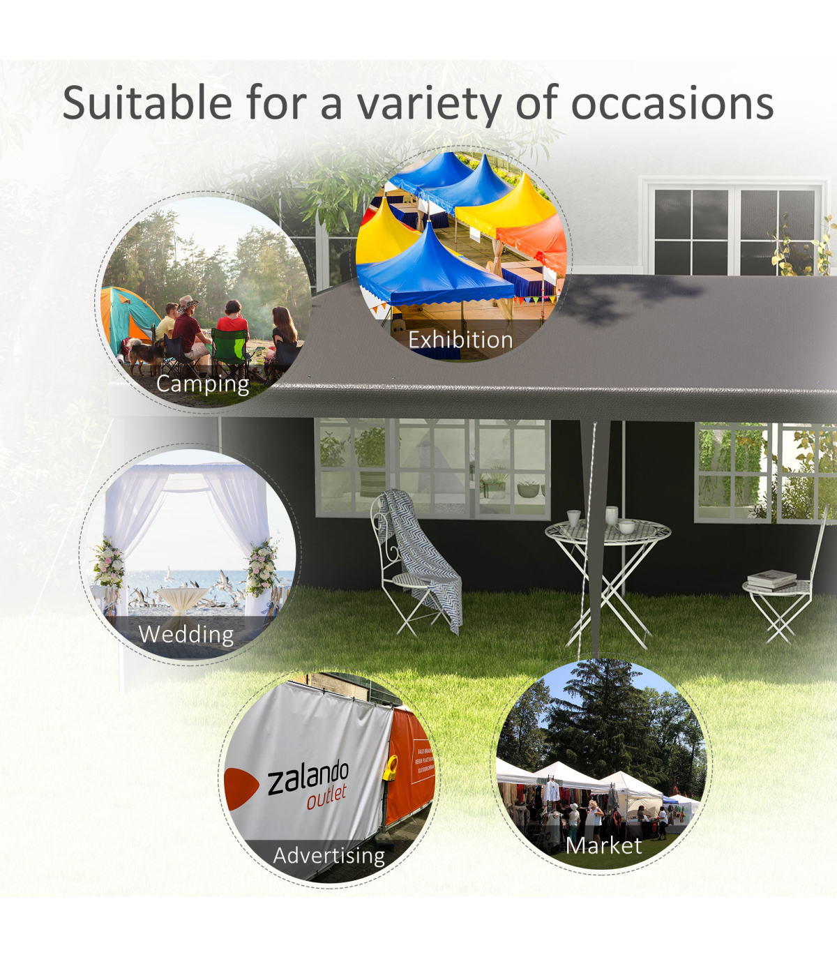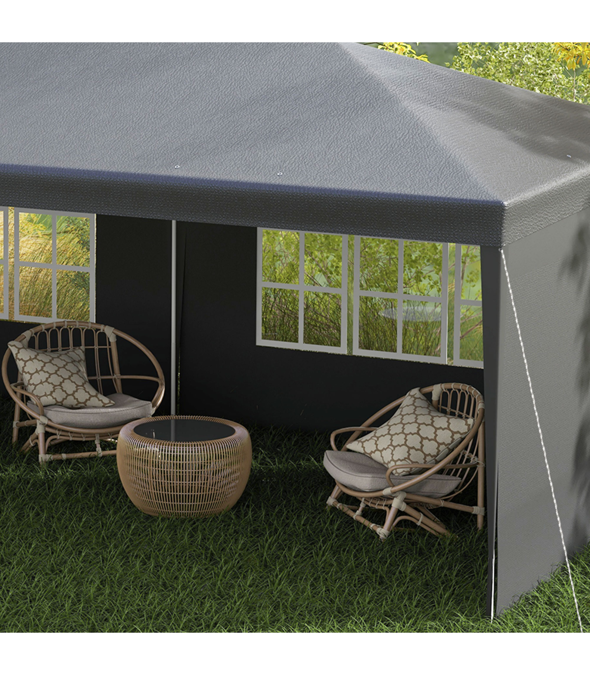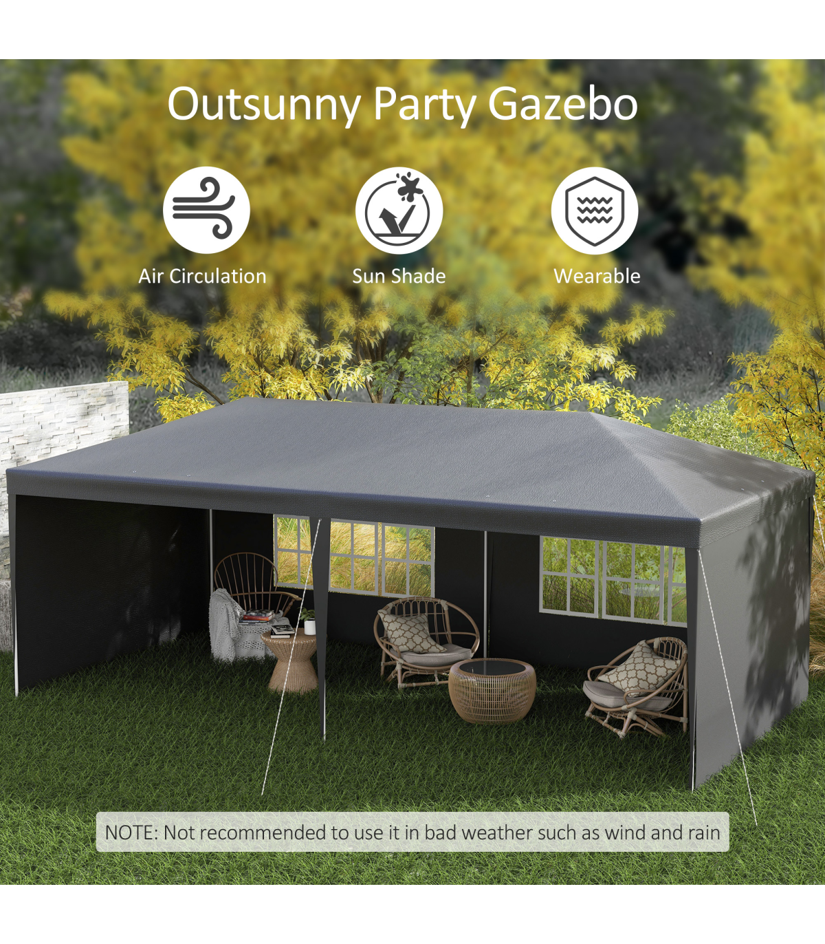 5.83 x 2.95m camping gazebo: Large and spacious, a place to hold garden and outdoor parties, BBQs, family gatherings, birthdays, garage sales - whatever you need it for.Protective canopy: Polyethylene plastic is durable, keeping you protected from direct sunlight and light rain and wind.Simple, easy setup Save time and energy with the quick and easy assembly. Easy to pack away. Adjustable feet keep the gazebo with sides stand even on wobbly ground.Accessories included: 6 x guy ropes and 12 x ground pegs - helps keep party gazebo standing steady.Dimensions: 2.55H x 5.83L x 2.95Wm. Window: 1.77L x 0.99Wm. Do not leave shelter unattended or up in bad weather. Always use with the included guy ropes and pegs.