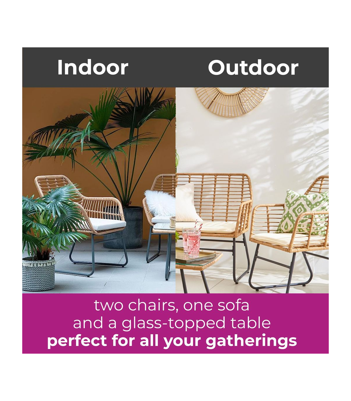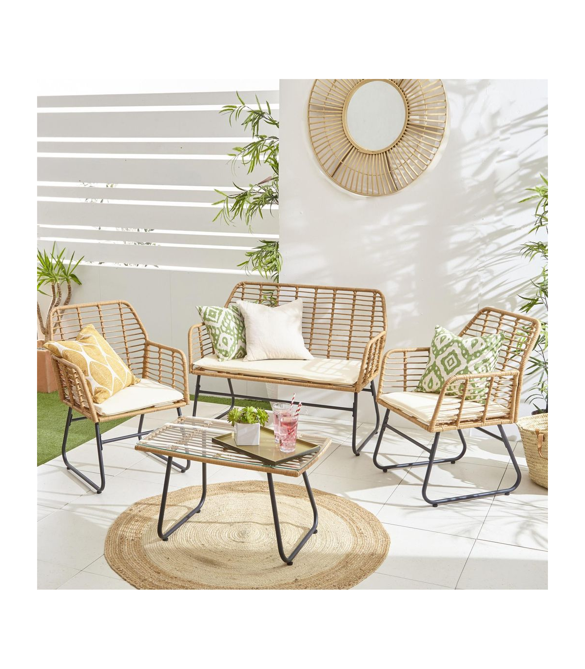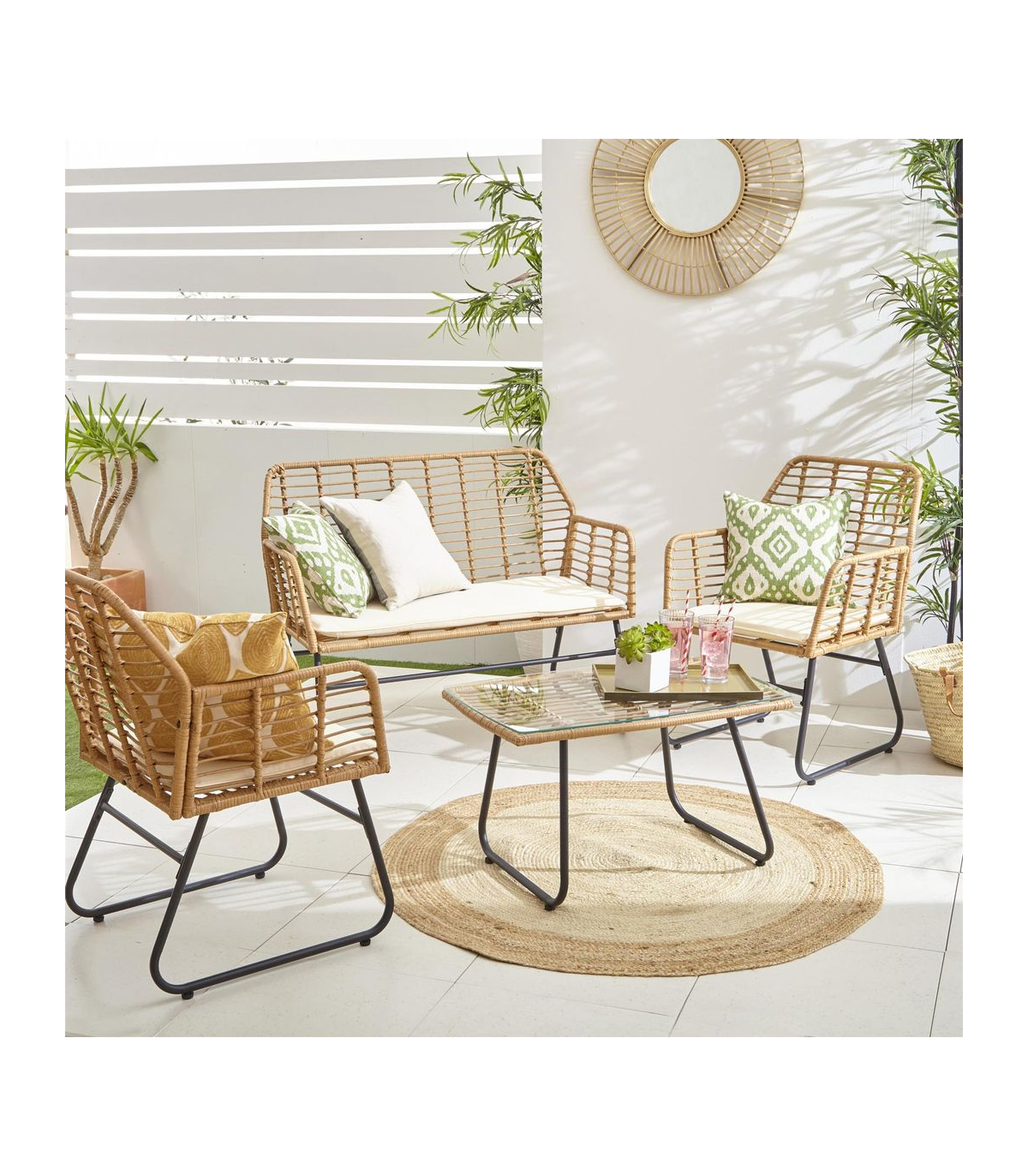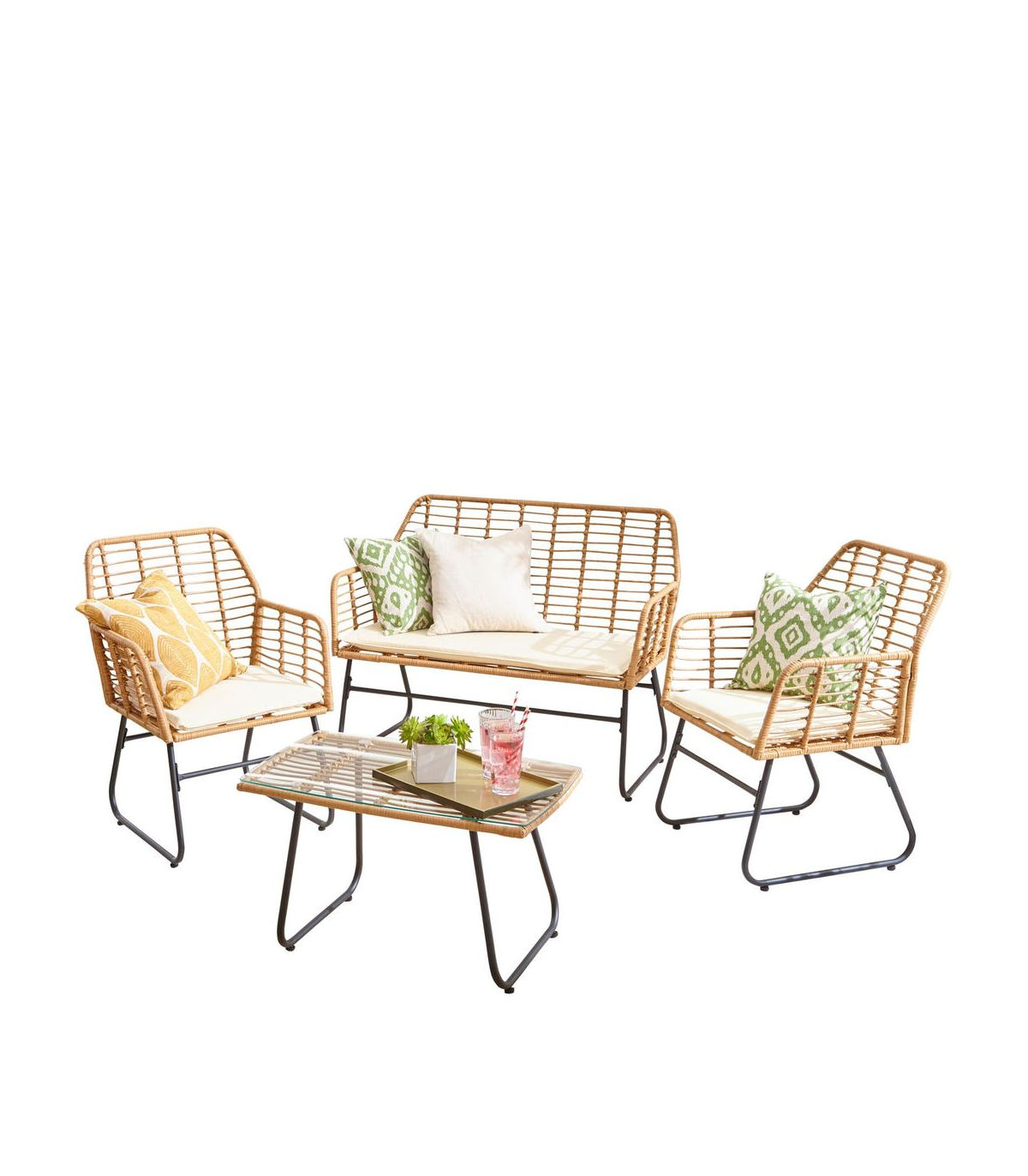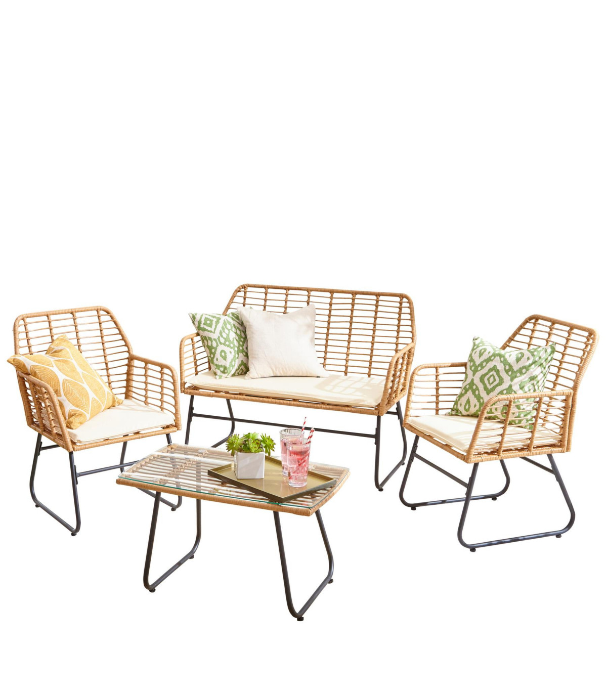- Set Includes: 2 x rattan chairs with seat cushions, 1 x rattan sofa with seat cushions and 1 x glass-topped table
