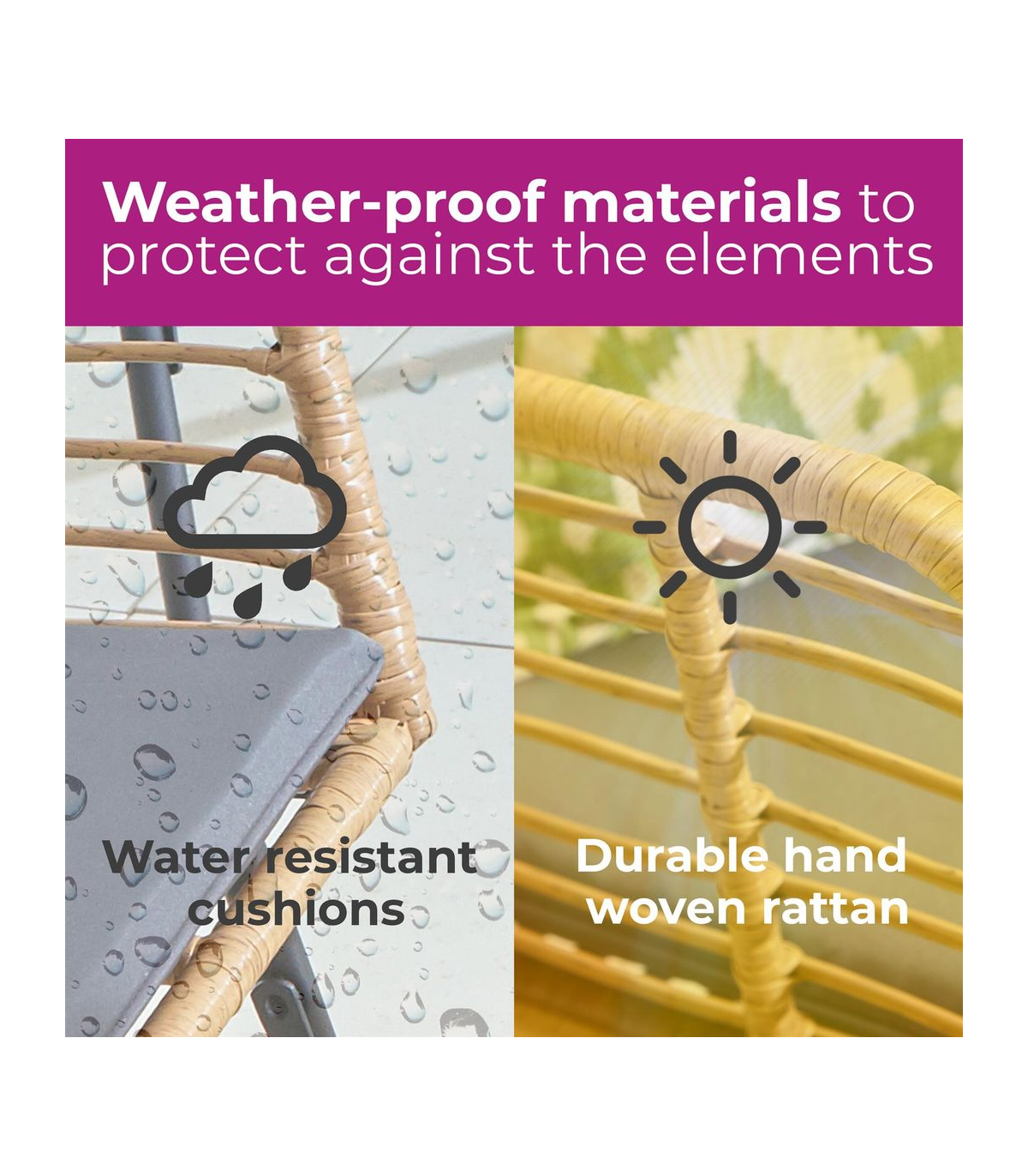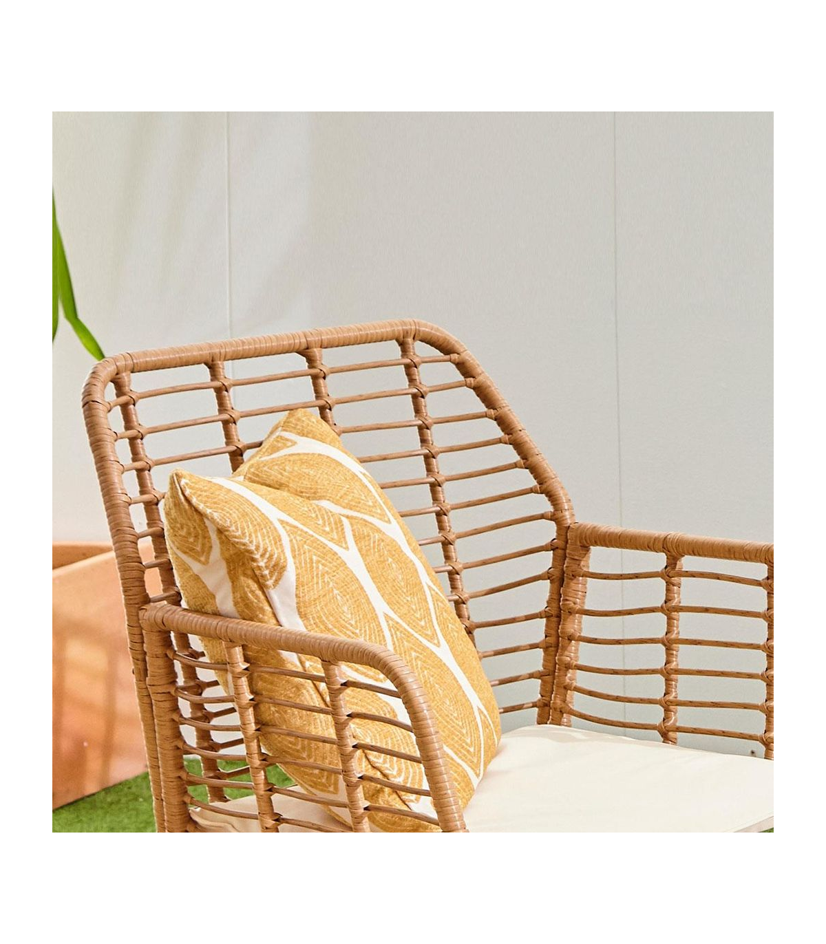 - Polyester foam-filled cushions in cream or grey. The seat material is weatherproof PE rattan with pipe detailing around the edges of the cover.