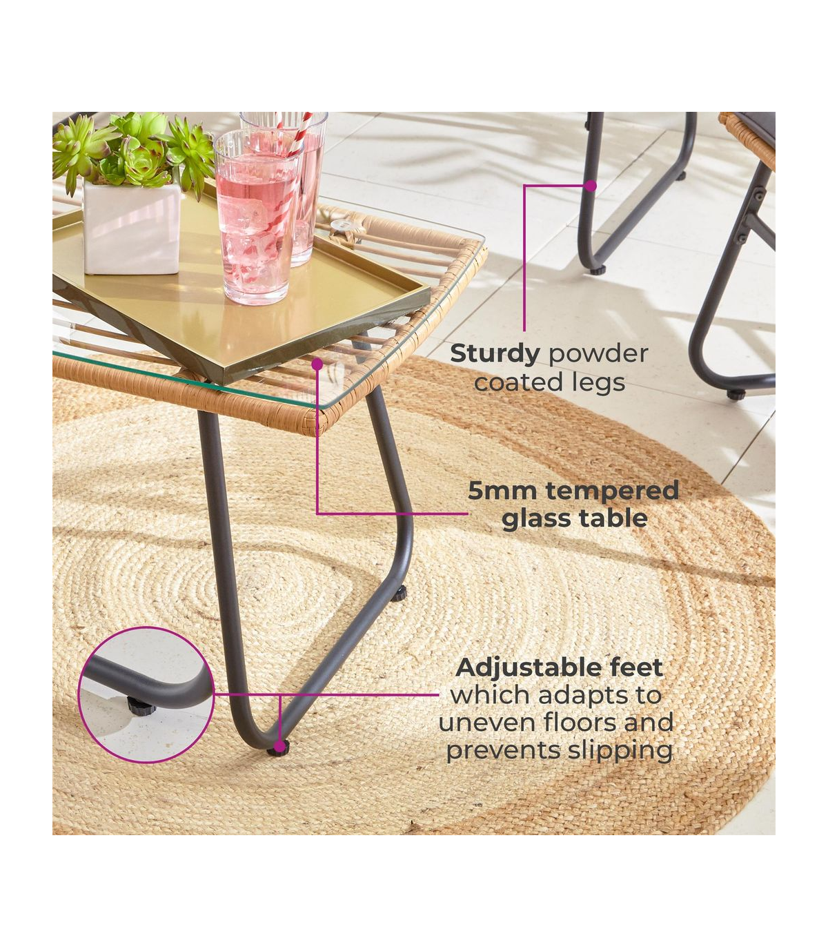 - Strong 5mm tempered glass-topped table