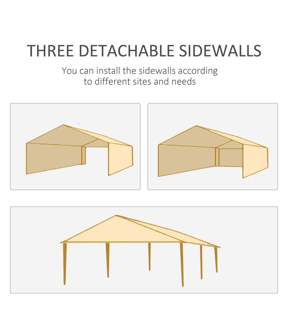 This Outsunny marquee gazebo with sides is shelter when entertaining guests outdoors. It's formed of a steel frame for a tough structure, with a durable plastic canopy roof and side shell - there is no front for an open feeling. Six guy ropes and 12 ground pegs are included to make the party gazebo pin to the ground for extra stability. For many events like BBQS, family parties, wedding receptions, BBQs and more. Finished with handy adjustable feet.