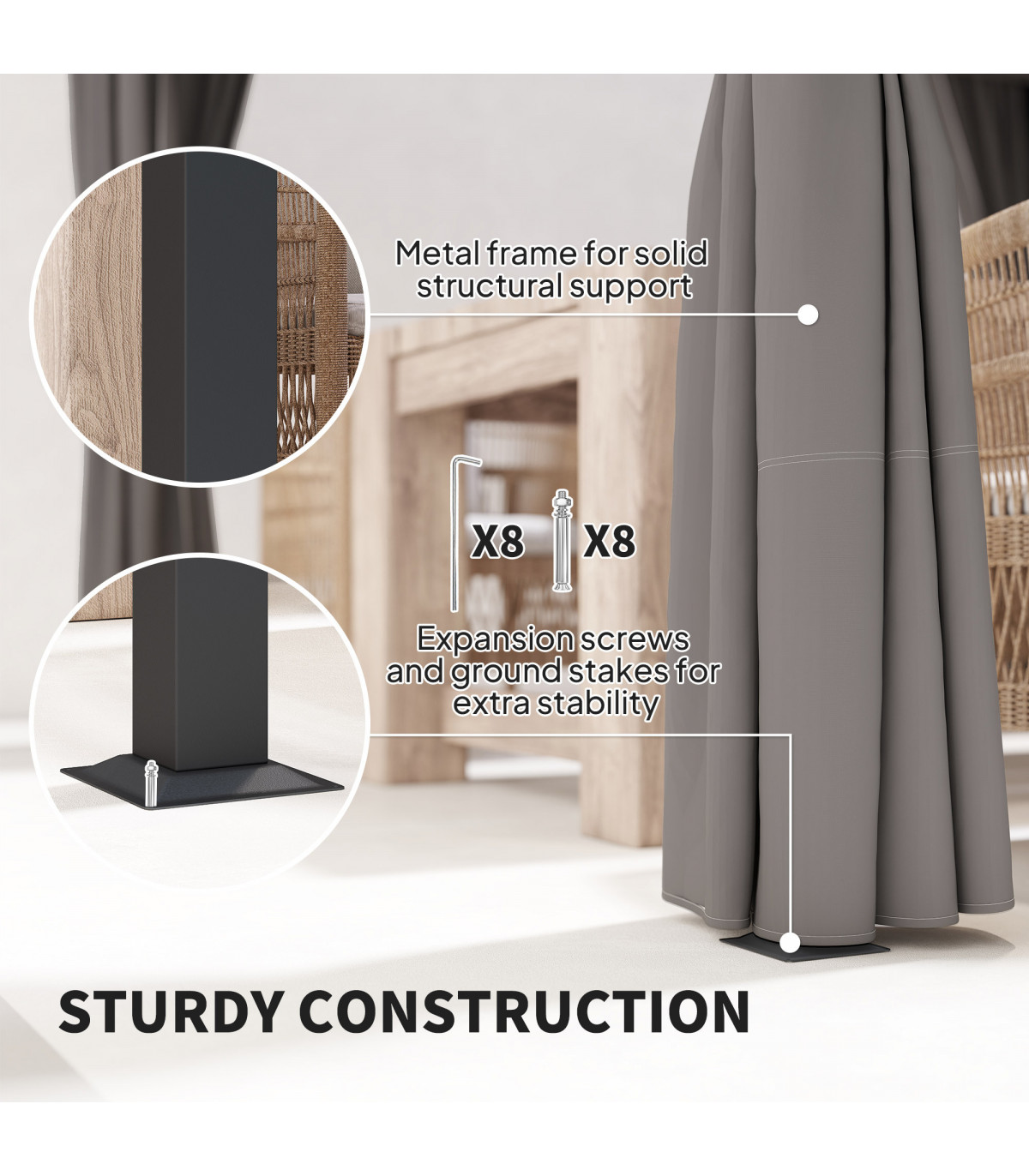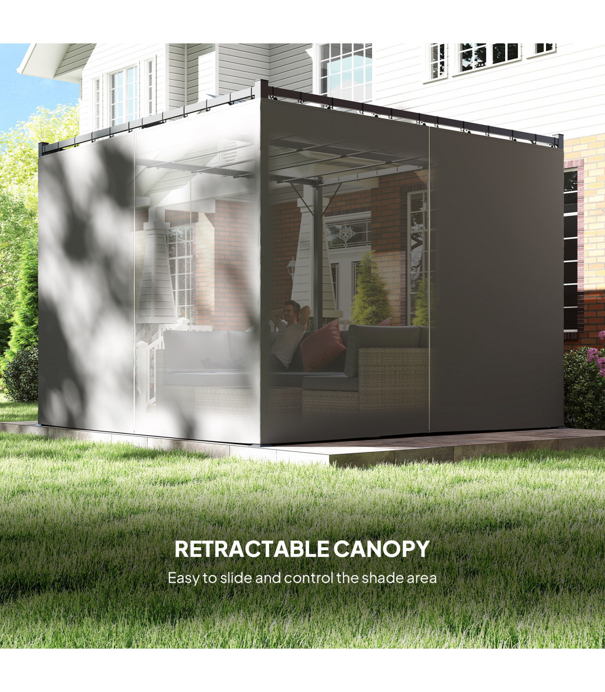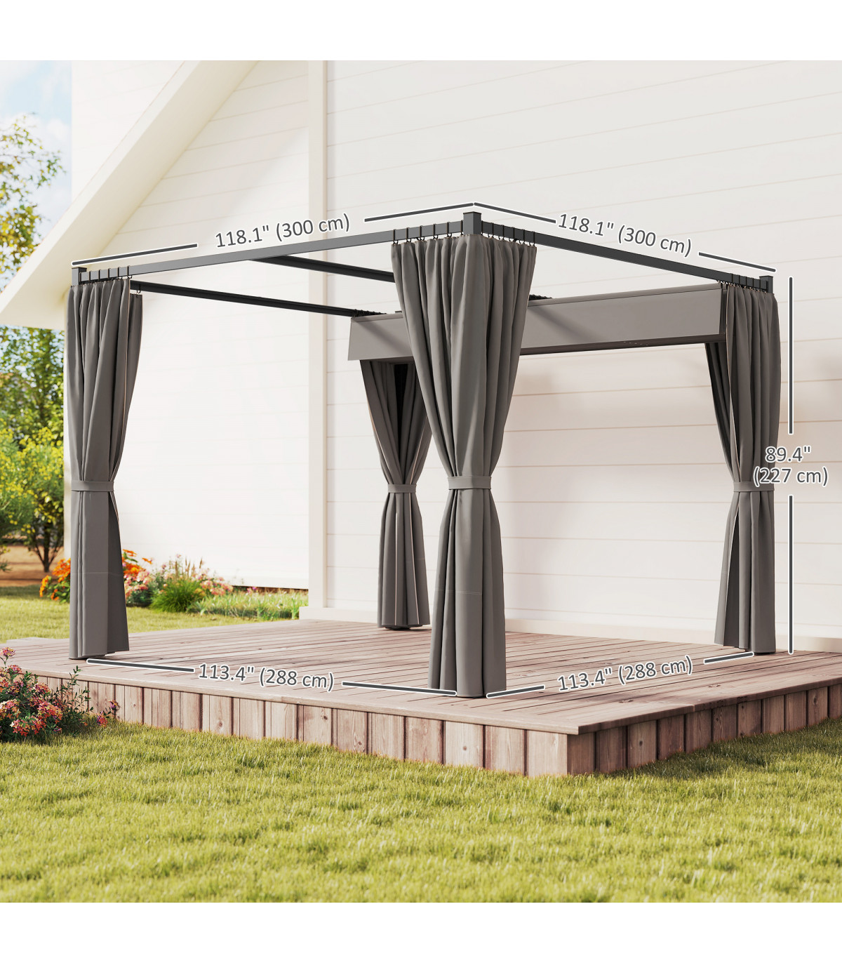 - "Outsunny 3 x 3(m) Pergola with Retractable Roof and Curtains, Light Grey" - Description: - PU-coated polyester canopy is retractable, slides to keep you protected from the sun - Curtains provide shade and privacy - Metal frame is strong and rust-resistant - Includes ground stakes and expansion screws for pinning to the ground - Suitable for gardens and outdoor areas - Assembly required - Colour: Light Grey - Materials: Metal, Polyester - Overall Dimensions: 300L x 300W x 227Hcm - Column Spacing: 288L x 288Wcm - Column Size: 6L x 6Wcm - Windproof Level: 4-5 (use ground stakes), 5-6 (use expansion screws) - Item Label: 84C-441V00LG - NOTE: Not recommended for use in extreme weather conditions