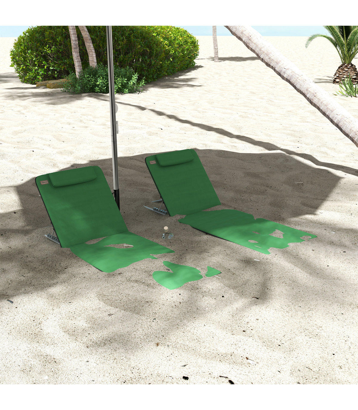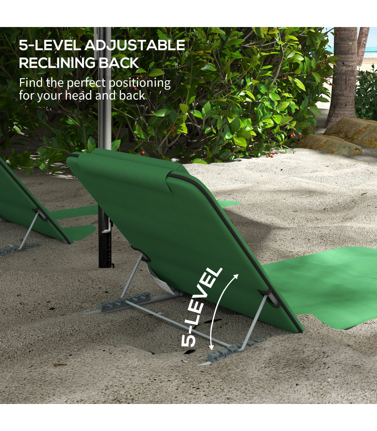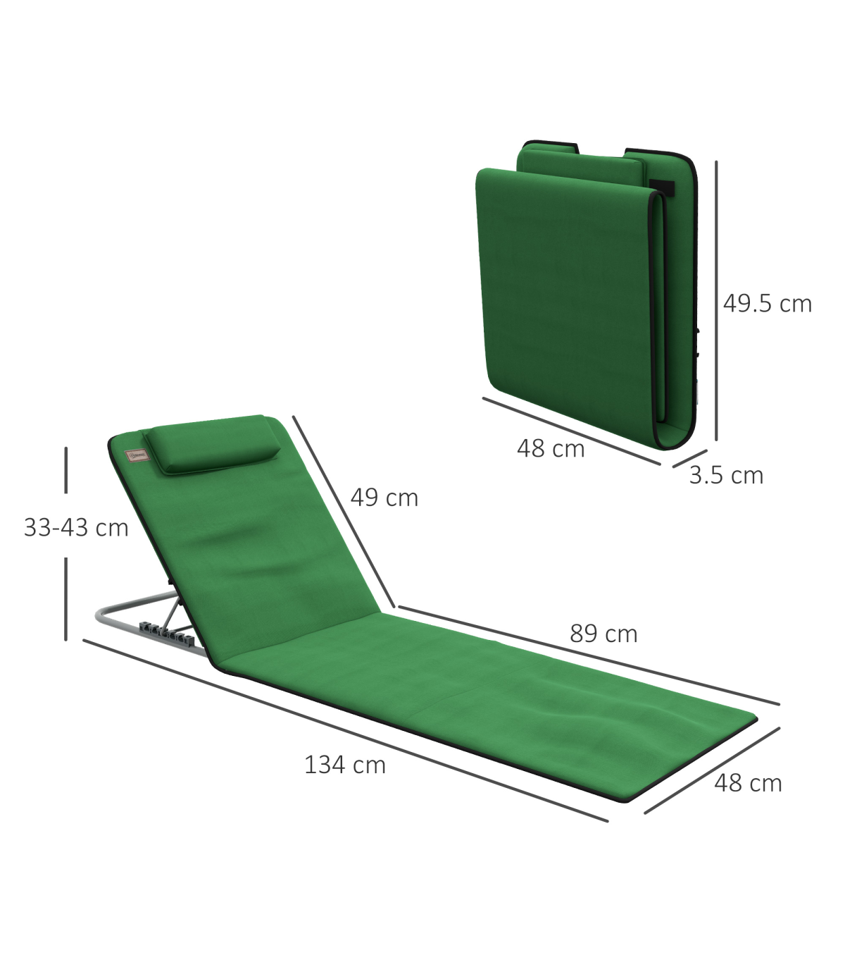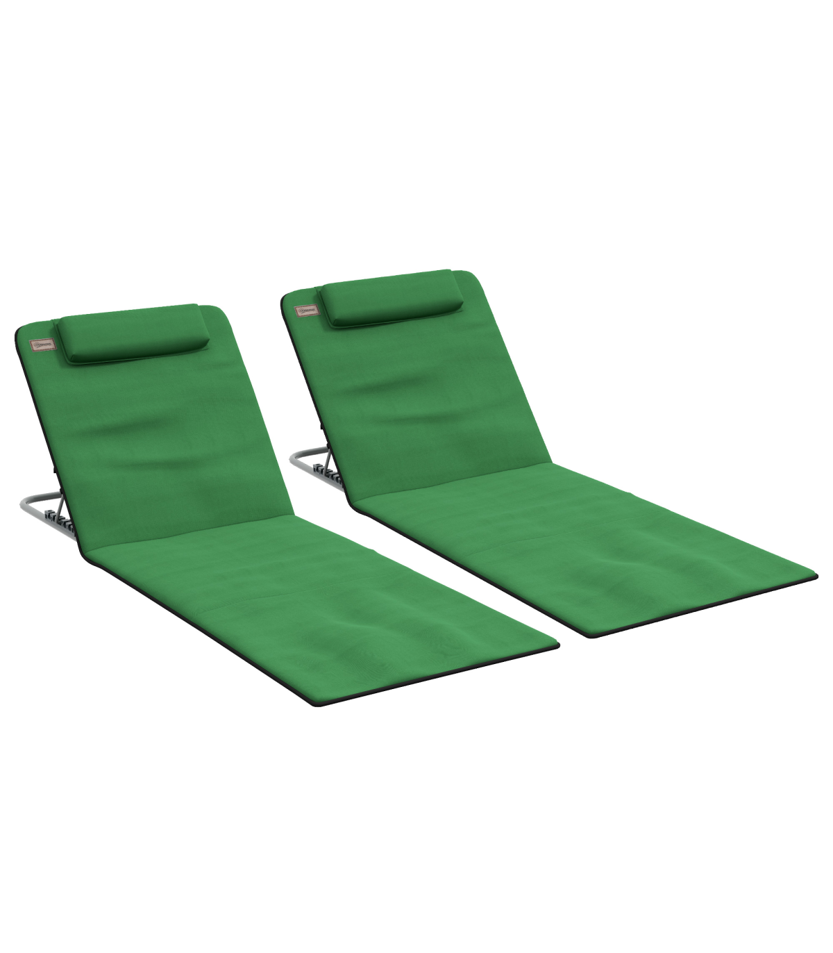 - "Outsunny 2 Pieces Outdoor Beach Mat Steel Reclining Chair Set with Pillow Green" - Description: - Set of two deluxe ground mats, perfect for going to a beach with a friend - Five-angle adjustable back, allows you to set to a level which is most comfortable for you - Powder coated steel frame for a strong and tough core which stays in shape - Pillow on the seat for comfort and support to your head and neck - Firmly stretched fabric seat for balance and support to your body - Foldable design, with bag included for easy carrying - Item Name: Beach Mat with Backrest - Brand Name: Outsunny - Material: - Steel Frame - PE Fabric - EPE Cotton - Colour: Green - Overall Dimension: 48W x 134D x 36-45H cm - Seat Dimension: 48W x 89D cm - Folding Dimension: 49.5L x 48W x 3.5H cm - Net Weight: 3.6kg - Flat Pack: Yes - Custom Label: 84B-455V70GN