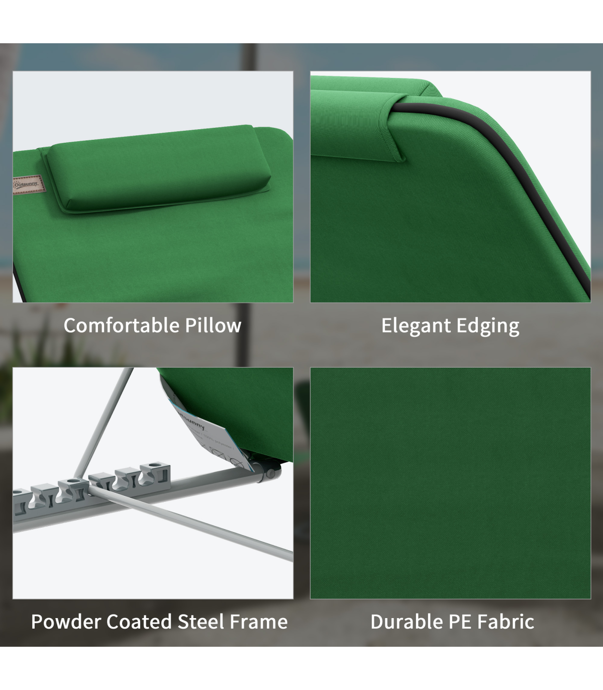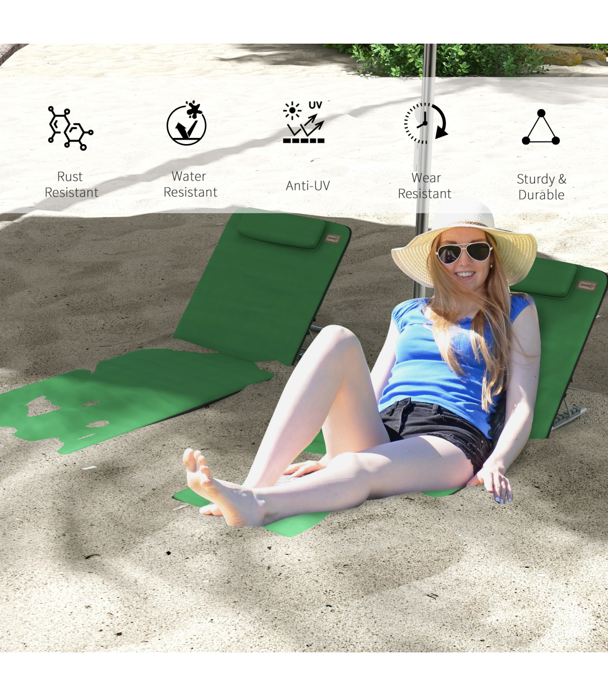 Outsunny 2 Pieces Outdoor Beach Mat Steel Reclining Chair Set with Pillow Green