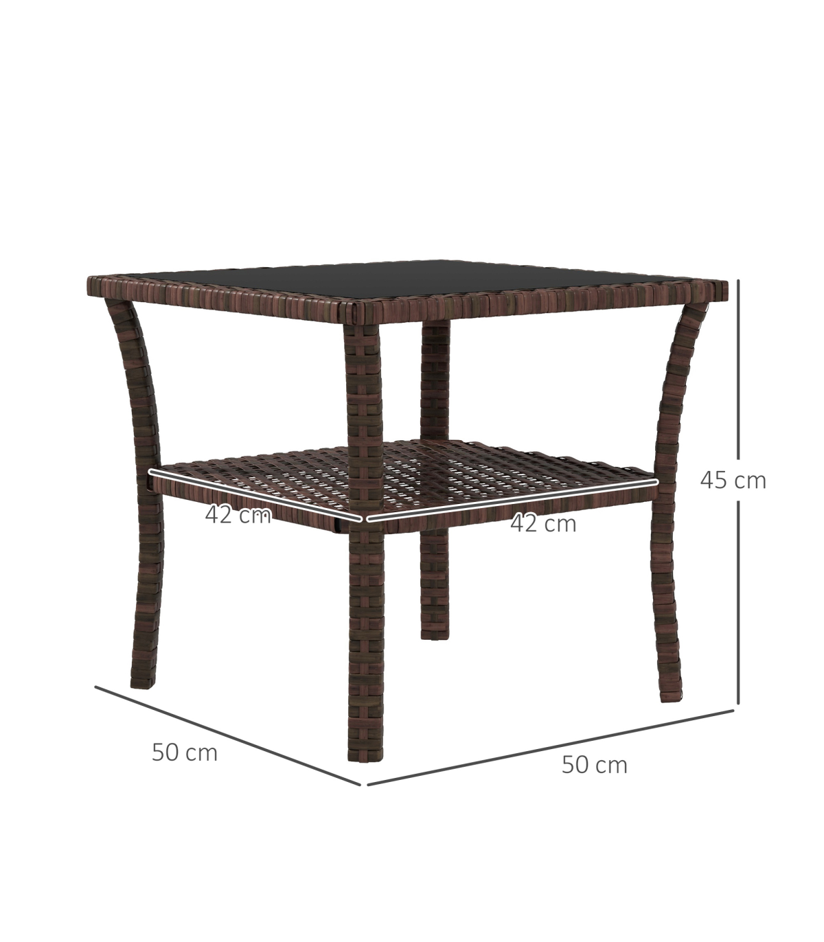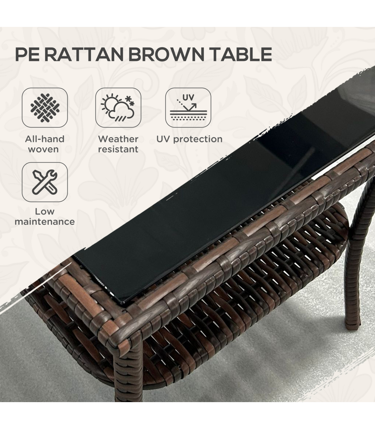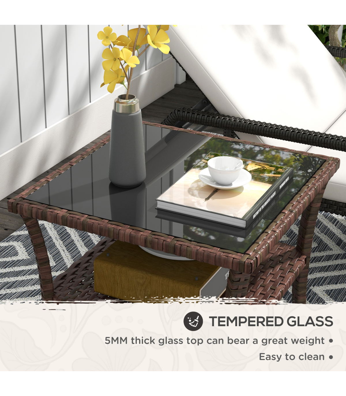 offering double the durability and a garden-ready look. The tempered glass tabletop means a safe and solid dining surface which can be easily wiped clean. With a bottom shelf, you can also keep small pieces close altogether.