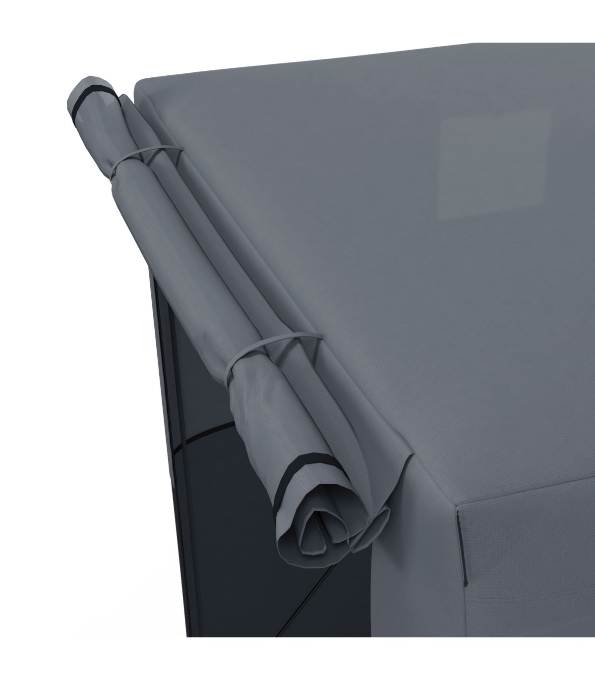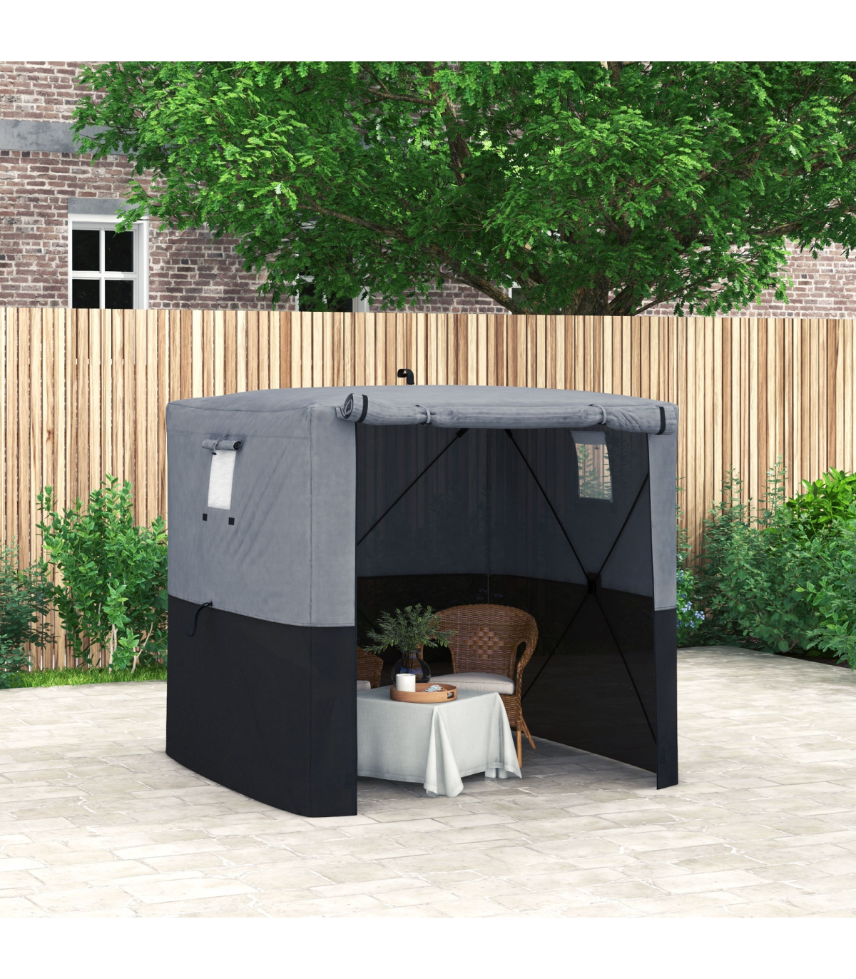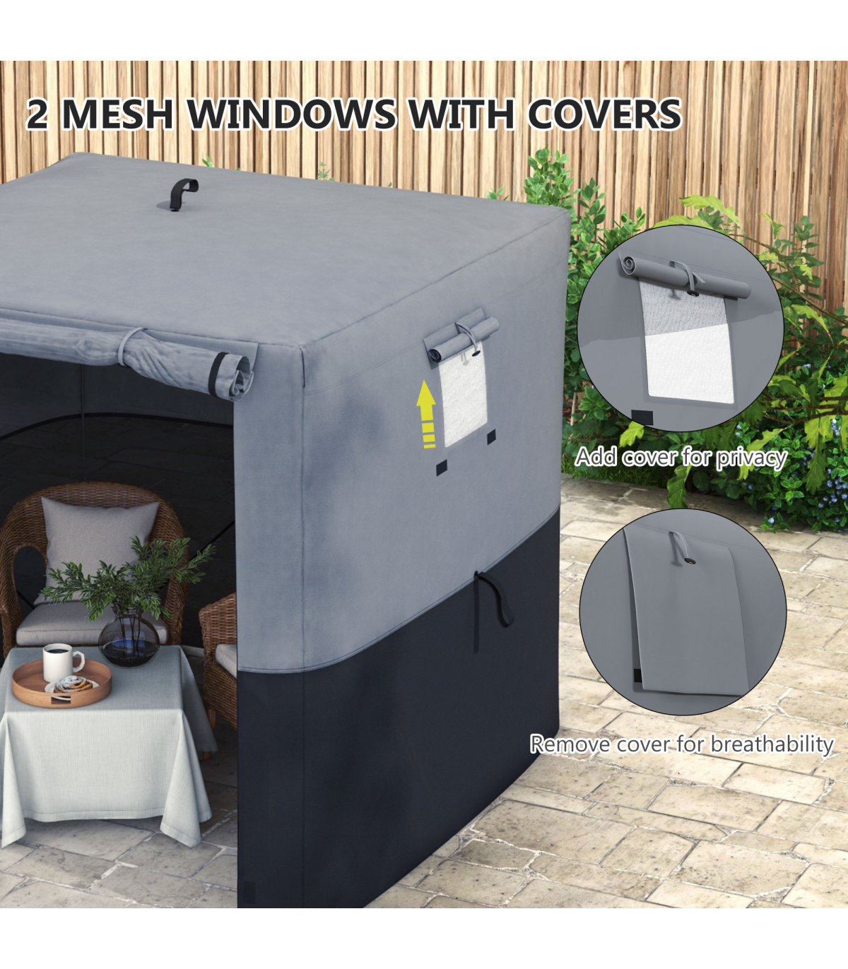 ? Two mesh windows to bring fresh air and light inside, with covers for privacy when needed