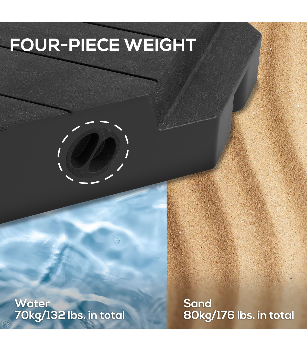 ? The whole set weighs 60kg when filled with water or 80kg when filled with sand