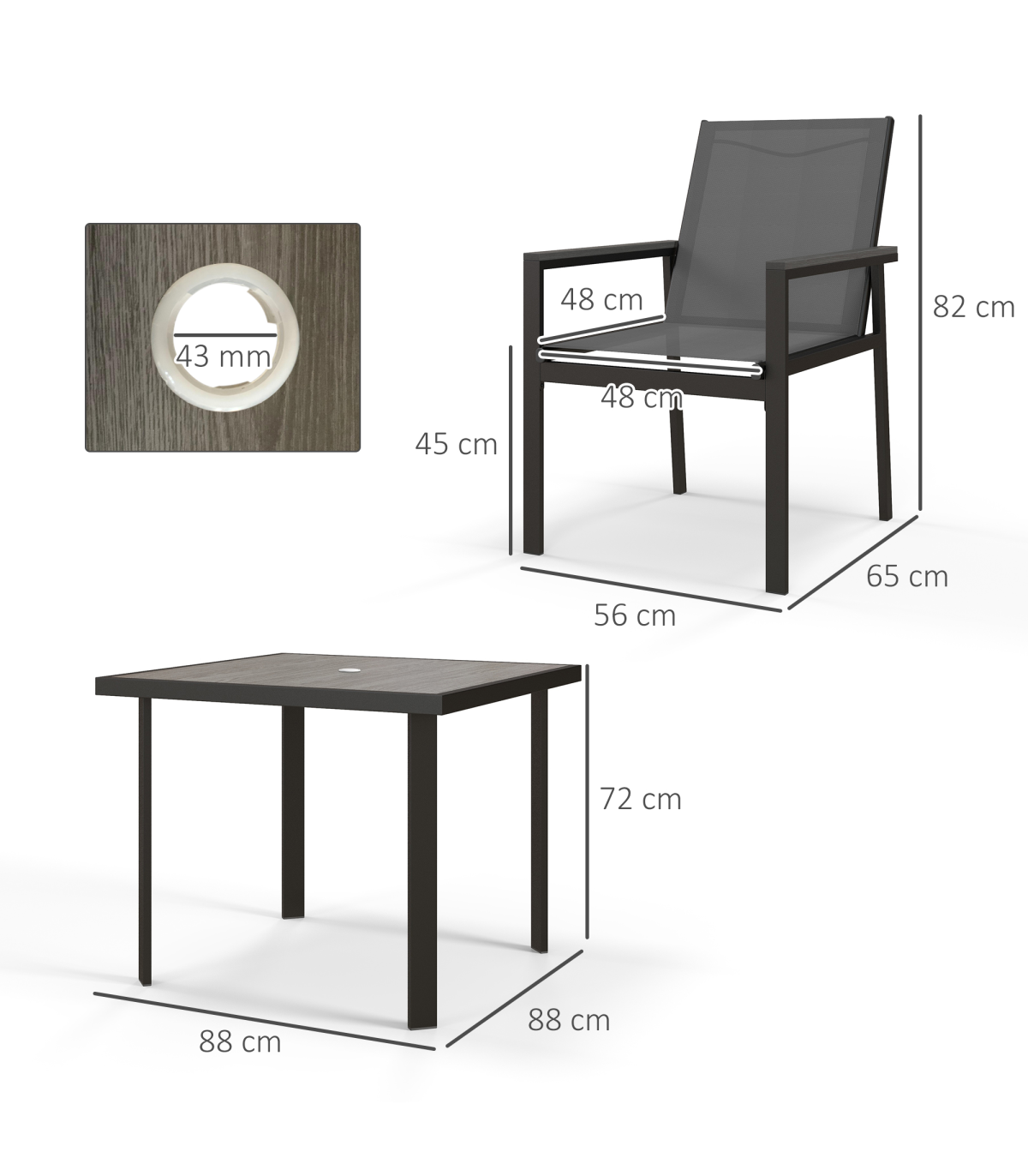 ? 43 mm dia. hole in centre of the table, for holding parasol umbrellas