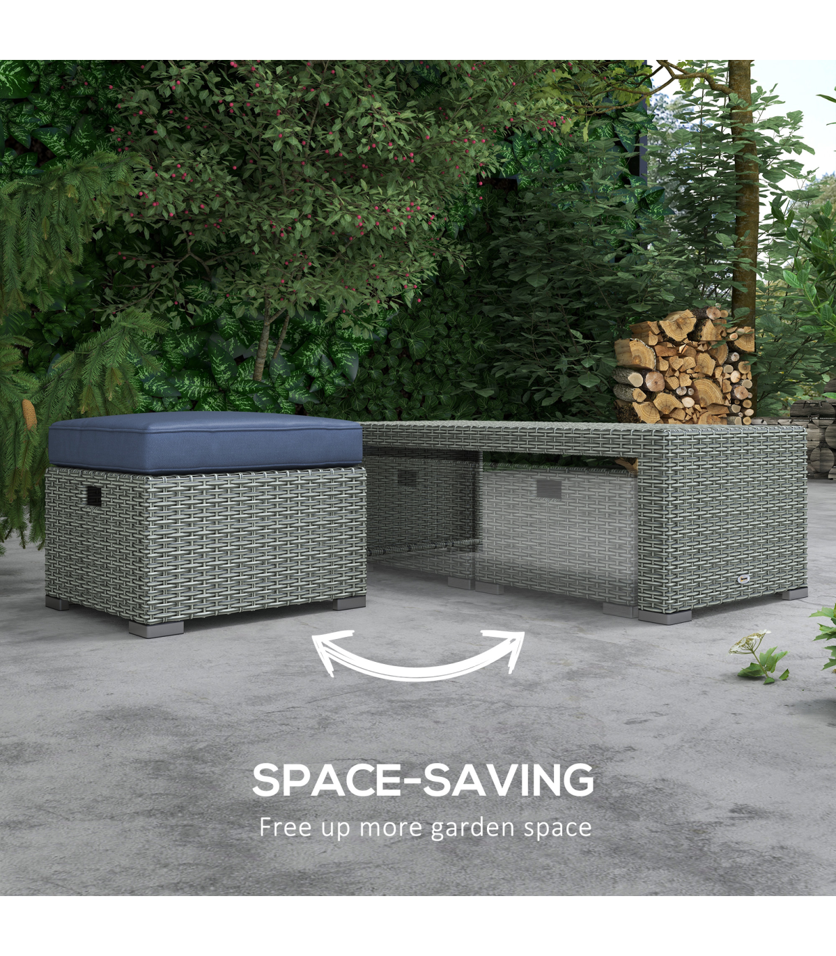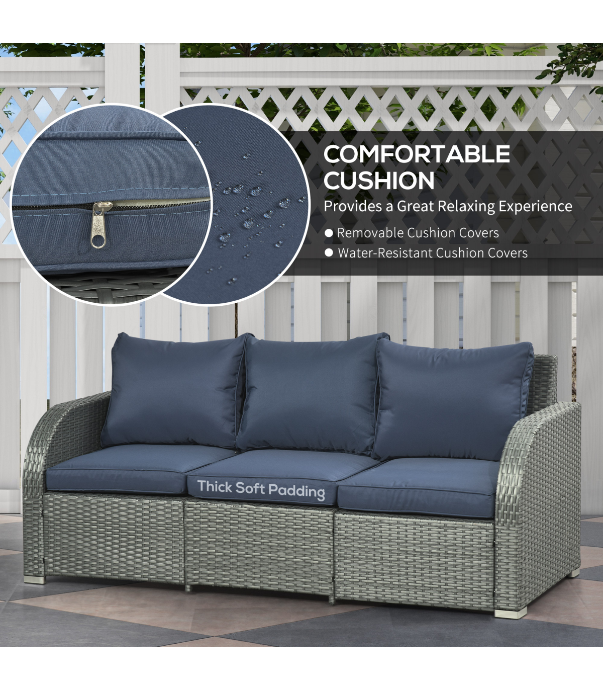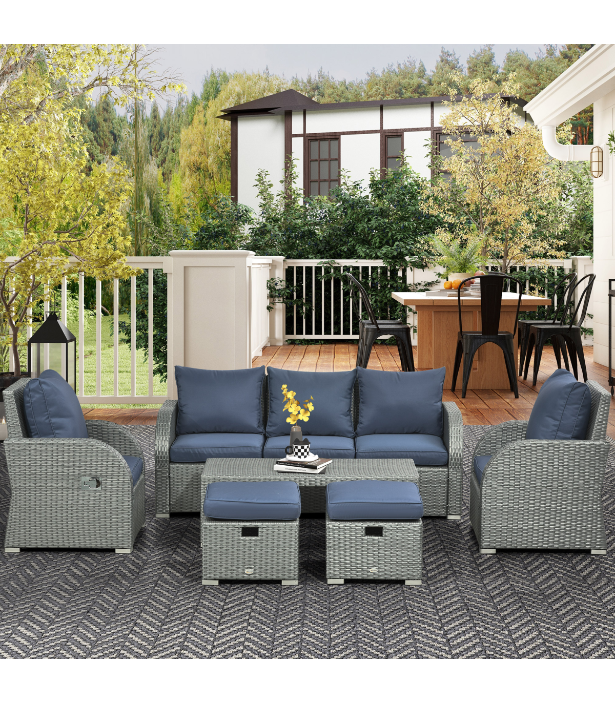- "Outsunny 6pc Padded Outdoor Rattan Wicker 3-Seat Sofa Recliner Footstool Table" - Description: - Six-piece set: - Two reclining armchairs - Three-seater sofa - Two footstools - Matching table - Armchairs recline between 90° and 130° - Powder coated steel frame for strength, wrapped in UV and water-resistant rattan - Padded seat cushions for comfort, with removable and washable covers - Anti-slip foot pads for balance and floor protection - Assembly required - Colour: Blue - Material: - PE Rattan - Steel - Fabric - Sponge - 3-seat Sofa Size: 172W x 67D x 73Hcm - Seat Size: 156W x 57Dcm - Single Recliner Size: 75W x 69D x 81Hcm - Seat Size: 59W x 51Dcm - Seat to Floor Height: 30cm - Coffee Table Size: 112L x 52W x 38Hcm - Footstool Size: 46Lx 52W x 30Hcm - Weight Capacity: - 160kg/per seat - 70kg(Table) - Item Label: 860-105V70BU