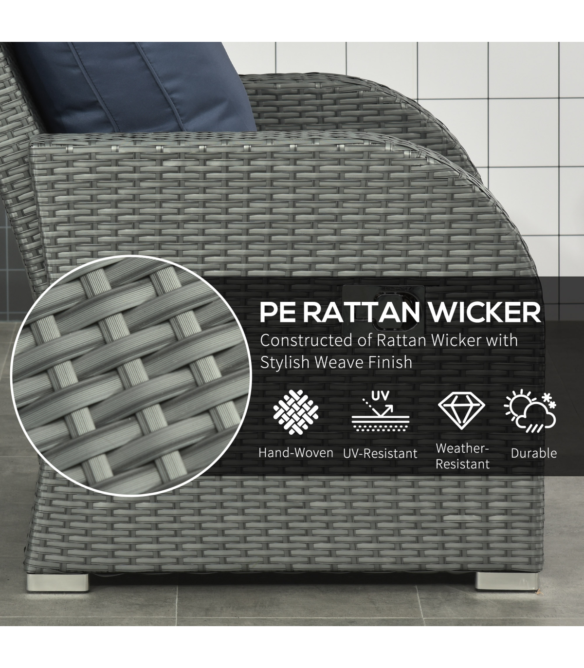 This Outsunny six-piece set is the ultimate for satisfying relaxation in your garden. Using powder coated steel for a robust and sturdy frame, each piece is wrapped in plastic wicker: protects against mild weathering and creates a stylish look. Both armchairs feature a 90�-130� reclining back, complete with thick padded cushions to sit comfortably all day long.