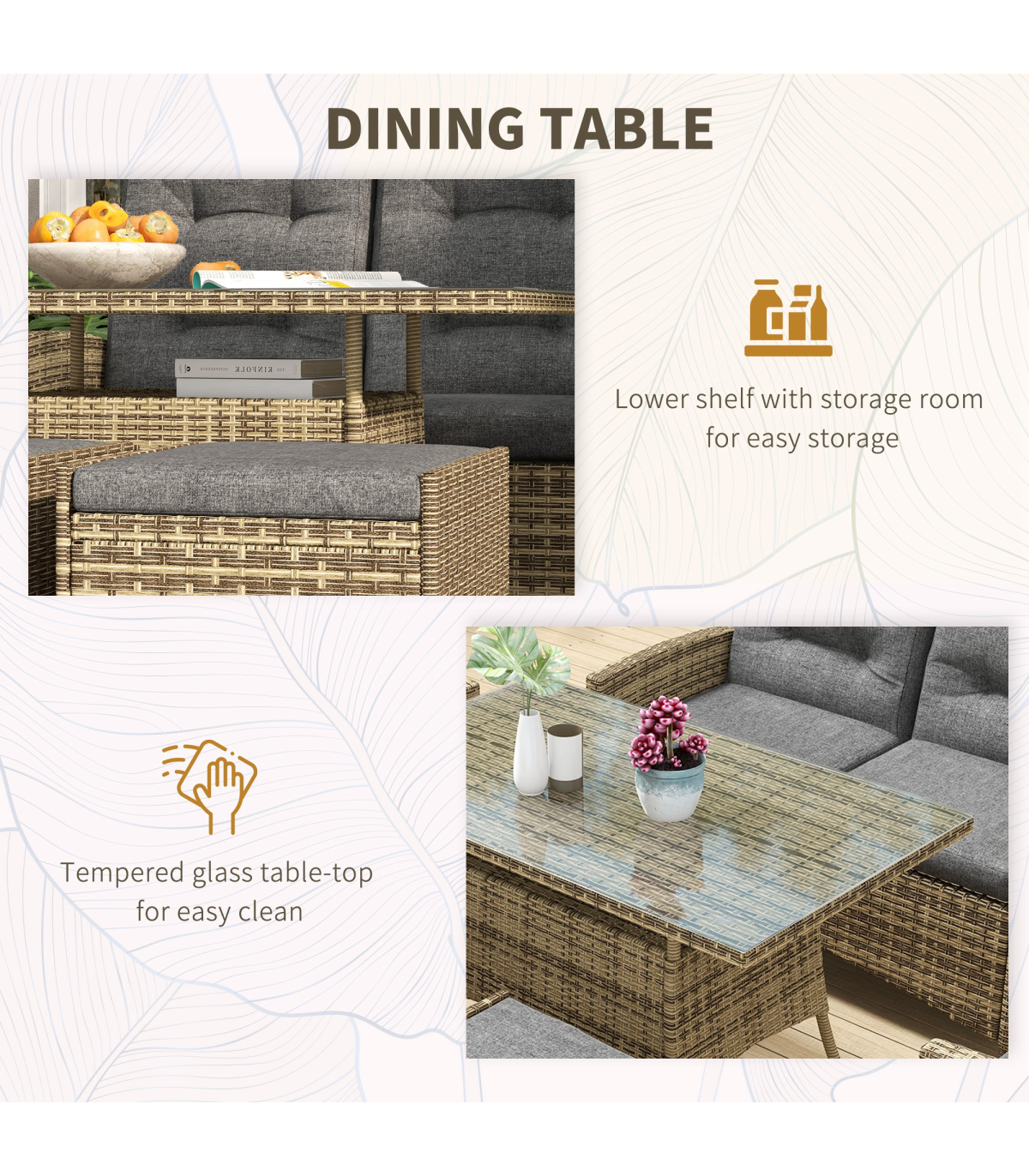 ● Dining table features tempered glass top and handy shelf