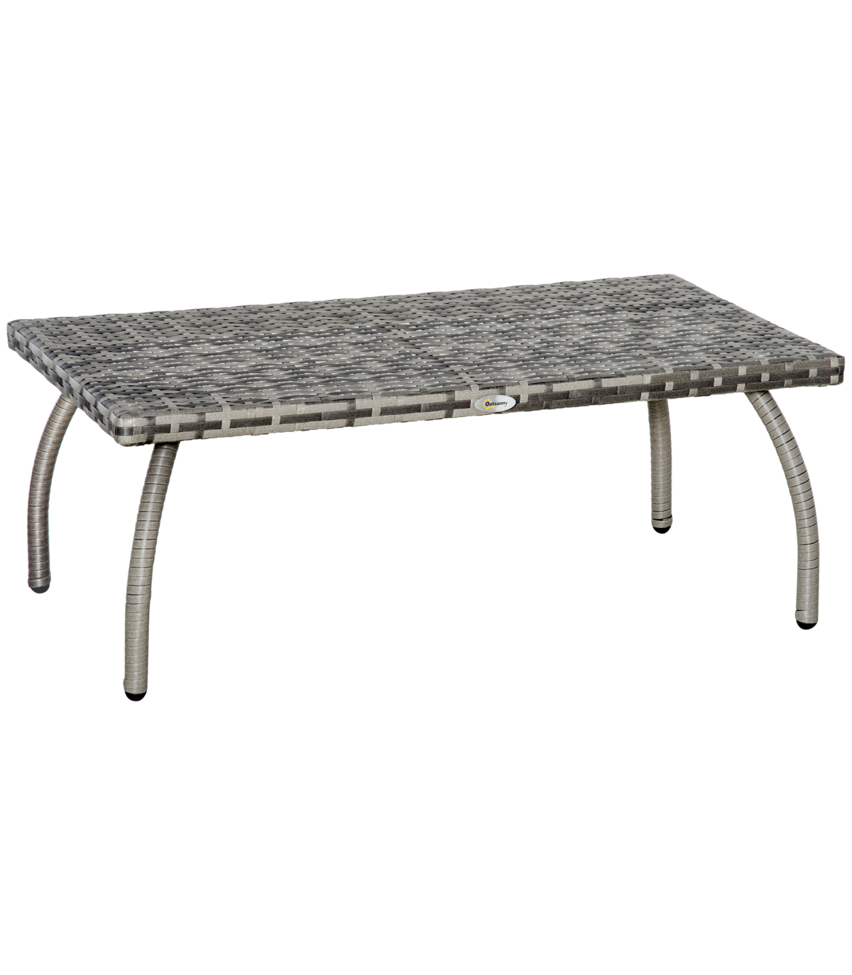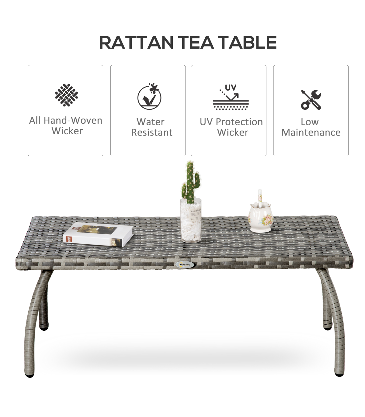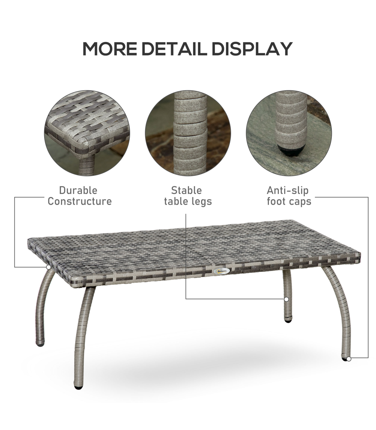 This rectangle, lightweight, durable, and stylish coffee table by Outsunny will become the focal point of your garden or patio. The all-hand-woven PE rattan is wrapped around a metal frame, while 4 table legs provide stability and durability while in use. Furthermore, the tabletop lined with a PP board creates a flat, stable area while being easily wiped for cleaning. Enjoy your tea time with this Outsunny end table.