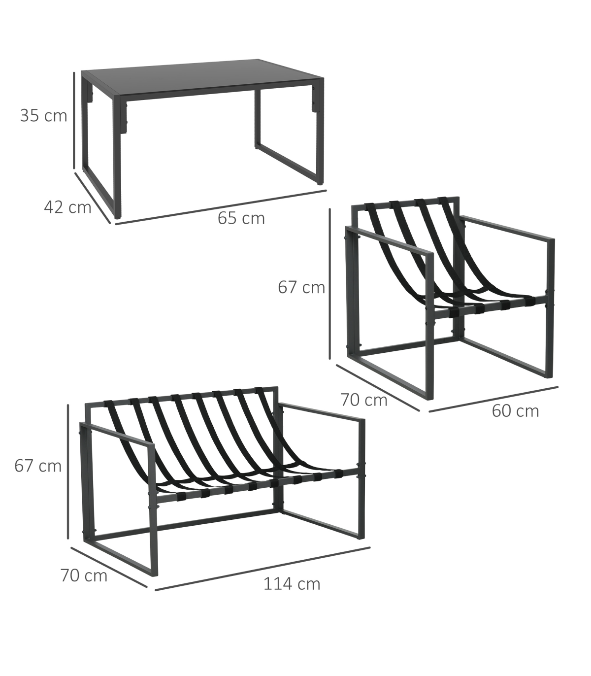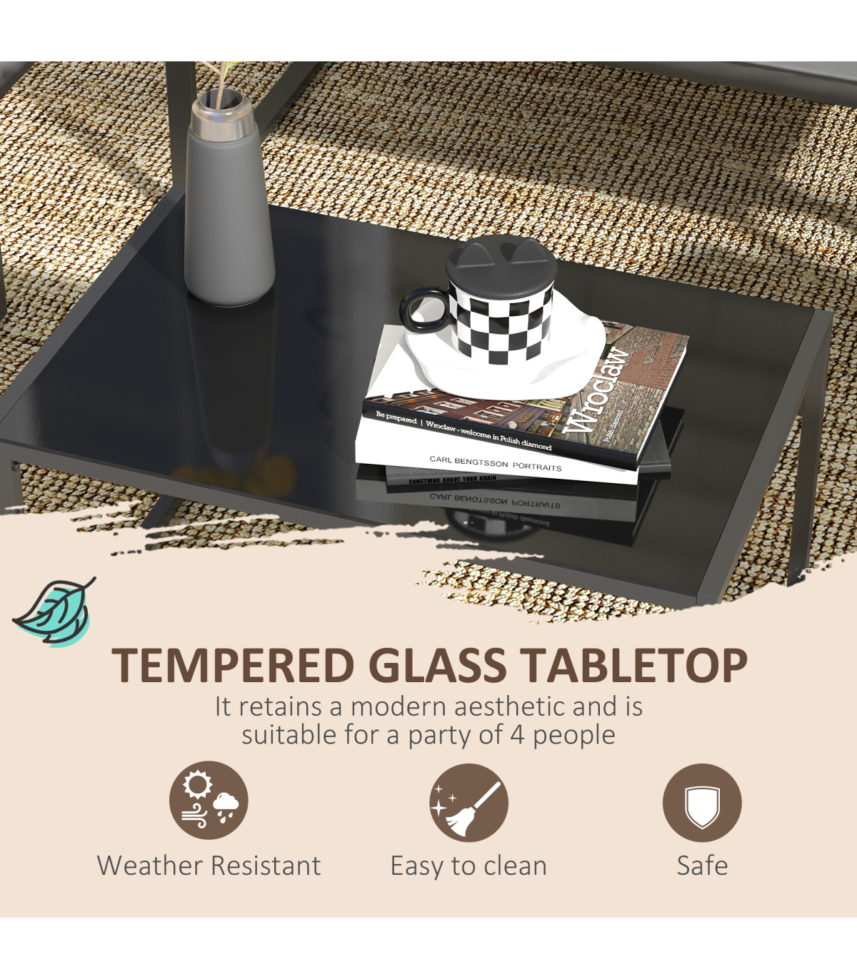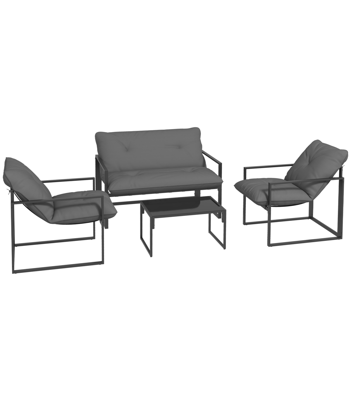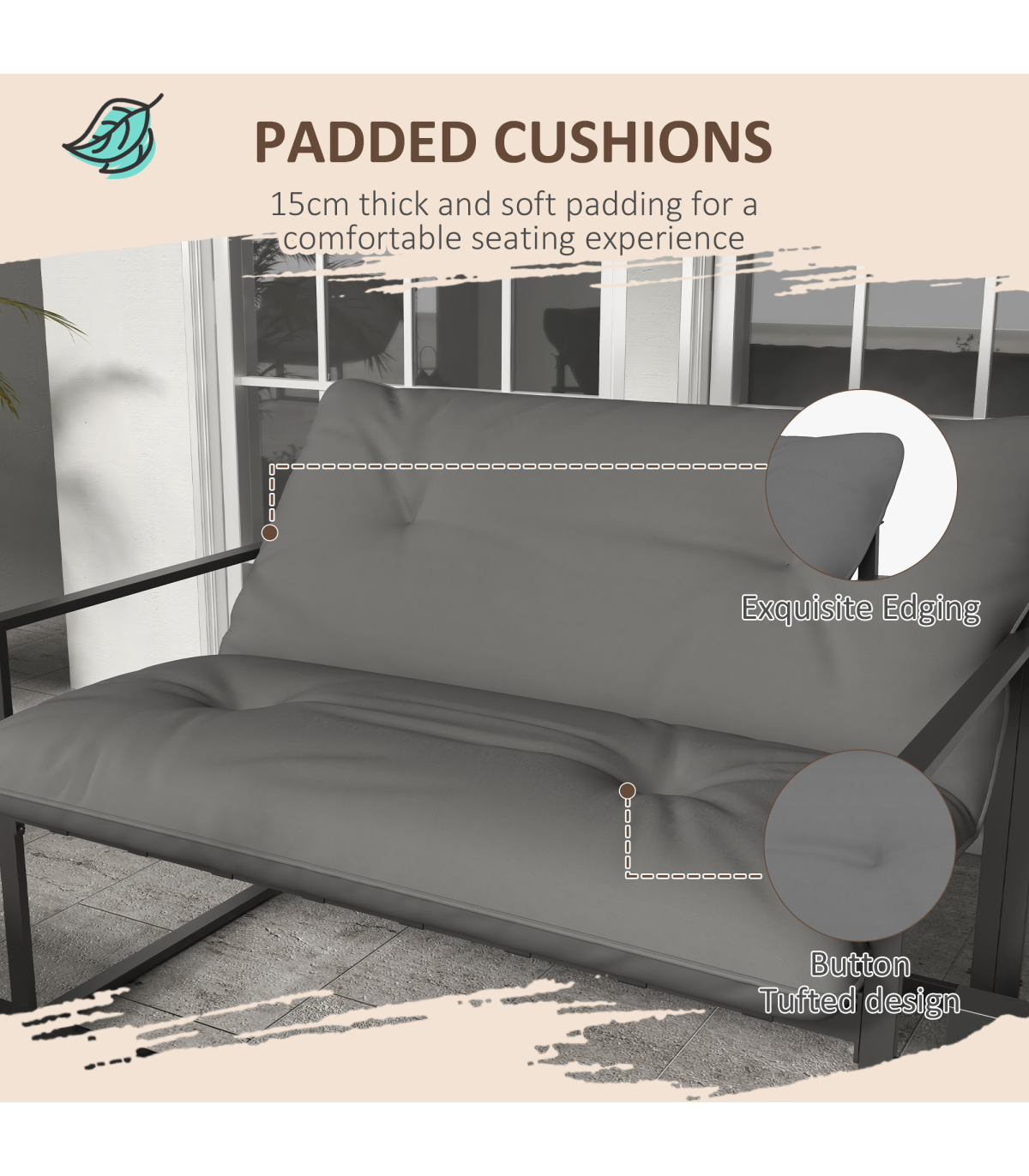 all with steel frame for a tough and strong structure. Thick padded cushions on the seats and backs for comfort as you relax. A tempered glass on the long table adds a beautiful finish, with protective pads on each foot for balance.