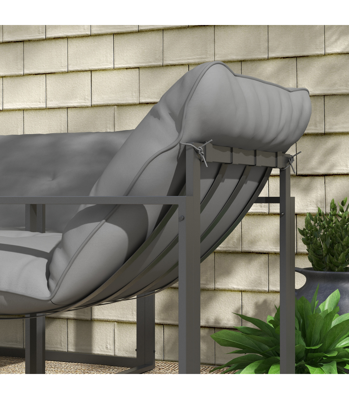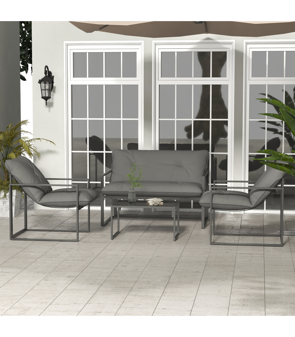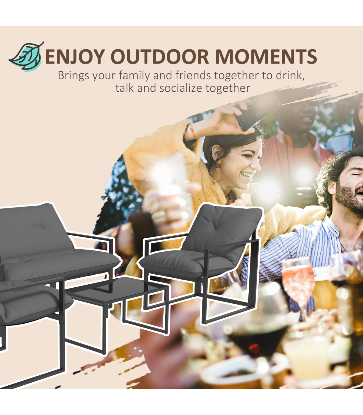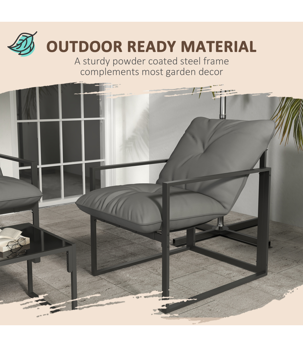 all with steel frame for a tough and strong structure. Thick padded cushions on the seats and backs for comfort as you relax. A tempered glass on the long table adds a beautiful finish, with protective pads on each foot for balance.