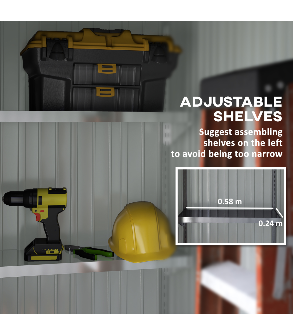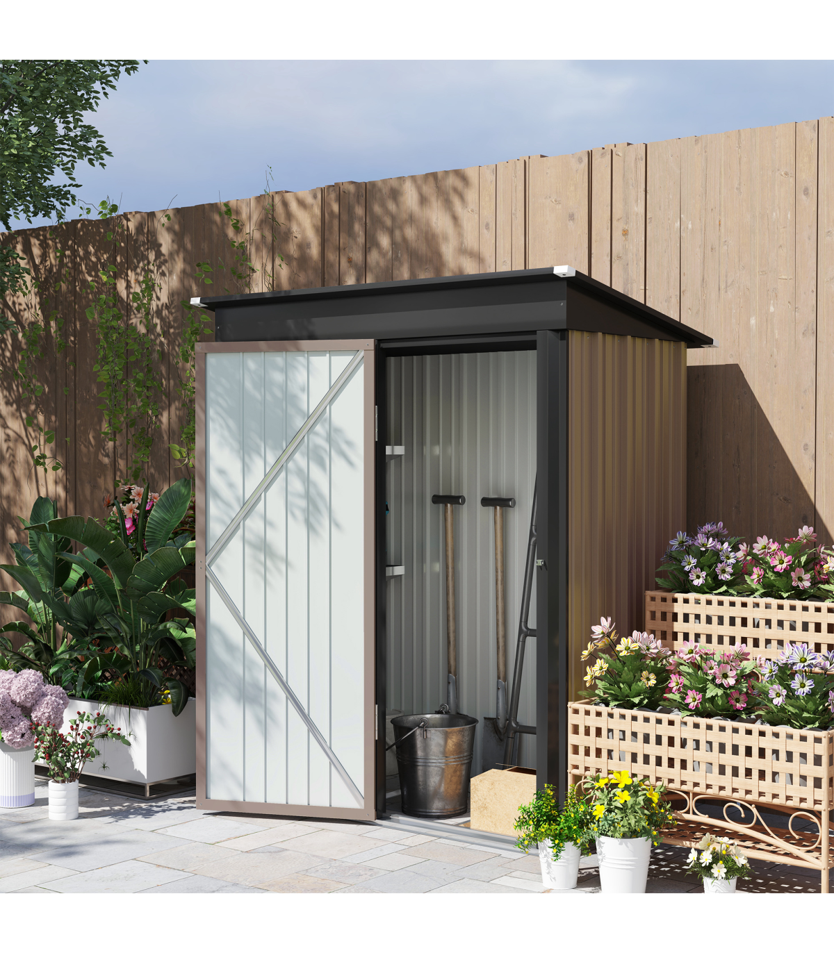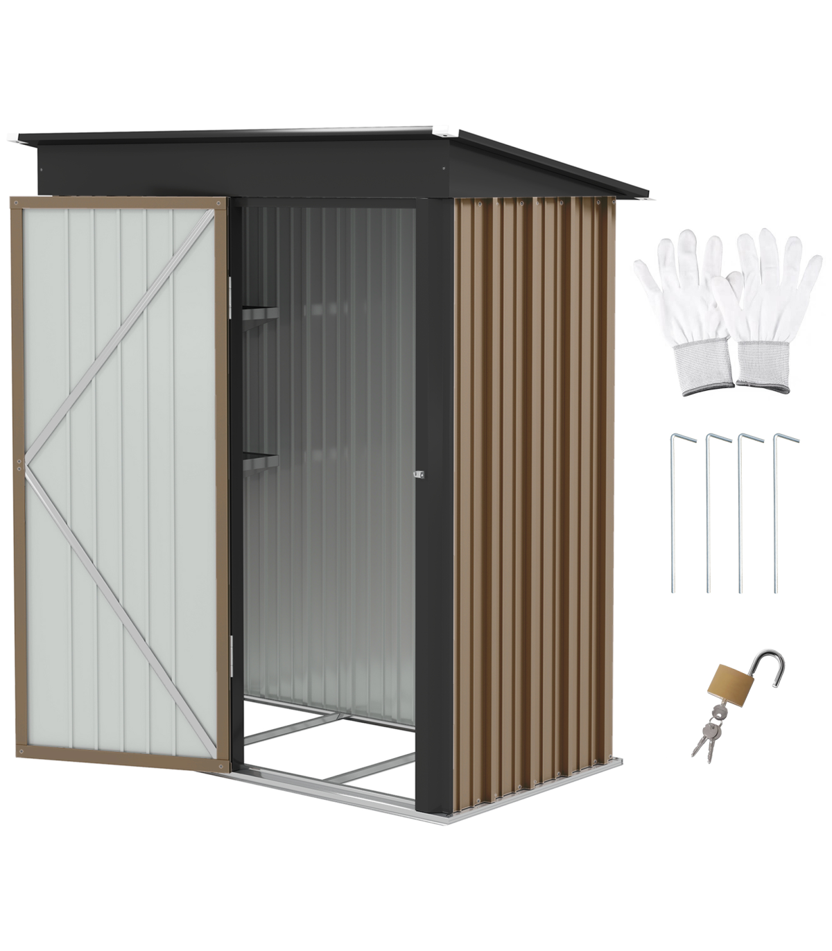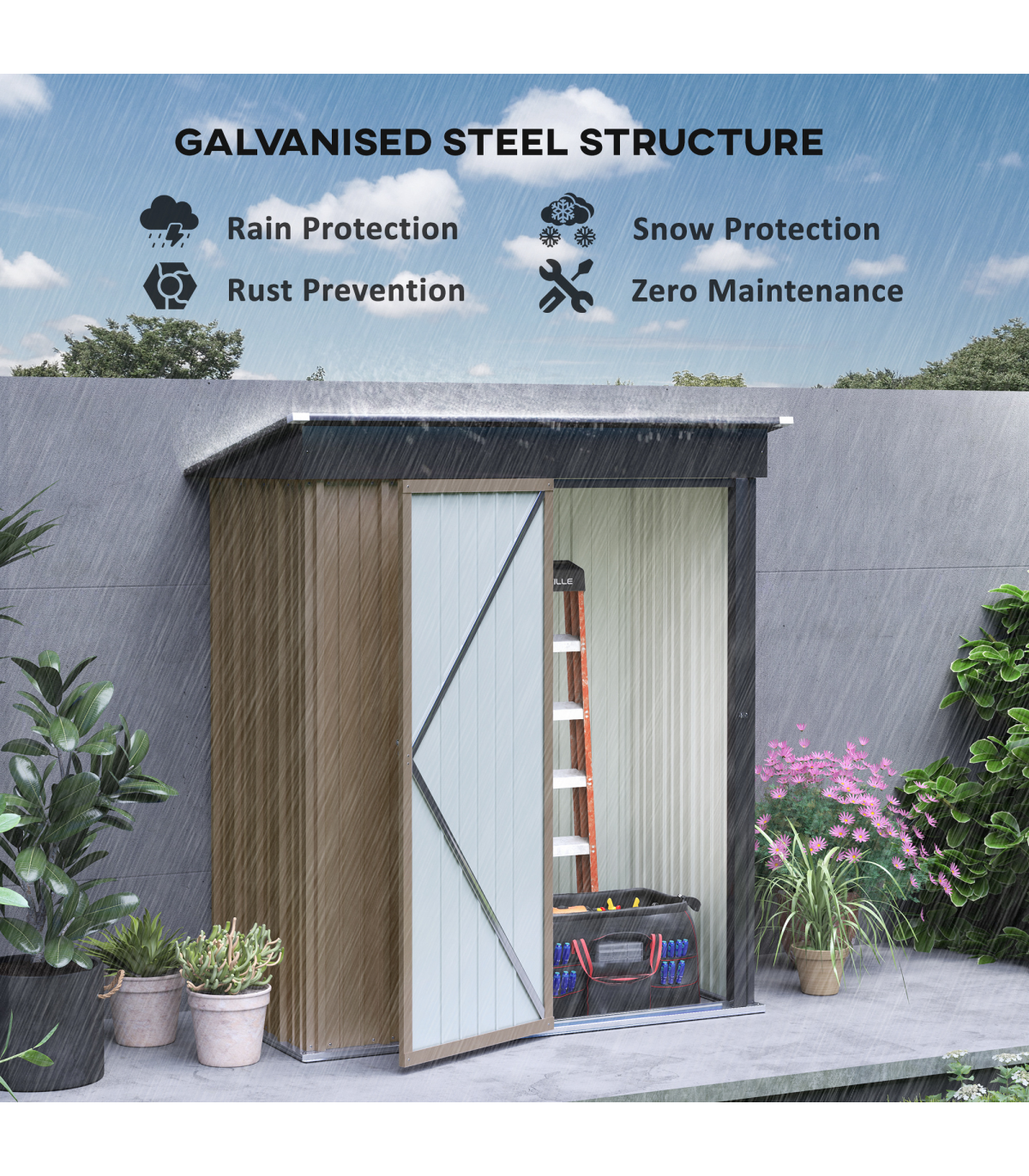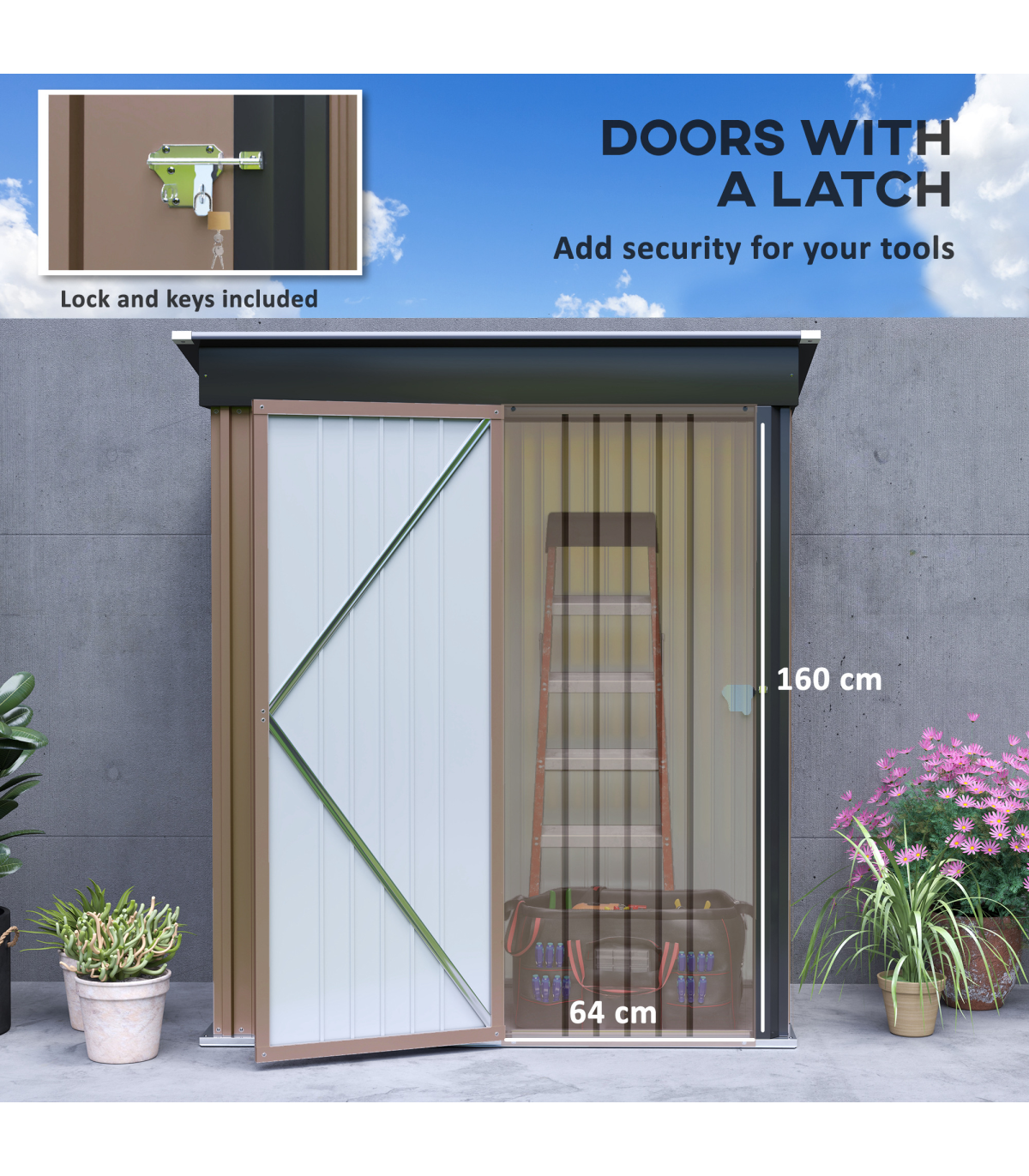 lean-to-design to use against a wall efficiently. A single door for easy access with a secure latch - lock and keys included.