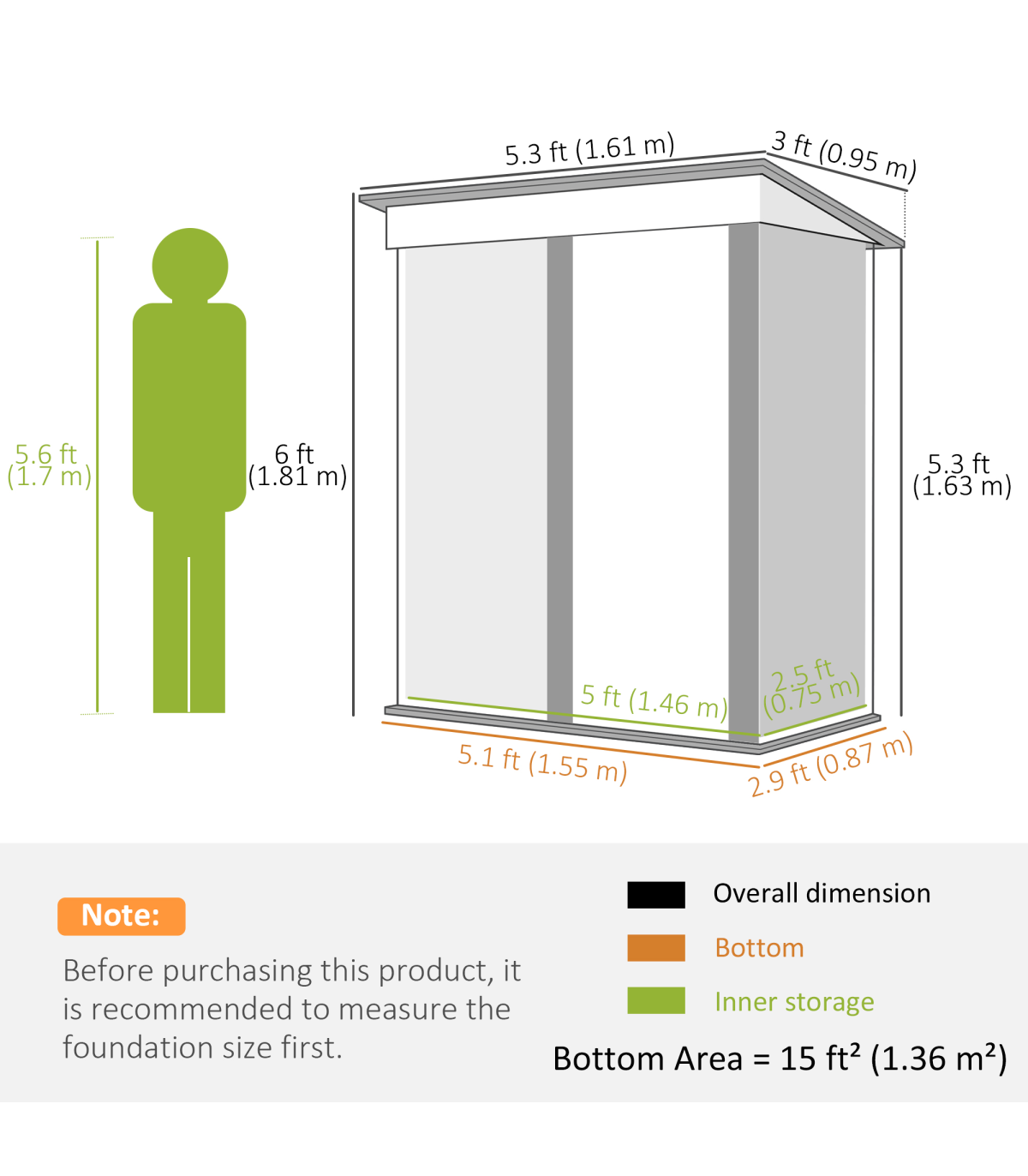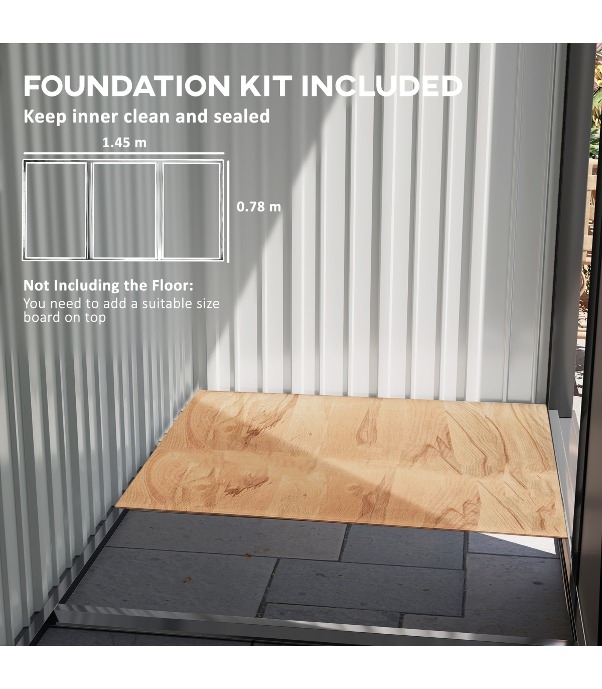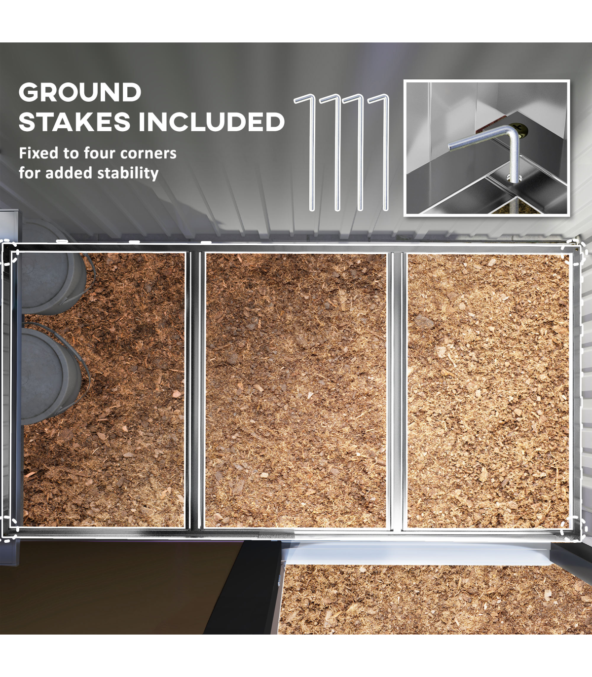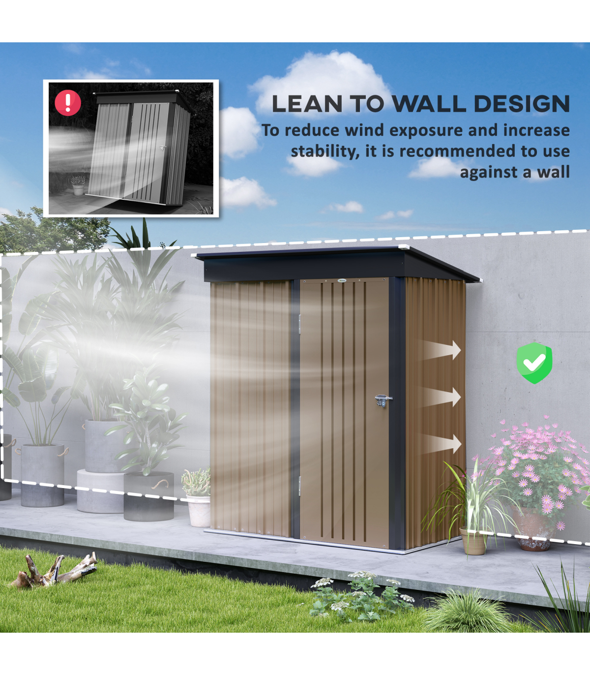 ● Lean-to design saves space and helps it stay stable by using existing structures