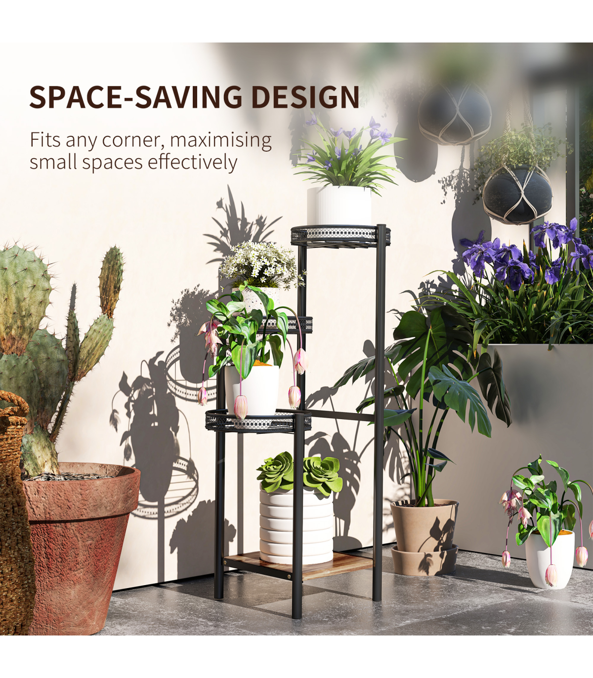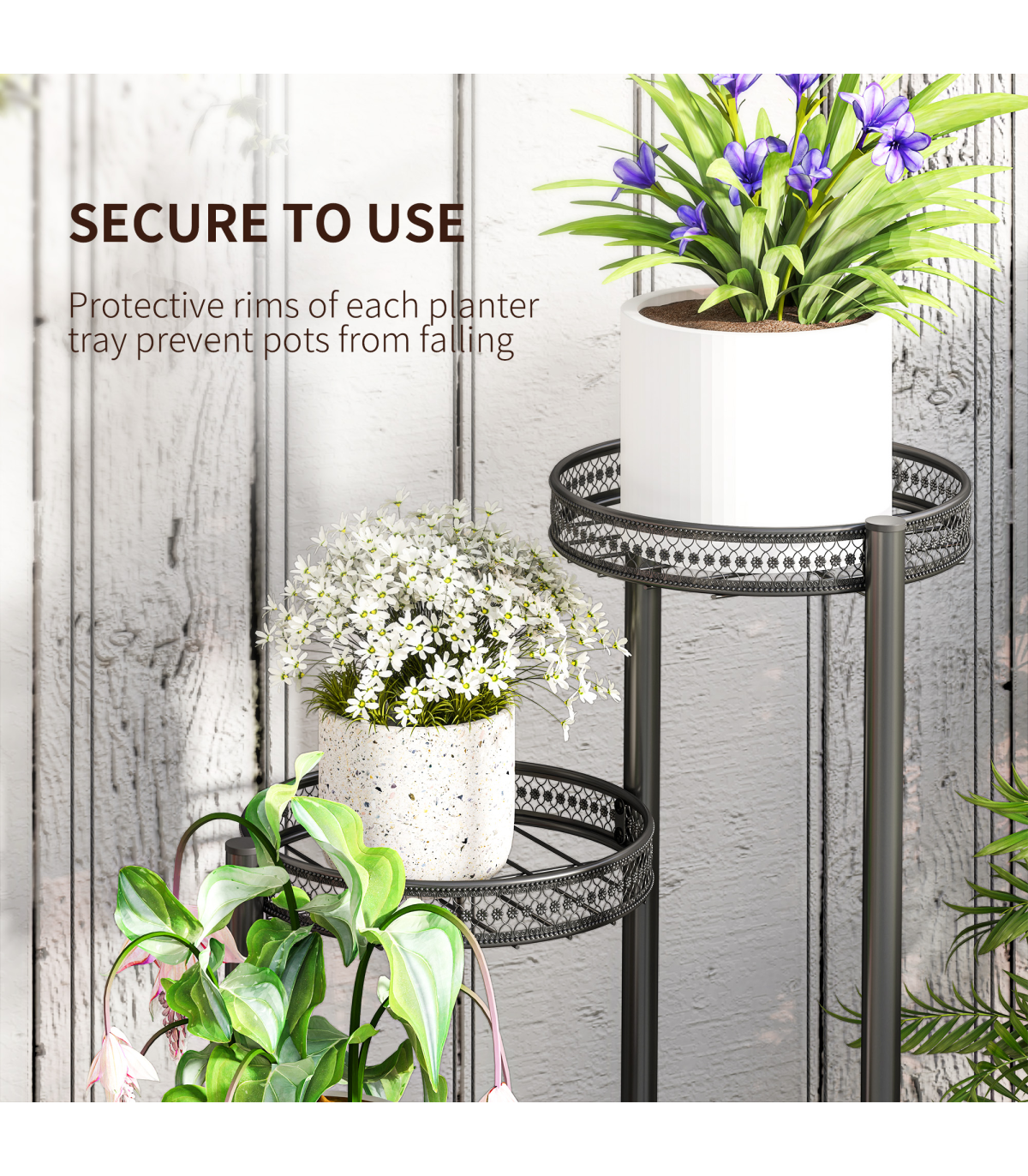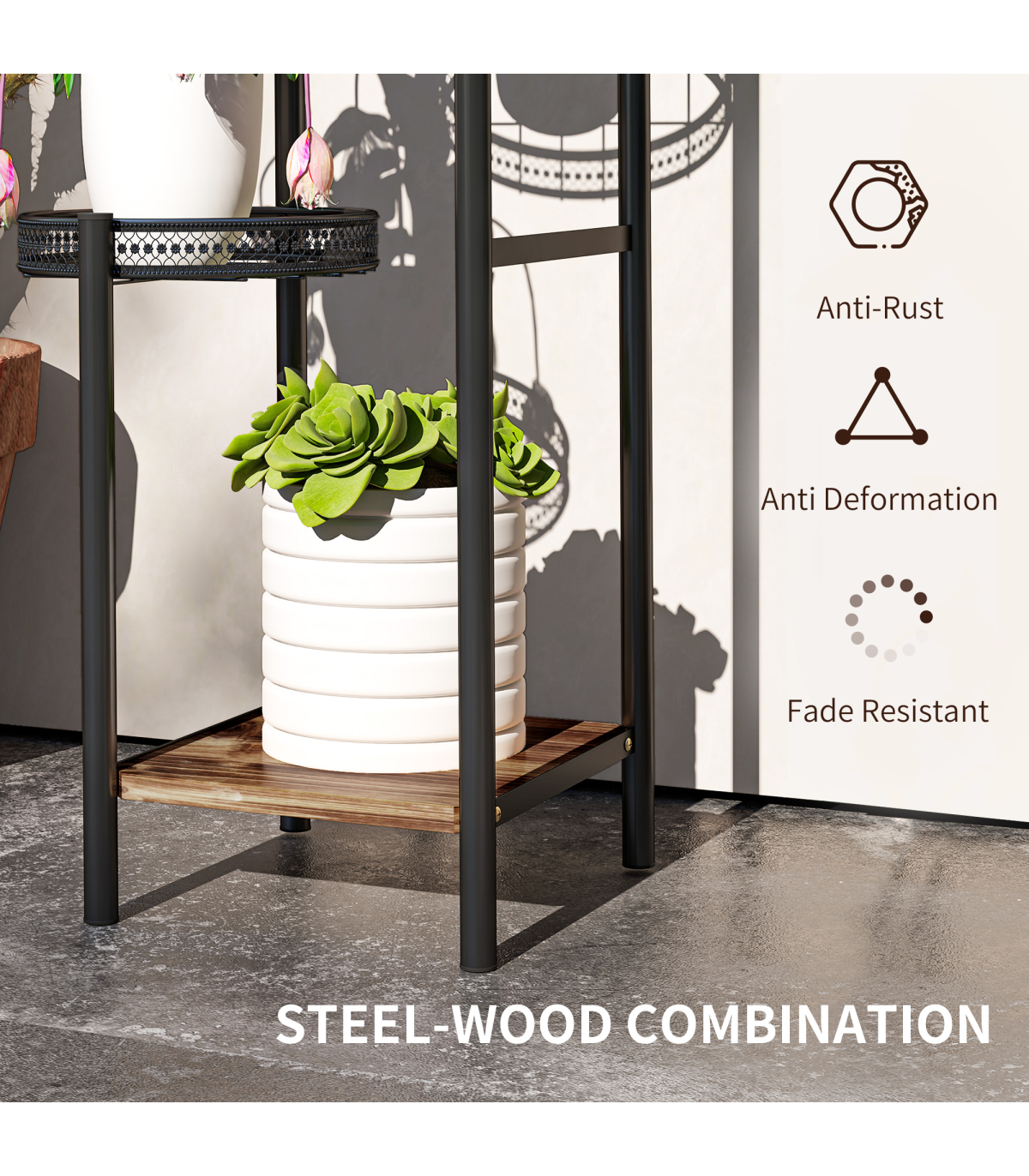 suitable for indoor and outdoor use. Comes with three planter trays - the walls offer securely, finished with a beautiful bottom wood shelf.