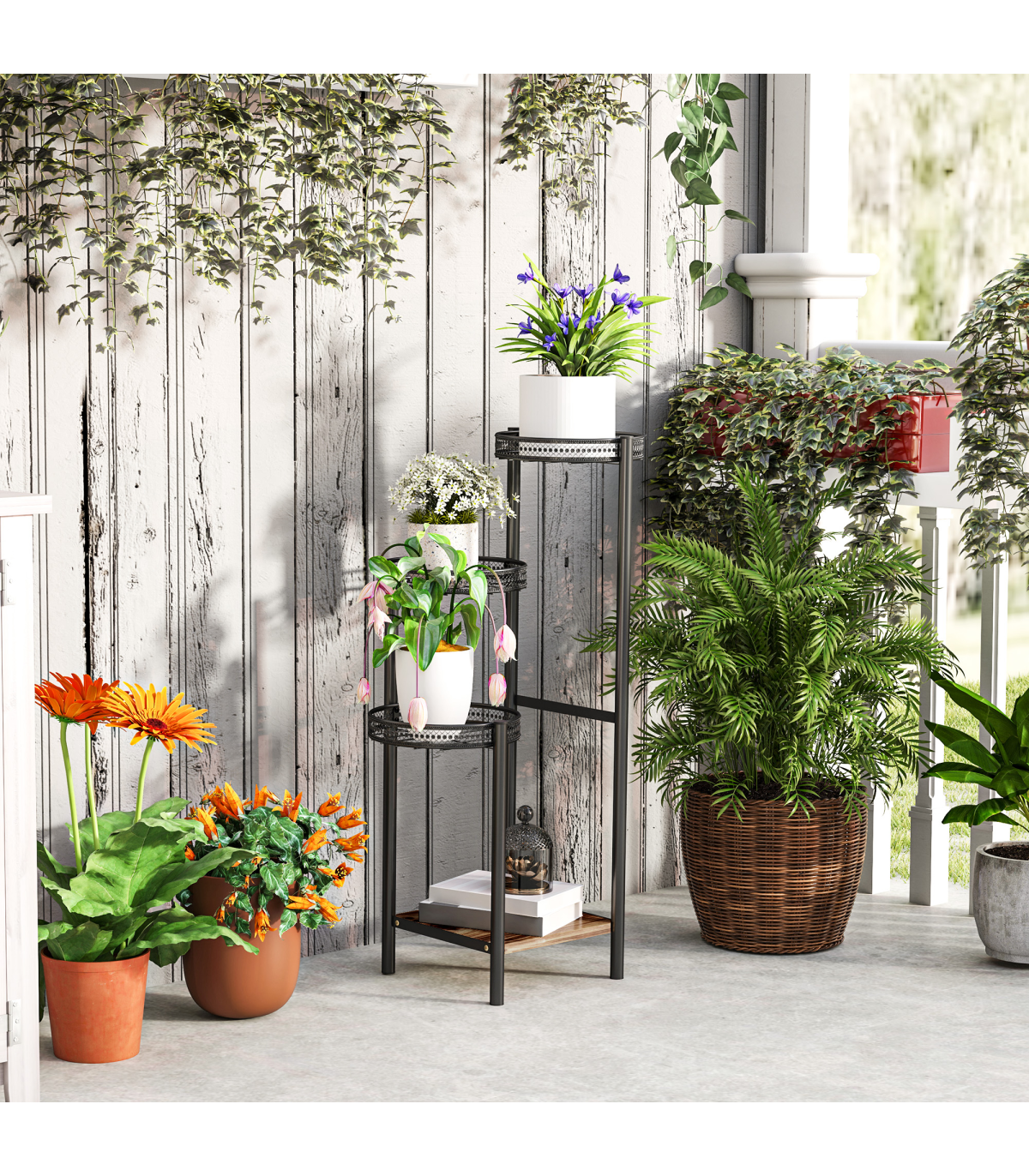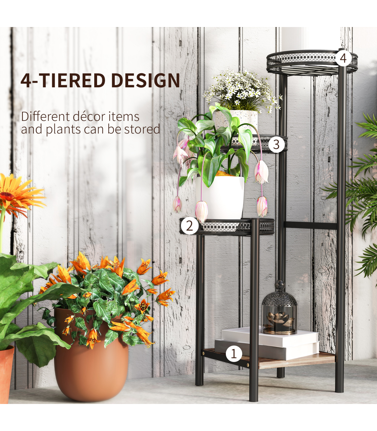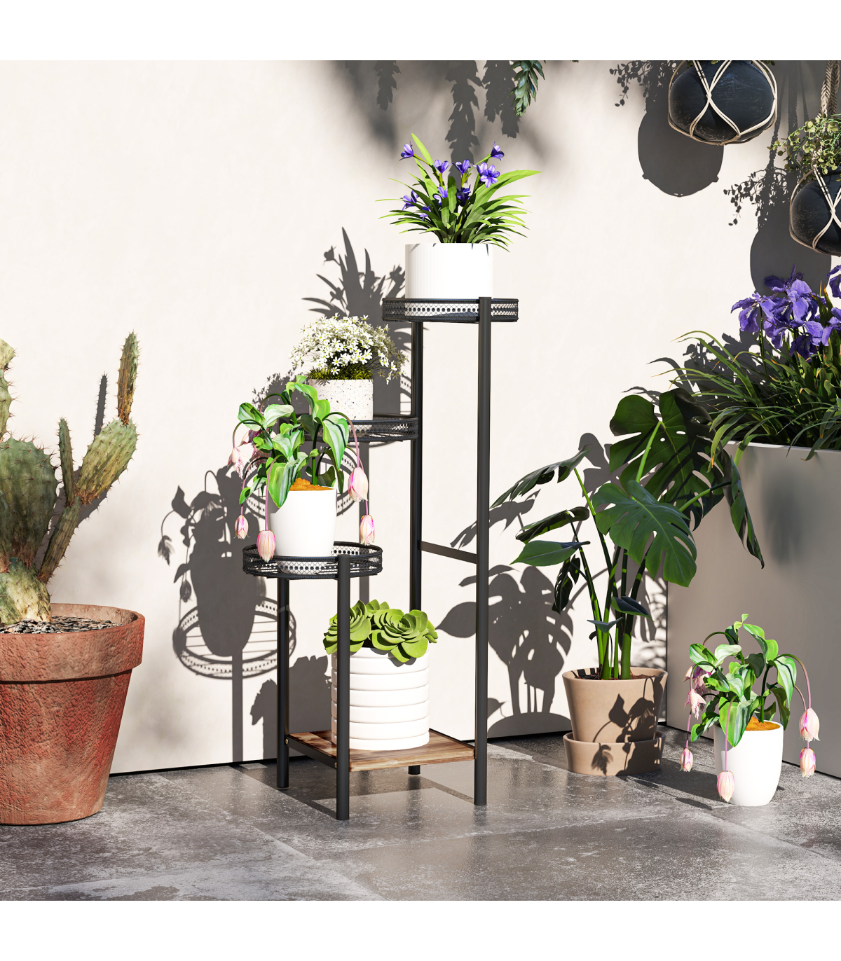 suitable for indoor and outdoor use. Comes with three planter trays - the walls offer securely, finished with a beautiful bottom wood shelf.