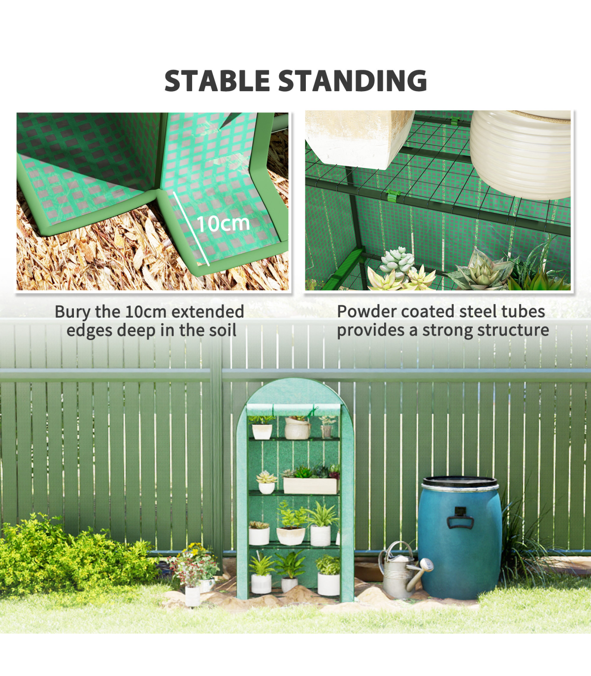 ● Overlong cover to bury into ground for seal and stability