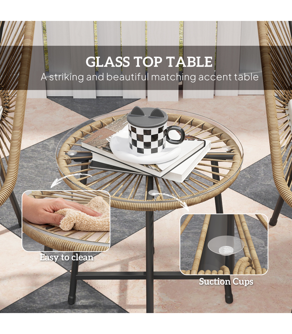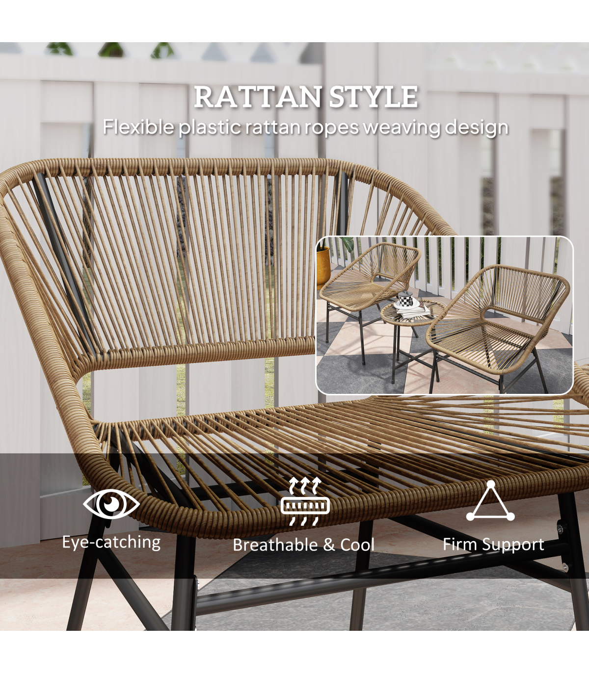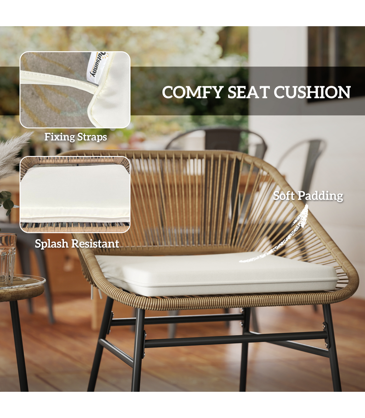 ● Material: Steel, PE Rattan, Polyester, Tempered Glass