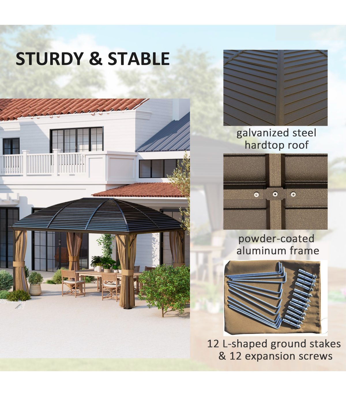 ● 12 L shaped ground stakes and 12 expansion screws included, no bolt included