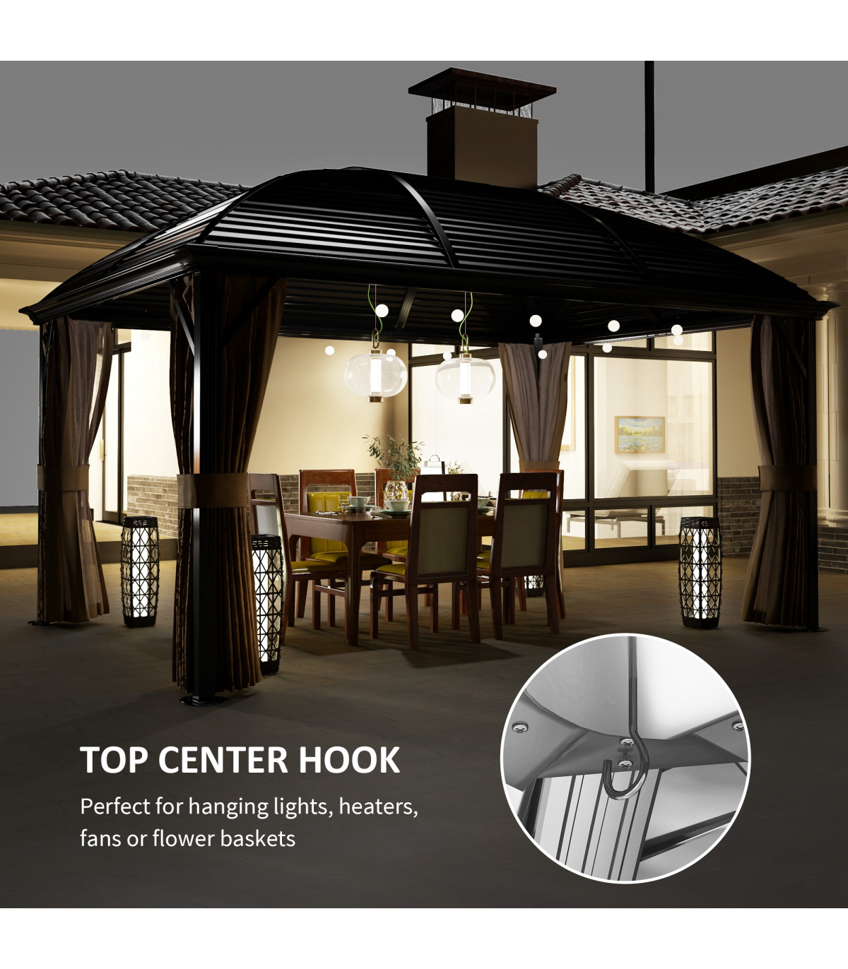 ● Two inner top hanging hooks for a lantern and other lighting
