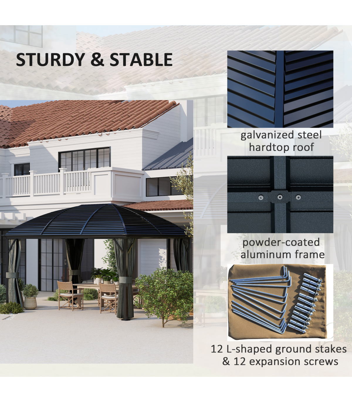 ● 12 L shaped ground stakes and 12 expansion screws included, no bolt included